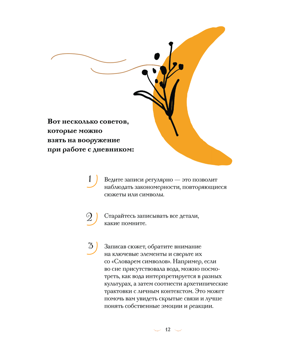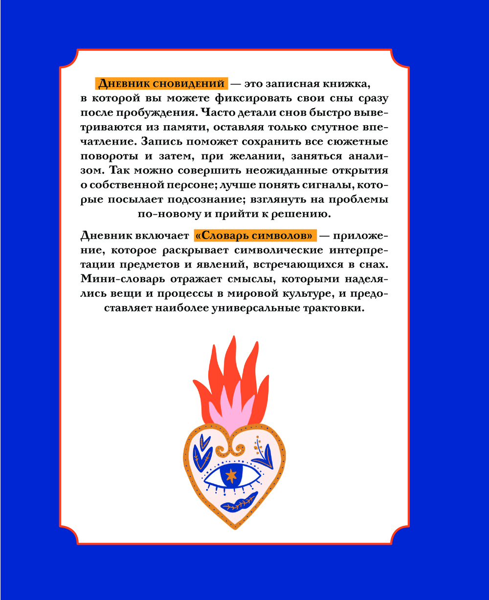 Блокнот включает специальные поля для записи ключевой информации о каждом сновидении: дата, эмоции, символы и сюжет. Такой формат позволяет в любое время вернуться к записям и сопоставить особенности сюжетов, эмоции к схожим символам.