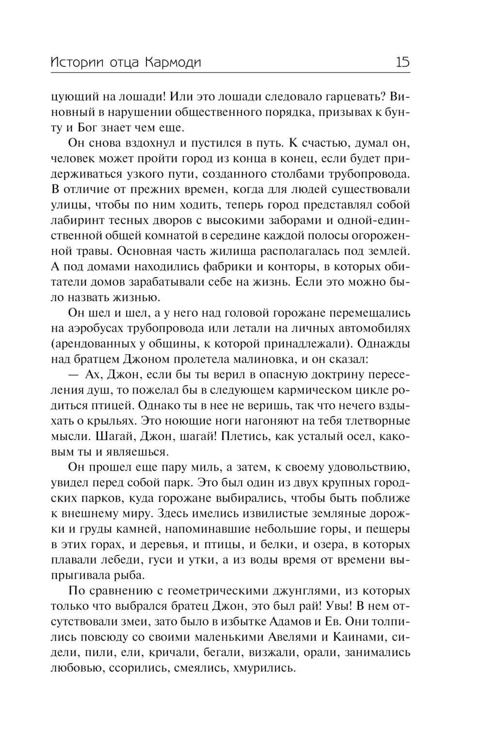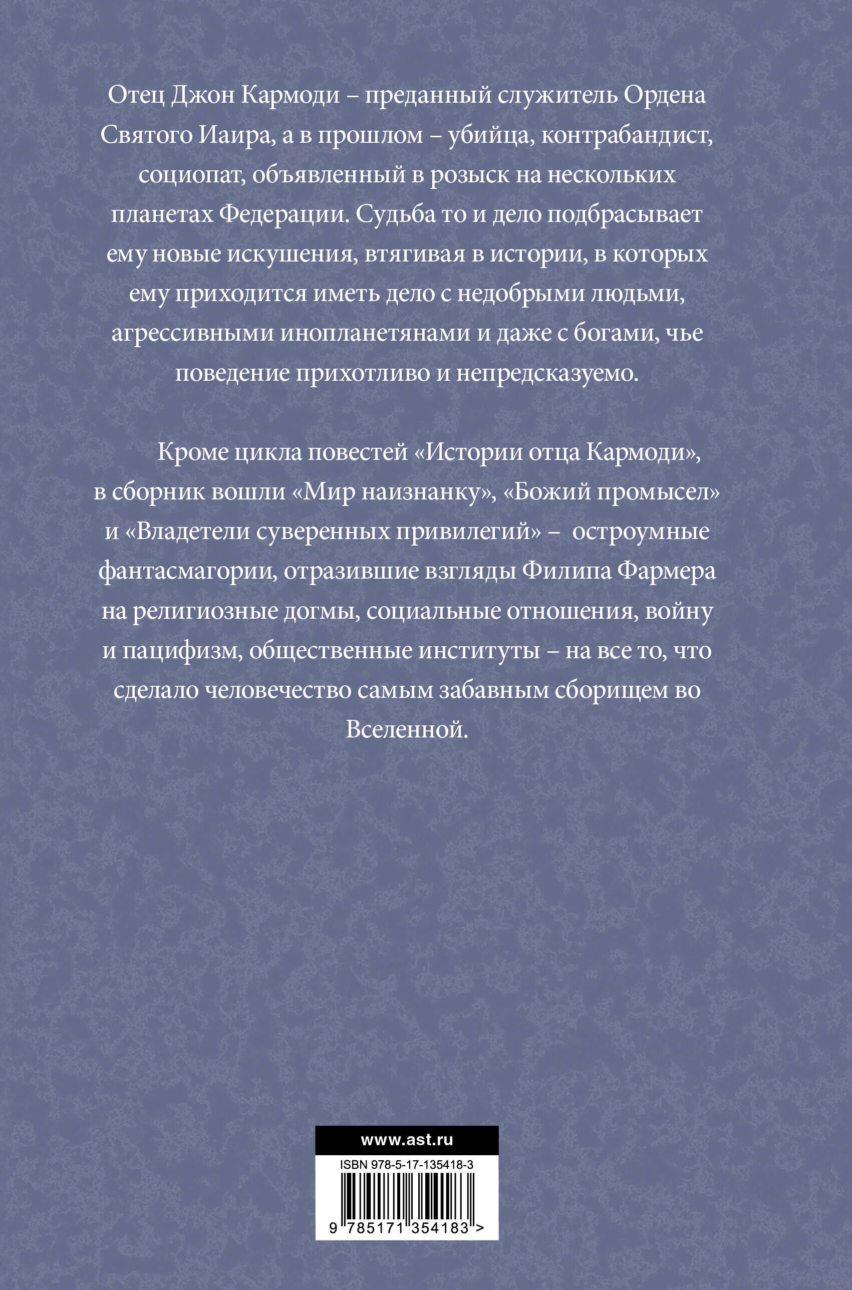 Кроме цикла повестей "Истории отца Кармоди", в сборник вошли "Мир наизнанку", "Божий промысел" и "Владетели суверенных привилегий" – остроумные фантасмагории, отразившие взгляды Филипа Фармера на религиозные догмы, социальные отношения, войну и пацифизм, общественные институты – на все то, что сделало человечество самым забавным сборищем во Вселенной.