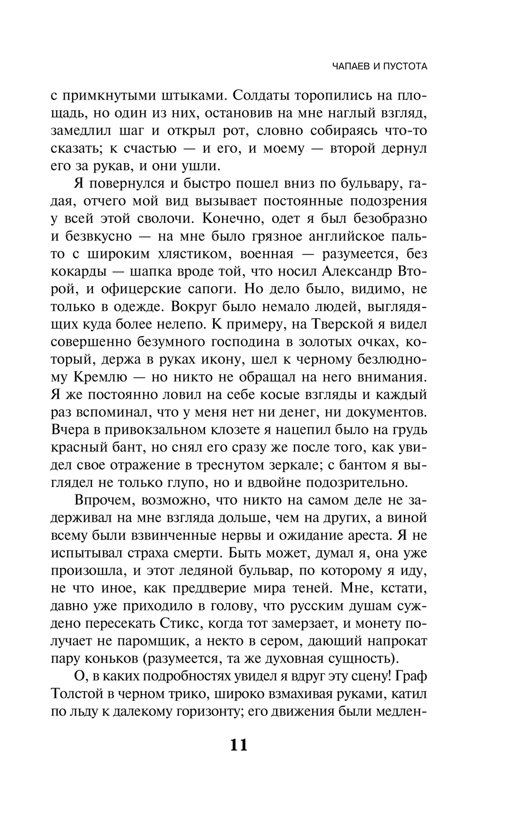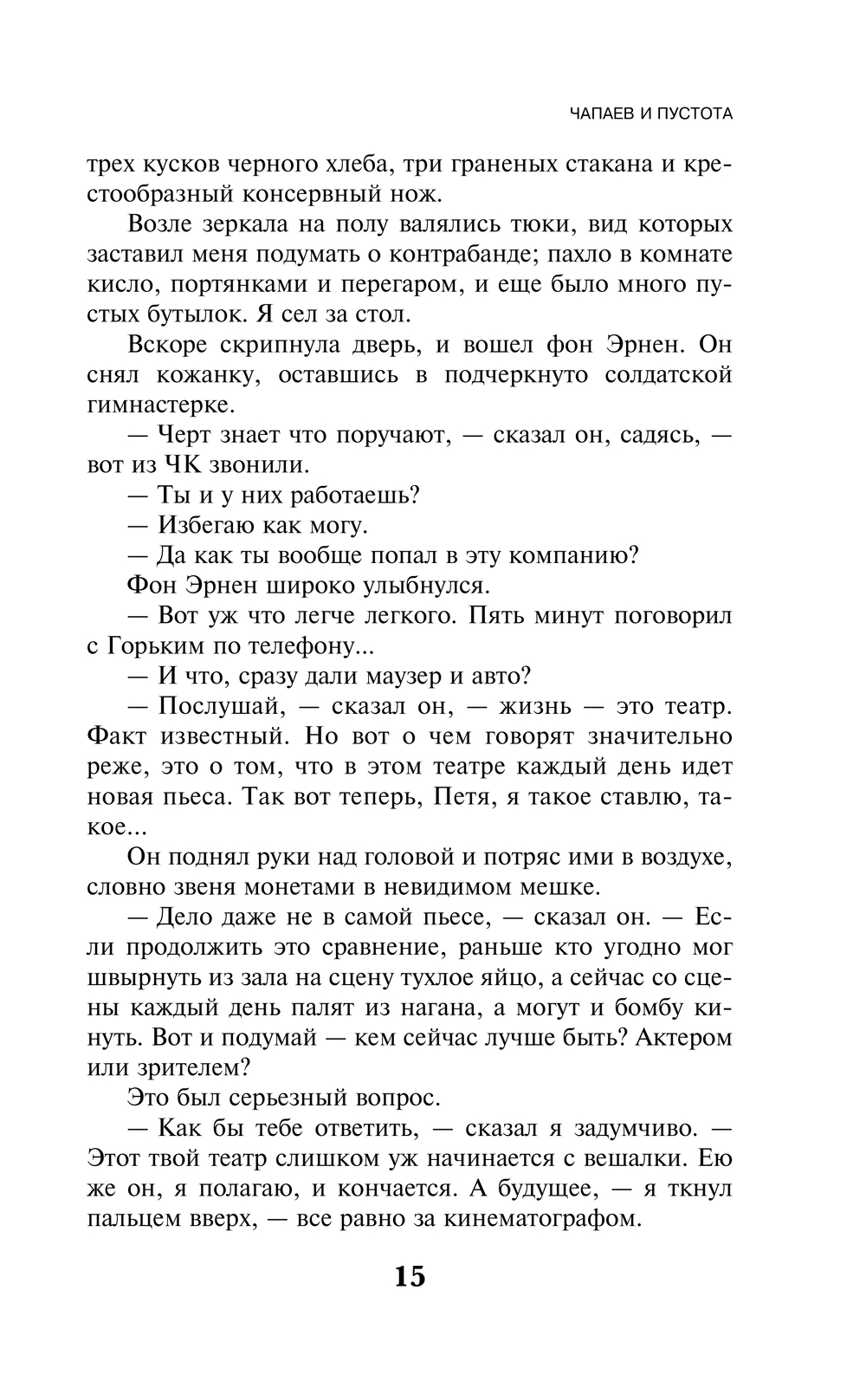 Роман "Чапаев и Пустота" сам автор характеризует так: "Это первое произведение в мировой литературе, действие которого происходит в абсолютной пустоте". На самом деле оно происходит в 1919 году в дивизии Чапаева, в которой главный герой, поэт-декадент Петр Пустота, служит комиссаром. А также в наши дни. А также, как и всегда у Пелевина, в виртуальном пространстве, где с главным героем встречаются Кавабата, Шварценеггер, "просто Мария"…