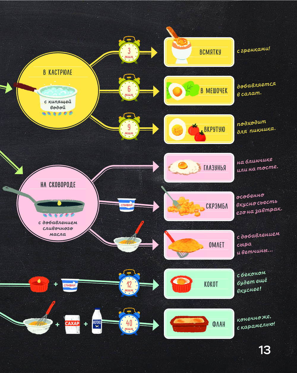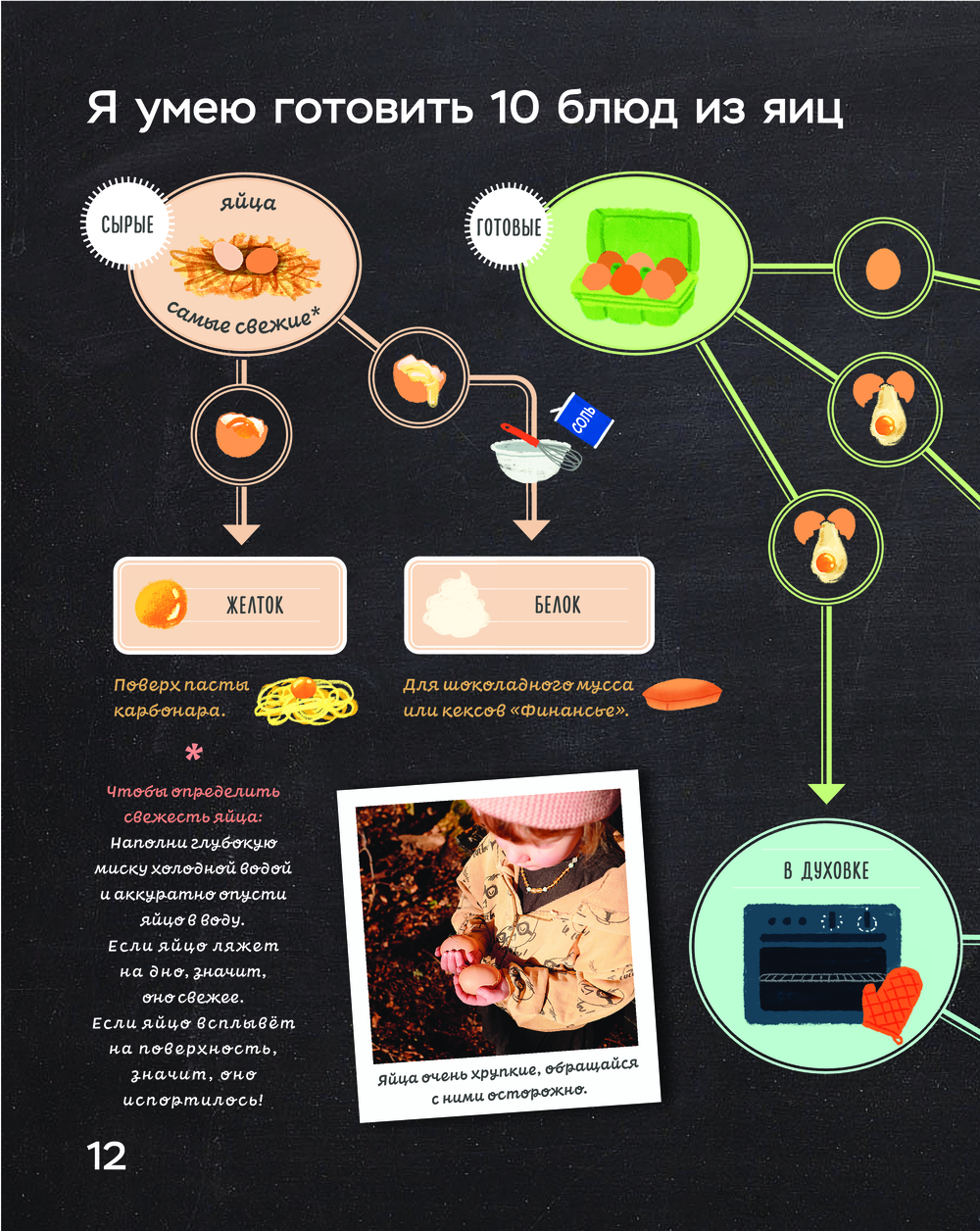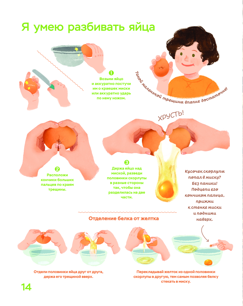 Многие взрослые до сих пор не умеют разбивать яйца. То получится, то половина выльется на стол. С этой книгой вы забудете об этой проблеме раз и навсегда. Как это делать правильно, расписано и показано на рисунках шаг за шагом. И дальше шаг за шагом с минутами и результатом приготовления проиллюстрировано, как варить яйца всмятку, в мешочек, вкрутую, как жарить омлет и скрэмбл, делать яйца "Мимоза" и такое загадочное блюдо, как флан. И подобным образом описаны этапы приготовления овощей, основных блюд, пасты и риса, фруктов и десертов, завтраков и съедобных сюрпризов. Основы, а следом – рецепты.