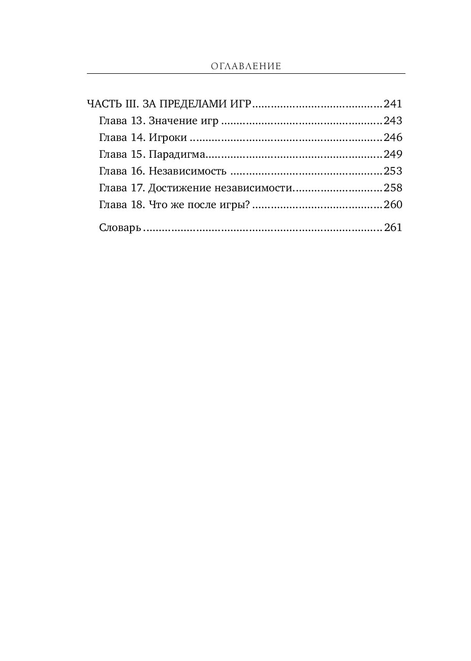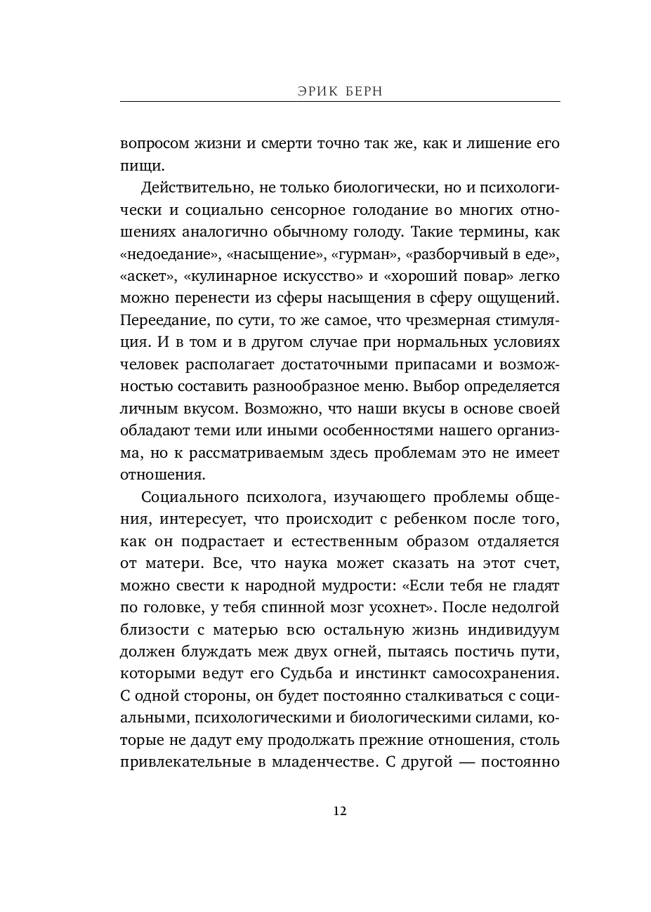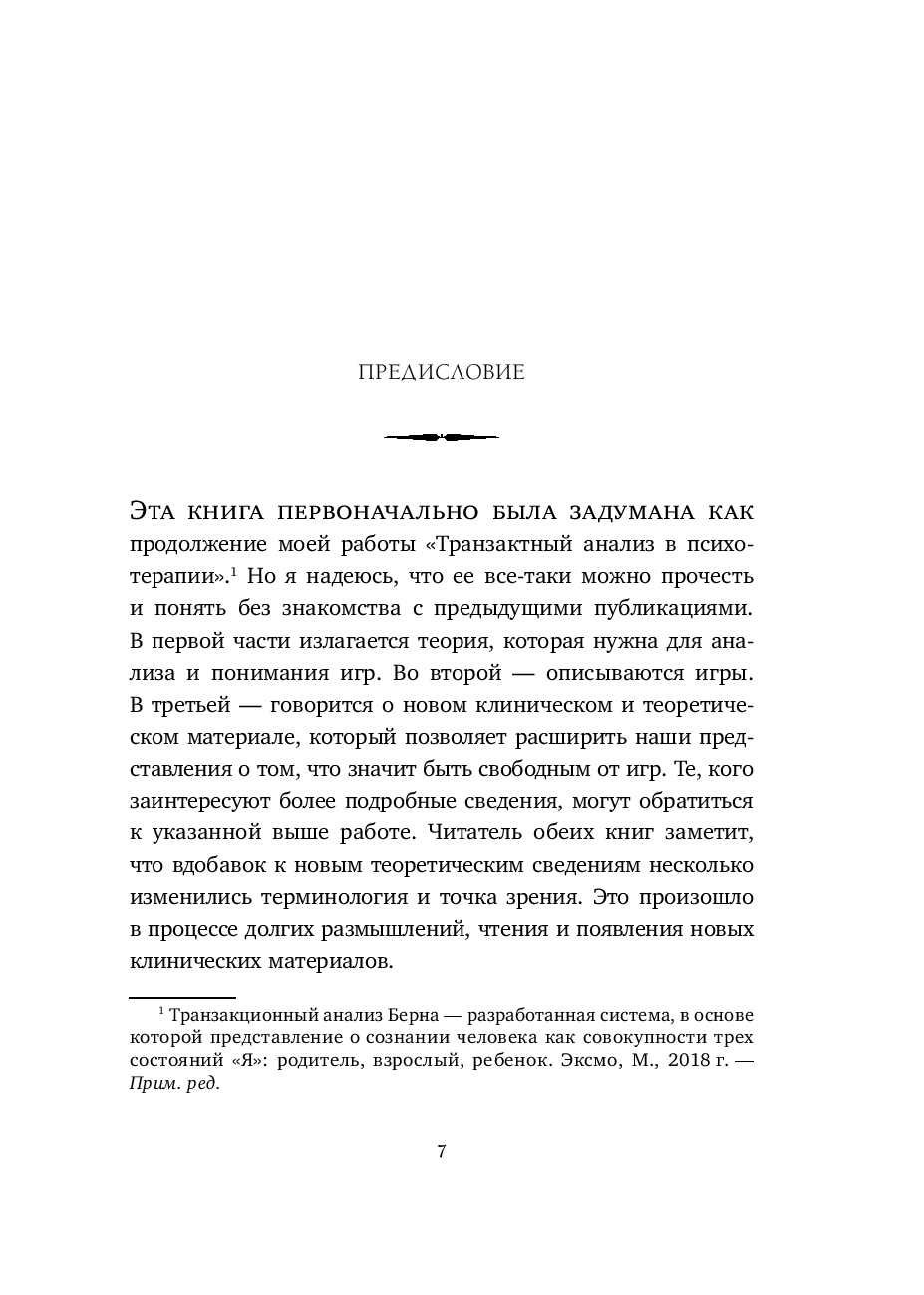 Перед вами одна из культовых книг по психологии человеческих взаимоотношений. Эрик Берн разработал систему, способную избавить человека от влияния жизненных сценариев, программирующих его поведение, научить его меньше играть в отношениях с собой и другими, обрести подлинную свободу и побудить к личностному росту. В этой книге вы найдете много полезных советов, которые помогут понять природу человеческого общения, мотивы собственных и чужих поступков и причины возникновения конфликтов. По мнению автора, судьба каждого из нас во многом определяется еще в раннем детстве, однако в зрелом возрасте можно научиться управлять ею, если этого захотеть. Именно с публикации этого международного бестселлера после падения железного занавеса в нашей стране начался психологический бум, когда миллионы людей осознали, что с помощью психологии можно многое понять в себе и окружающих.