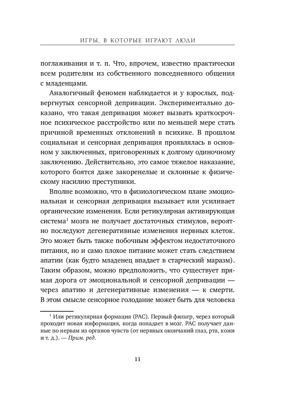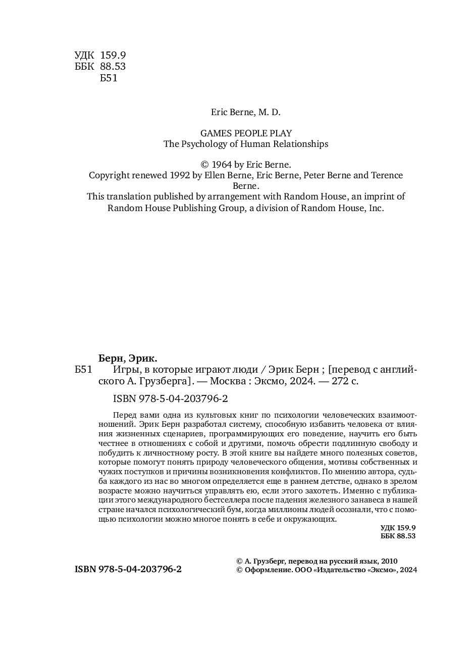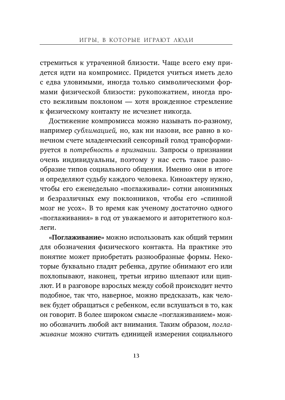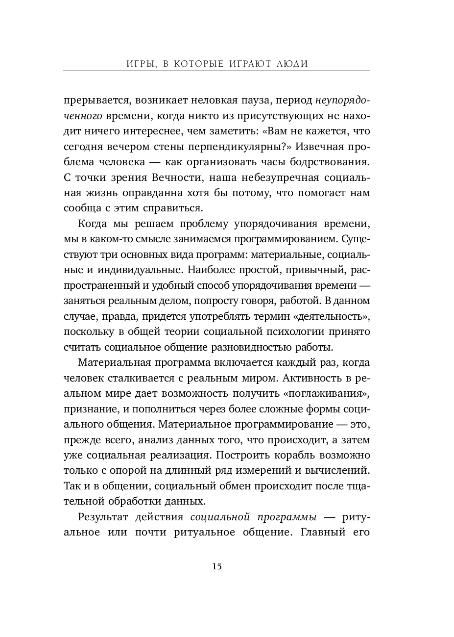 Перед вами одна из культовых книг по психологии человеческих взаимоотношений. Эрик Берн разработал систему, способную избавить человека от влияния жизненных сценариев, программирующих его поведение, научить его меньше играть в отношениях с собой и другими, обрести подлинную свободу и побудить к личностному росту. В этой книге вы найдете много полезных советов, которые помогут понять природу человеческого общения, мотивы собственных и чужих поступков и причины возникновения конфликтов. По мнению автора, судьба каждого из нас во многом определяется еще в раннем детстве, однако в зрелом возрасте можно научиться управлять ею, если этого захотеть. Именно с публикации этого международного бестселлера после падения железного занавеса в нашей стране начался психологический бум, когда миллионы людей осознали, что с помощью психологии можно многое понять в себе и окружающих.