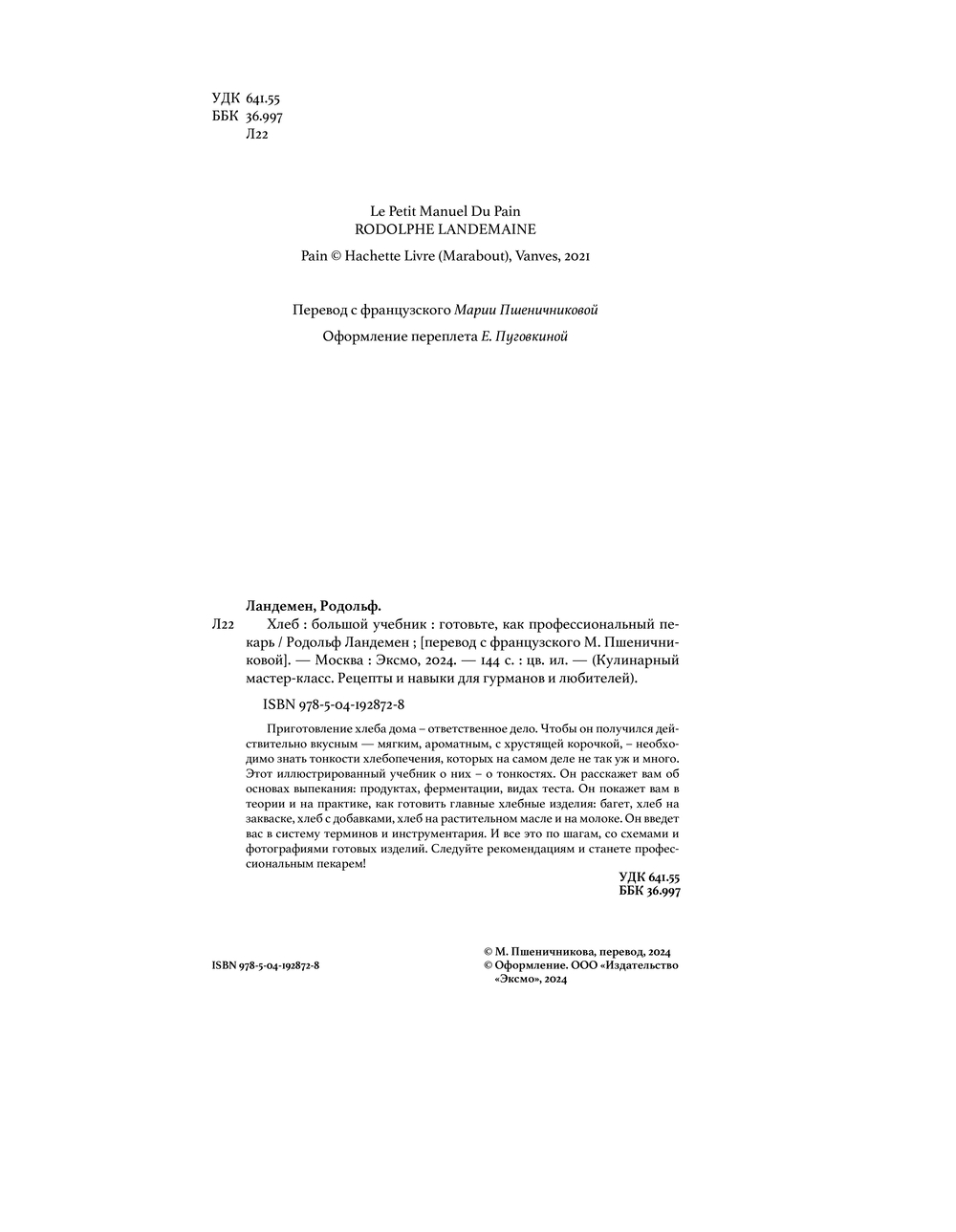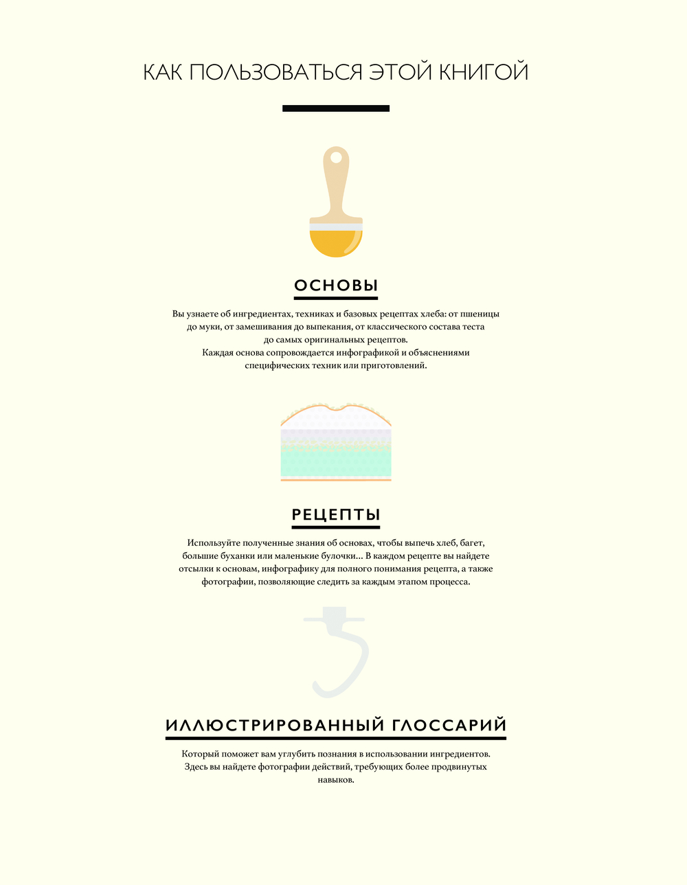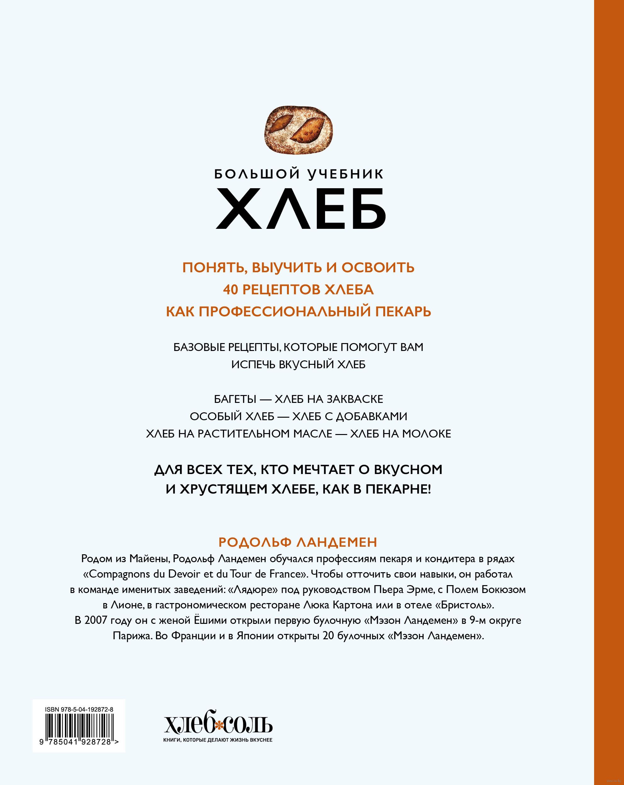 Из нее вы сначала узнаете об основах хлебопечения: ингредиентах, техниках и базовых рецептах хлеба: от пшеницы до муки, от замешивания до выпекания, от классического состава теста до самых оригинальных рецептов. Каждая основа сопровождается инфографикой и объяснениями специфических техник или приготовлений. Далее вы используете полученные знания об основах, чтобы выпечь хлеб, багет, большие буханки или маленькие булочки. В каждом рецепте вы найдете отсылки к основам, инфографику для полного понимания рецепта, а также фотографии, позволяющие следить за каждым этапом процесса. Иллюстрированный глоссарий в конце книги поможет вам углубить познания в использовании ингредиентов.