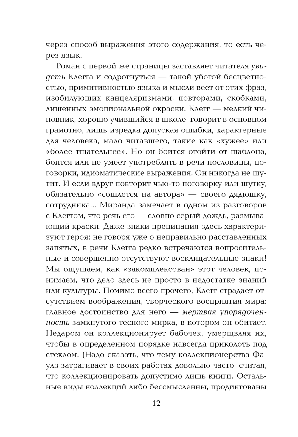 Фаулз ведет повествование от лица похитителя и жертвы, играя с чувствами читателей. Он сталкивает Добро и Зло, прекрасное и ничтожное, возвышенное и низменное. Что победит, а что останется в вечности?