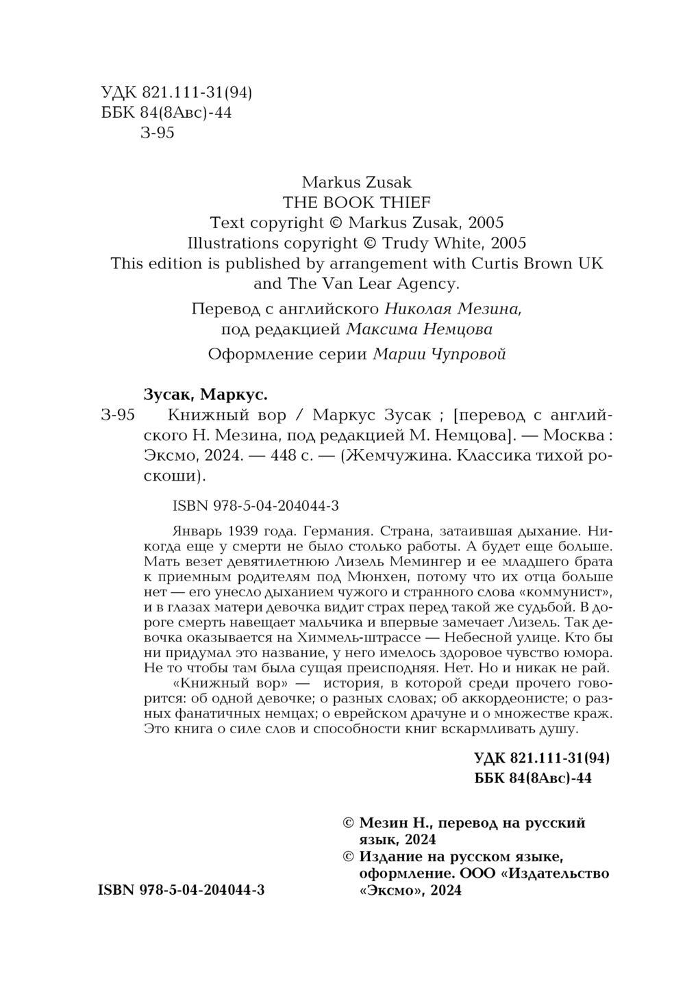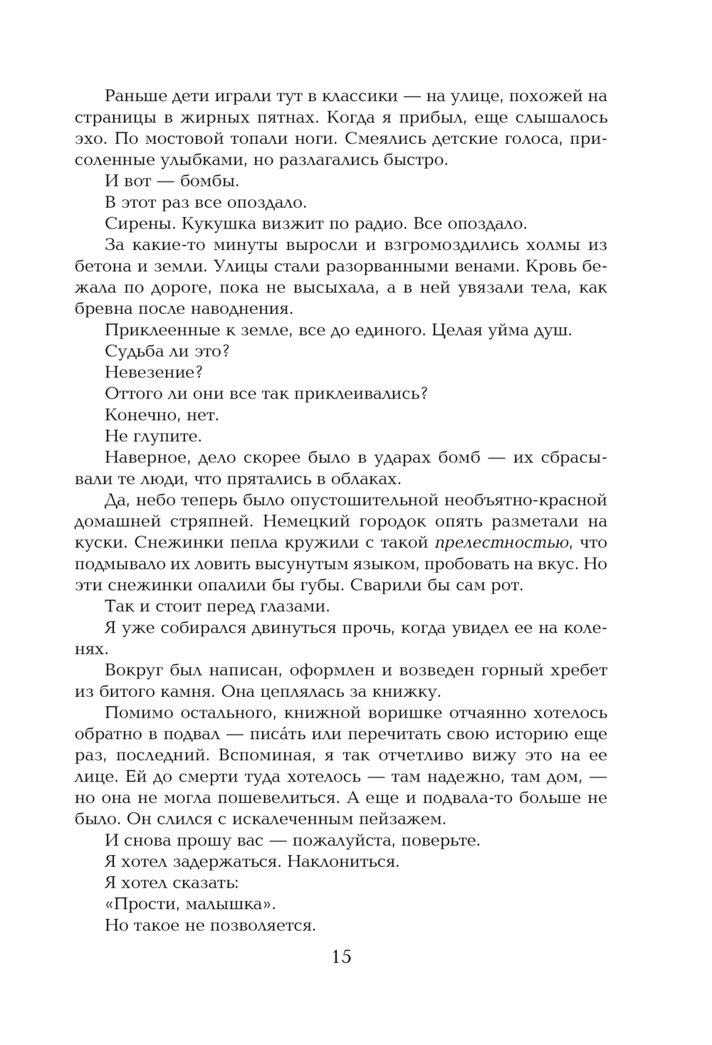Январь 1939 года. Германия. Страна, затаившая дыхание. Никогда еще у смерти не было столько работы. А будет еще больше. Мать везет девятилетнюю Лизель Мемингер и ее младшего брата к приемным родителям под Мюнхен, потому что их отца больше нет – его унесло дыханием чужого и странного слова "коммунист", и в глазах матери девочка видит страх перед такой же судьбой. В дороге смерть навещает мальчика и впервые замечает Лизель. Так девочка оказывается на Химмель-штрассе – Небесной улице. Кто бы ни придумал это название, у него имелось здоровое чувство юмора. Не то чтобы там была сущая преисподняя. Нет. Но и никак не рай.