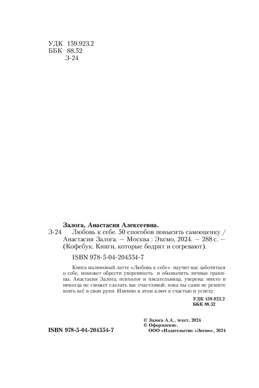 Книга малиновый латте "Любовь к себе" научит вас заботиться о себе, поможет обрести уверенность и обозначать личные границы. Анастасия Залога, психолог и писательница, уверена: никто и никогда не сможет сделать вас счастливой, пока вы сами не решите взять всё в свои руки. Именно в этом ключ к счастью и успеху.