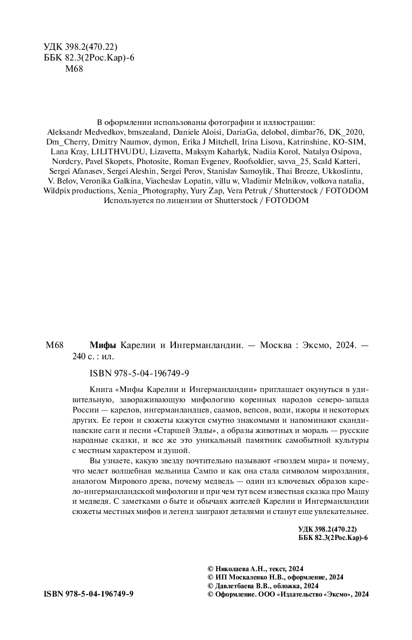 Книга "Мифы Карелии и Ингерманландии" приглашает окунуться в удивительную, завораживающую мифологию коренных народов северо-запада России – карелов, ингерманландцев, саамов, вепсов, води, ижоры и некоторых других. Ее герои и сюжеты кажутся смутно знакомыми и напоминают скандинавские саги и песни "Старшей Эдды", а образы животных и мораль – русские народные сказки, и все же это уникальный памятник самобытной культуры с местным характером и душой.