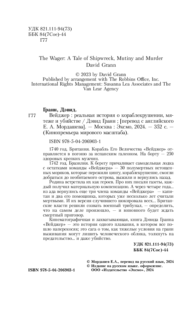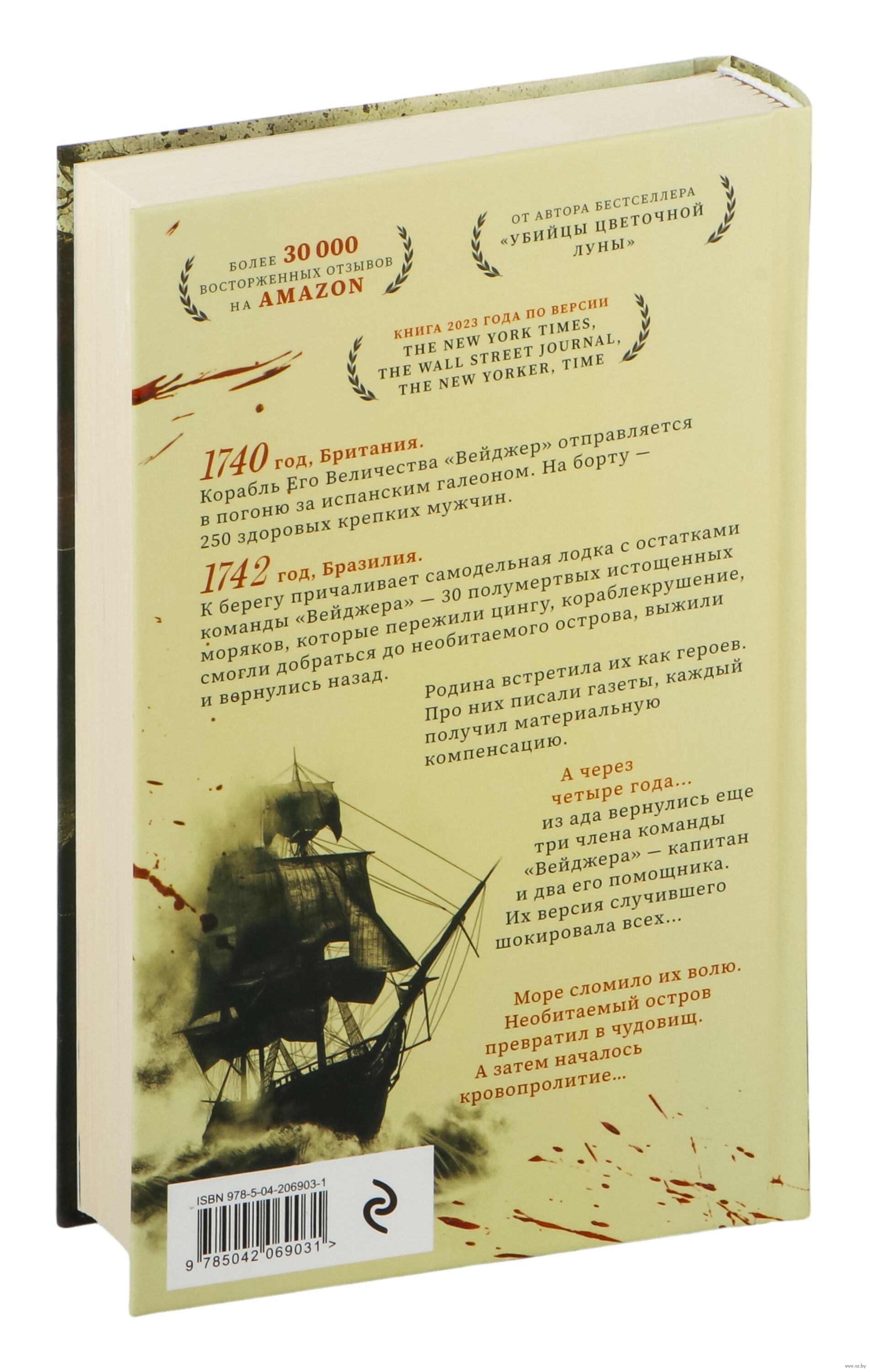 Кинематографичная и захватывающая, книга Дэвида Гранна "Вейджер" – это история одного плавания, в котором все пошло наперекосяк; это сага о том, как тяжелые условия на грани выживания могут лишить человеческого облика, толкнуть на предательство... и даже убийство.