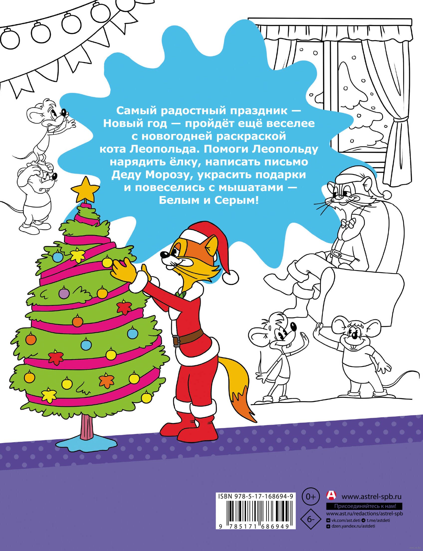 Самый радостный праздник – Новый год – пройдёт ещё веселее с новогодней раскраской кота Леопольда. Помоги Леопольду нарядить ёлку, написать письмо Деду Морозу, украсить подарки и повеселись с мышатами – Белым и Серым! Используй яркие цвета, фантазию и не забудь про хорошее настроение!