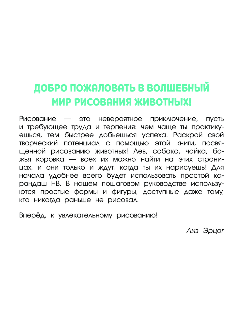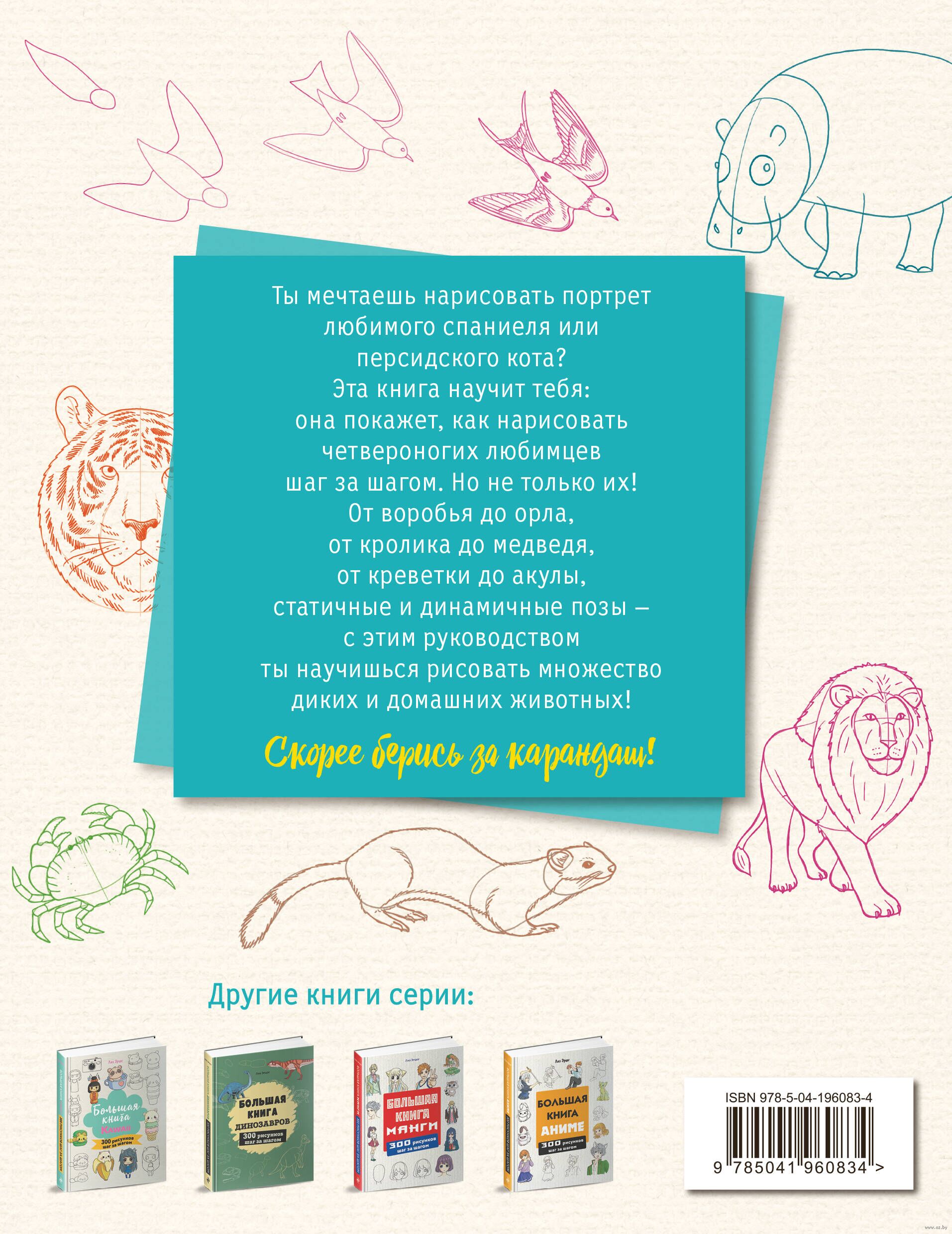 Ты мечтаешь нарисовать портрет любимого спаниеля или персидского кота? Эта книга научит тебя: она покажет, как нарисовать четвероногих любимцев шаг за шагом. Но не только их! От воробья до орла, от кролика до медведя, от креветки до акулы, статичные и динамичные позы, – с этим руководством ты научишься рисовать множество диких и домашних животных!