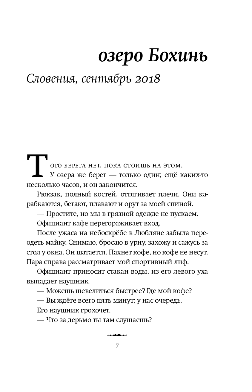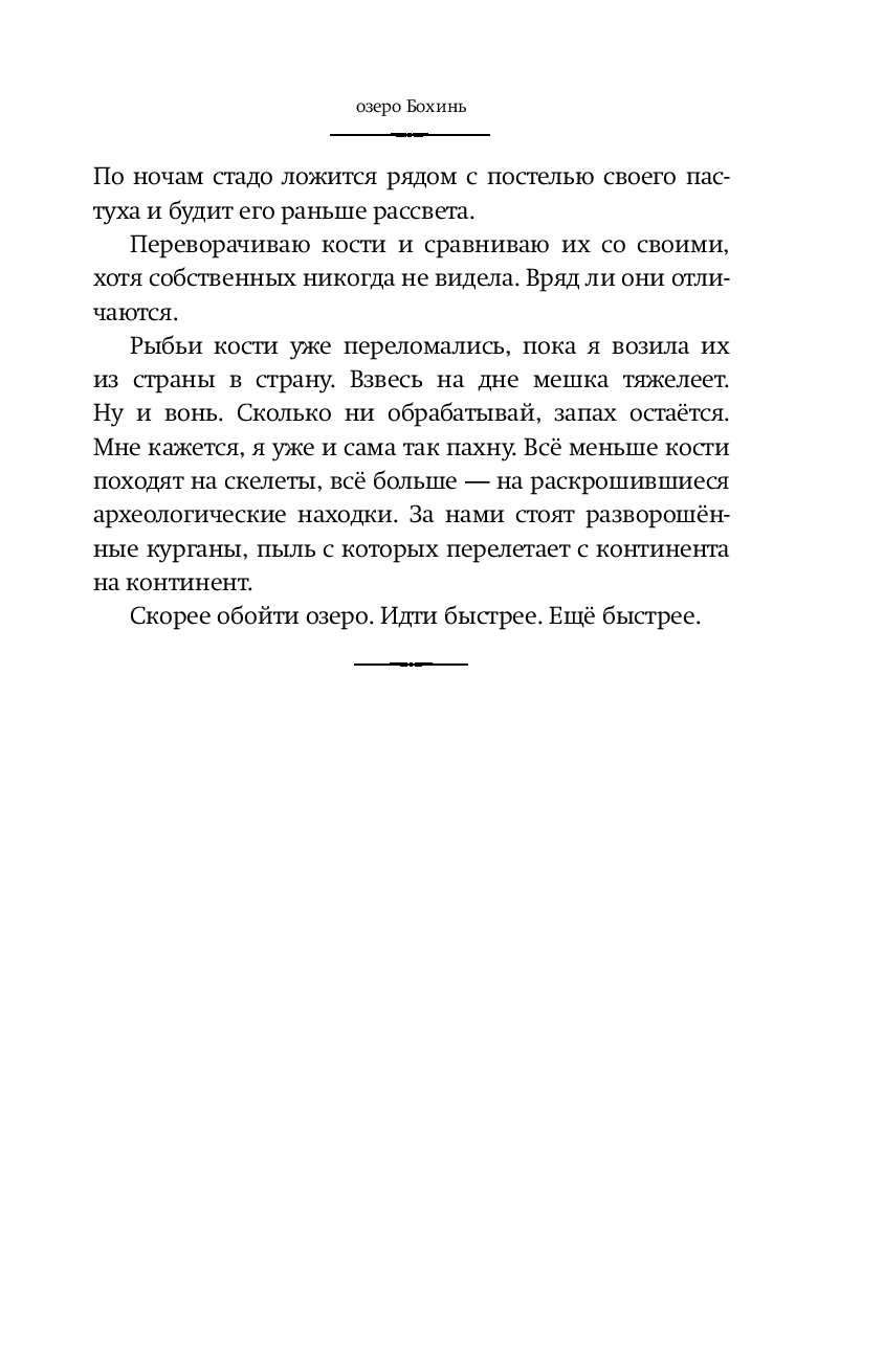В очередной попытке совершить ритуал и отдать кости воде – на озере Бохинь в Словении – Кира, обходя озеро по кругу, распутывает последствия детской травмы, продолжает спорить с отцом, чью смерть она так и не смогла принять, переосмысляет события своей прошлой жизни и идёт по следам своего рода, выросшего на Волге.