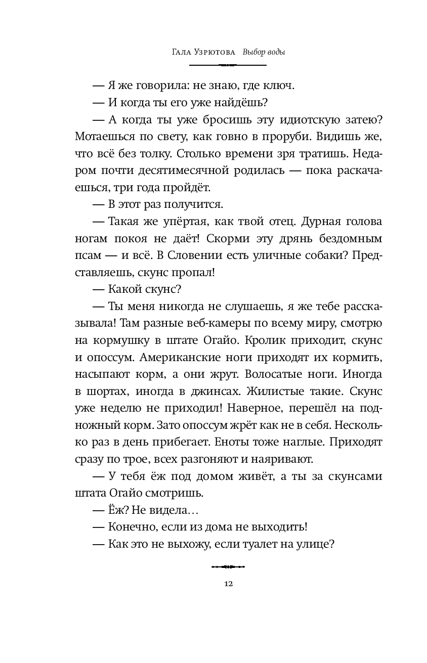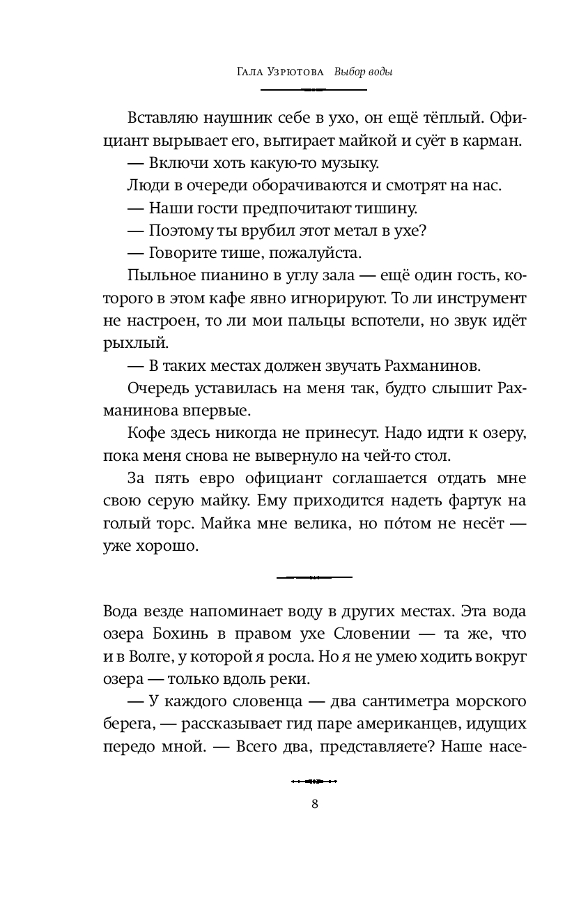 Героиня романа "Выбор воды" Кира – из поколения 35-летних эскапистов, убегающих от прошлого, от реальности и от самих себя, и путешествующих из страны в страну – лишь бы не возвращаться домой.