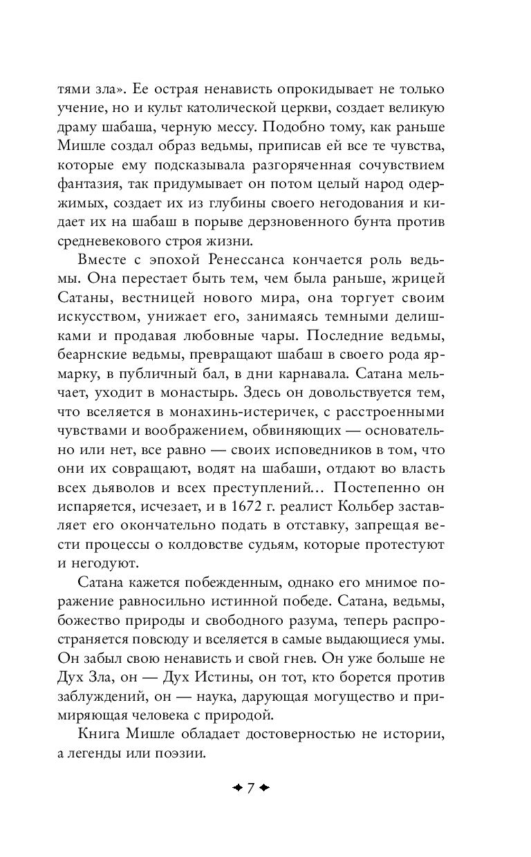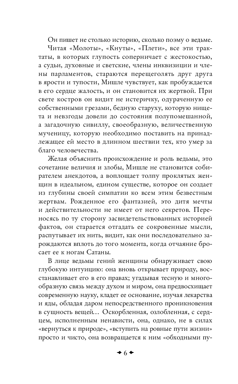 Жюль Мишле создал не только фундаментальные труды по истории Франции. Он увлекался философией, психологией, естественными науками и воплотил свои знания в книгах о природе, религии, отношениях между людьми, отличающихся своей оригинальностью. Мишле затронул в своих произведениях и суть женской природы – синтез божественного и греховного. Его восторженные и откровенные произведения о любви и браке – "Любовь" и "Женщина" – снискали большую популярность современников. "Ведьма" – увлекательное исследование о роли и месте женщины в эпоху Средневековья.