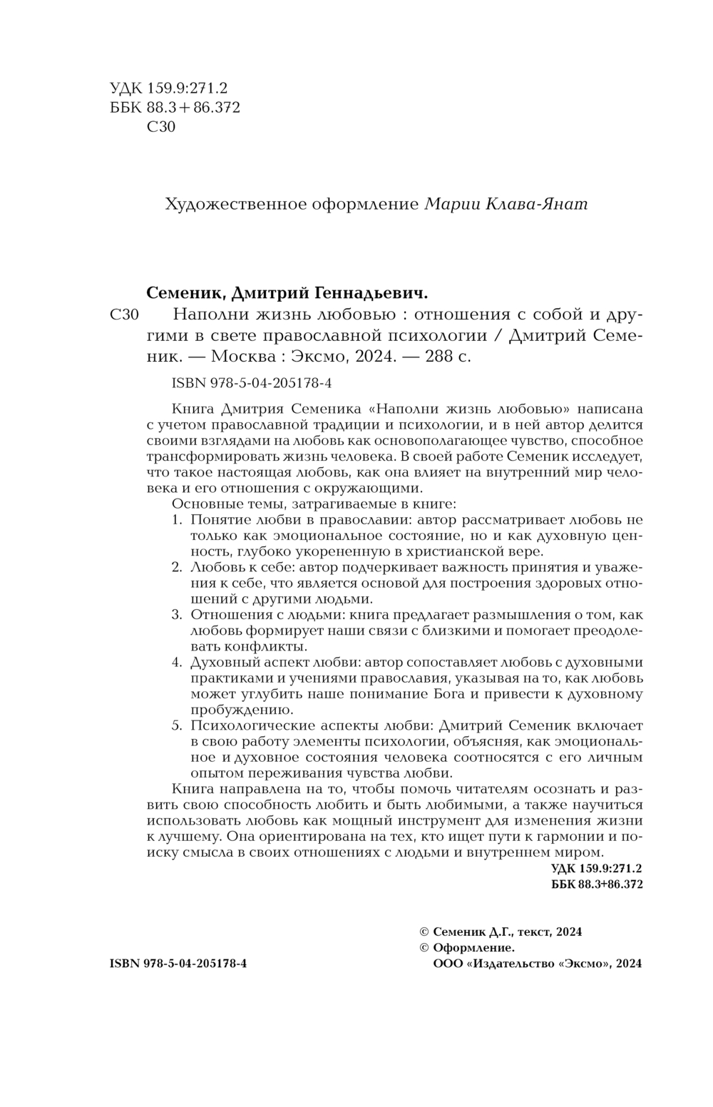 Книга Дмитрия Семеника "Наполни жизнь любовью" написана с учетом православной традиции и психологии, и в ней автор делится своими взглядами на любовь как основополагающее чувство, способное трансформировать жизнь человека. В своей работе Семеник исследует, что такое настоящая любовь, как она влияет на внутренний мир человека и его отношения с окружающими.
