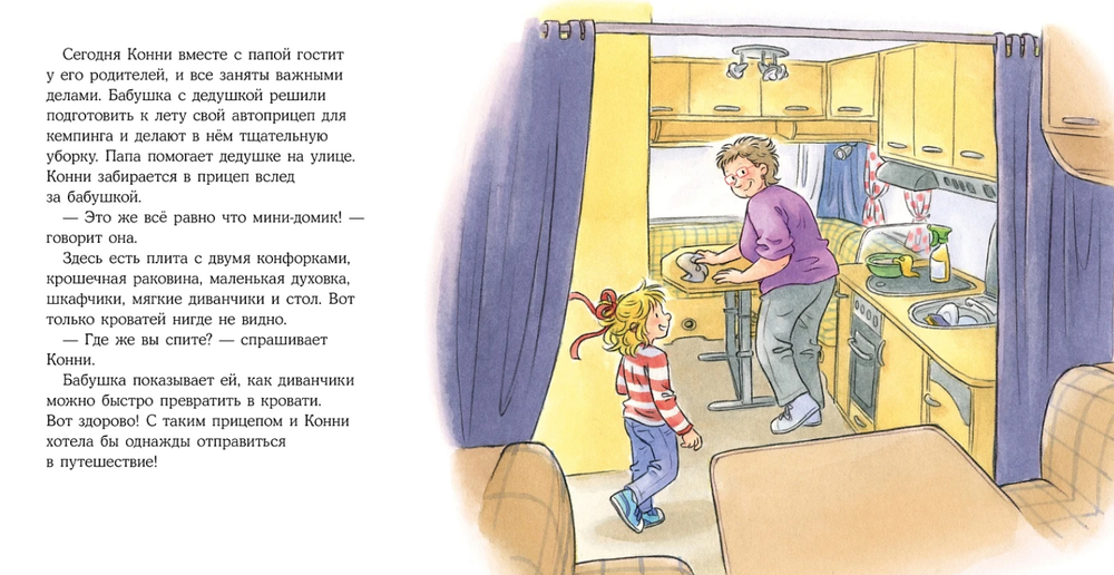 Конни отправляется в увлекательное путешествие с бабушкой, дедушкой и братом Михаэлем в автодоме. Ей не раз придётся столкнуться со страхом и научиться преодолевать его: она тревожится перед долгим путешествием, ведь никогда раньше так надолго не уезжала из дома; учится забираться на вершину канатной пирамиды; ночью отправляется вместе с Михаэлем и дедушкой на поиски потерянной игрушки; боится отойти от бабушки и дедушки в переполненном автобусе.