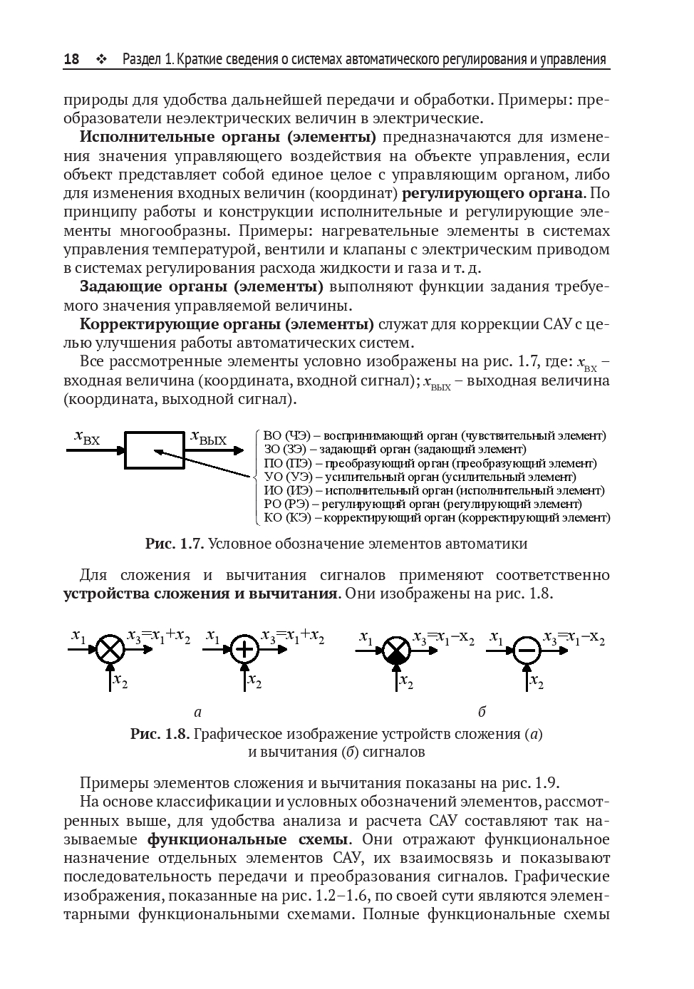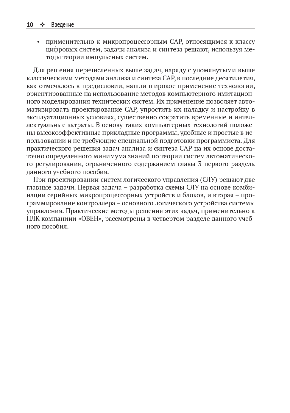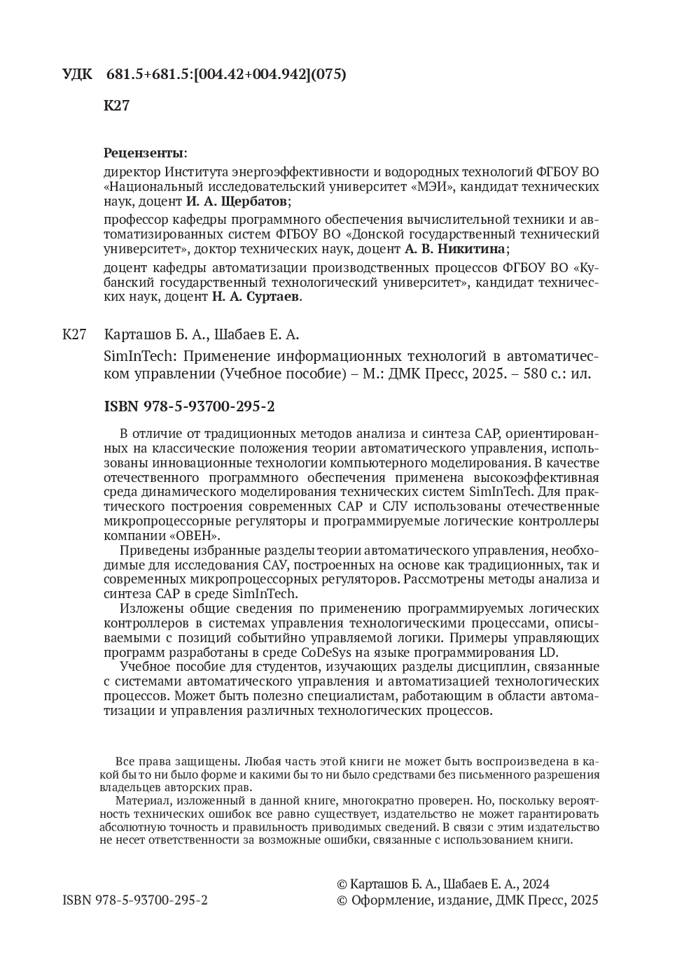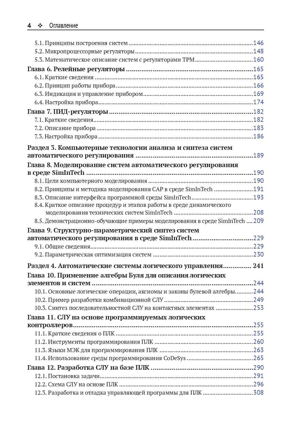 Приведены избранные разделы теории автоматического управления, необходимые для исследования САУ, построенных на основе как традиционных, так и современных микропроцессорных регуляторов. Рассмотрены методы анализа и синтеза САР в среде SimInTech. Изложены общие сведения по применению программируемых логических контроллеров в системах управления технологическими процессами, описываемыми с позиций событийно управляемой логики. Примеры управляющих программ разработаны в среде CoDeSys на языке программирования LD.