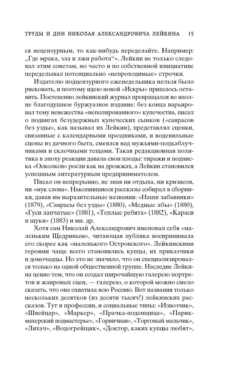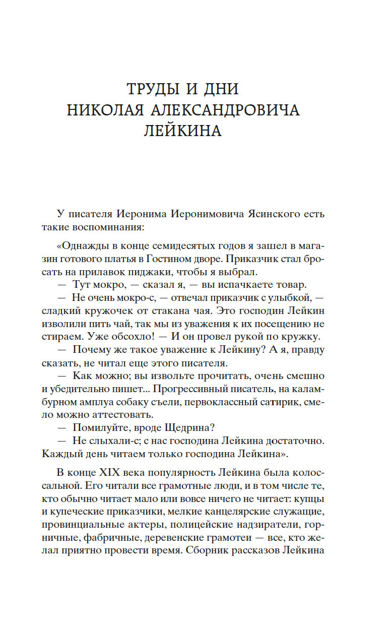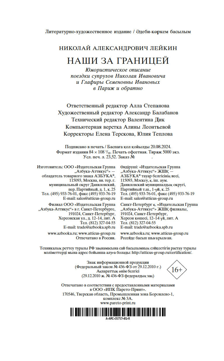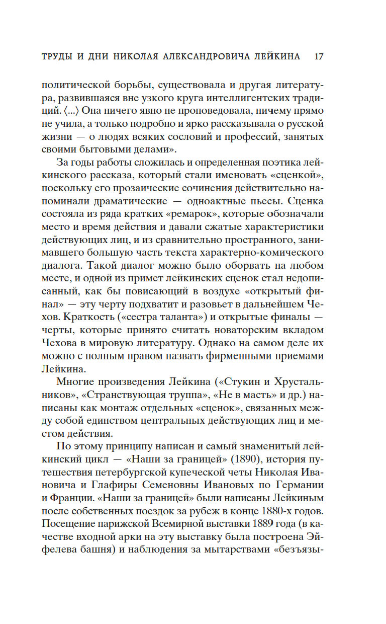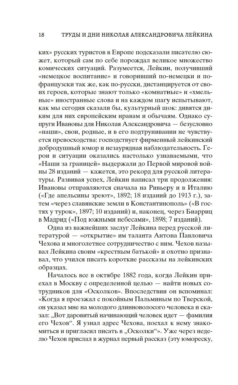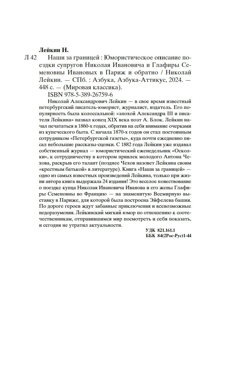Николай Александрович Лейкин – в свое время известный петербургский писатель-юморист, журналист, издатель. Его популярность была колоссальной: "эпохой Александра III и писателя Лейкина" назвал конец XIX века поэт А. Блок. Лейкин начал печататься в 1860-х годах, обратив на себя внимание очерками из купеческого быта. С начала 1870-х годов он стал постоянным сотрудником "Петербургской газеты", куда почти ежедневно писал небольшие рассказы-сценки. С 1882 года Лейкин уже издавал собственный журнал – юмористический еженедельник "Осколки", к сотрудничеству в котором привлек молодого Антона Чехова, раскрыв его талант (позднее Чехов назовет Лейкина своим "крестным батькой" в литературе). Книга "Наши за границей" – одно из самых известных произведений Лейкина, только при жизни автора книга выдержала 24 издания! Это веселое повествование о поездке купца Николая Ивановича Иванова и его жены Глафиры Семеновны во Францию – на знаменитую Всемирную выставку в Париже, для которой была построена Эйфелева башня. По дороге героев ждут забавные приключения и всевозможные недоразумения. Лейкинский мягкий юмор по отношению к соотечественникам, отправившимся мир посмотреть и себя показать, и сегодня не утратил актуальности.