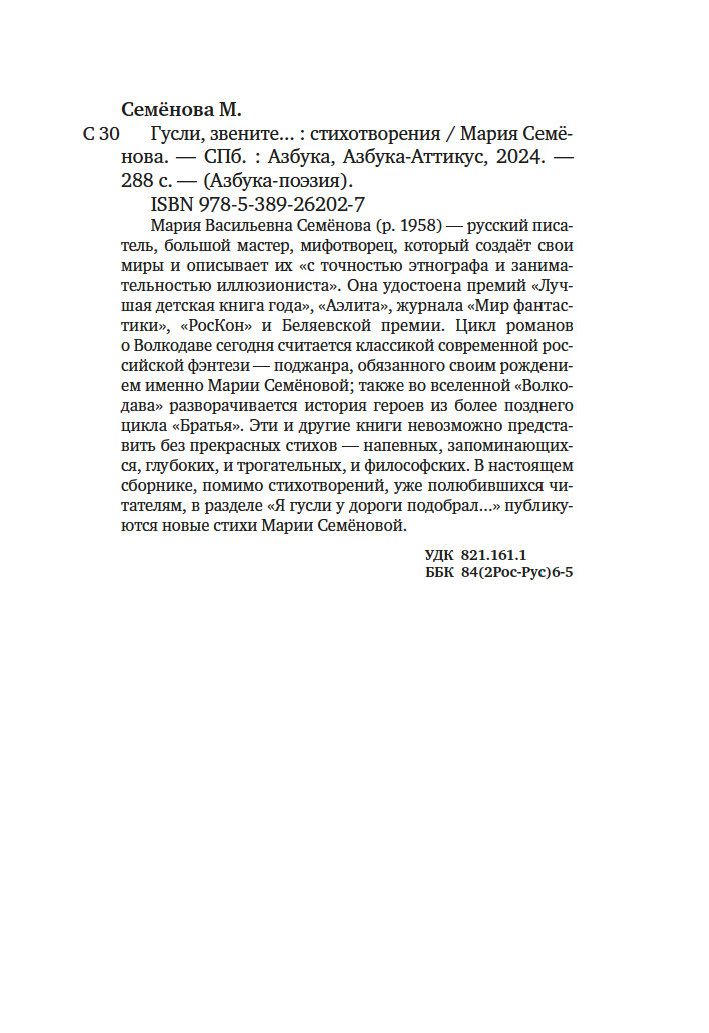 Мария Васильевна Семёнова (р. 1958) – русский писатель, большой мастер, мифотворец, который создаёт свои миры и описывает их "с точностью этнографа и занимательностью иллюзиониста". Она удостоена премий "Лучшая детская книга года", "Аэлита", журнала "Мир фантастики", "РосКон" и Беляевской премии. Цикл романов о Волкодаве сегодня считается классикой современной российской фэнтези – поджанра, обязанного своим рождением именно Марии Семёновой; также во вселенной "Волкодава" разворачивается история героев из более позднего цикла "Братья". Эти и другие книги невозможно представить без прекрасных стихов – напевных, запоминающихся, глубоких, и трогательных, и философских. В настоящем сборнике, помимо стихотворений, уже полюбившихся читателям, в разделе "Я гусли у дороги подобрал..." публикуются новые стихи Марии Семёновой.