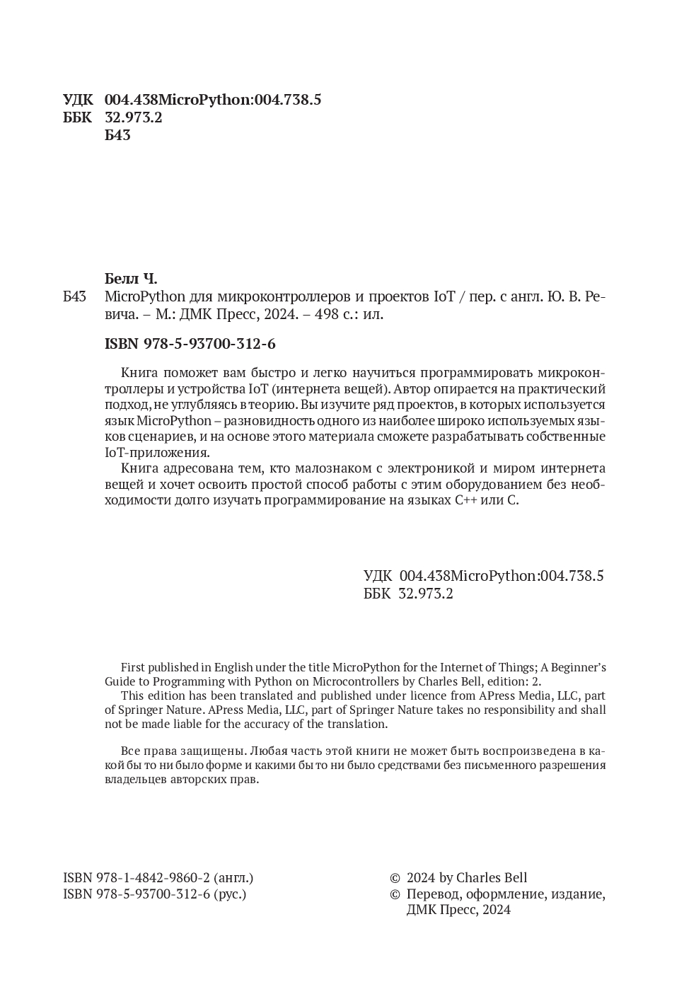 | Название в оригинале | MicroPython for the Internet of Things; A Beginner’s Guide to Programming with Python on Microcontrollers |