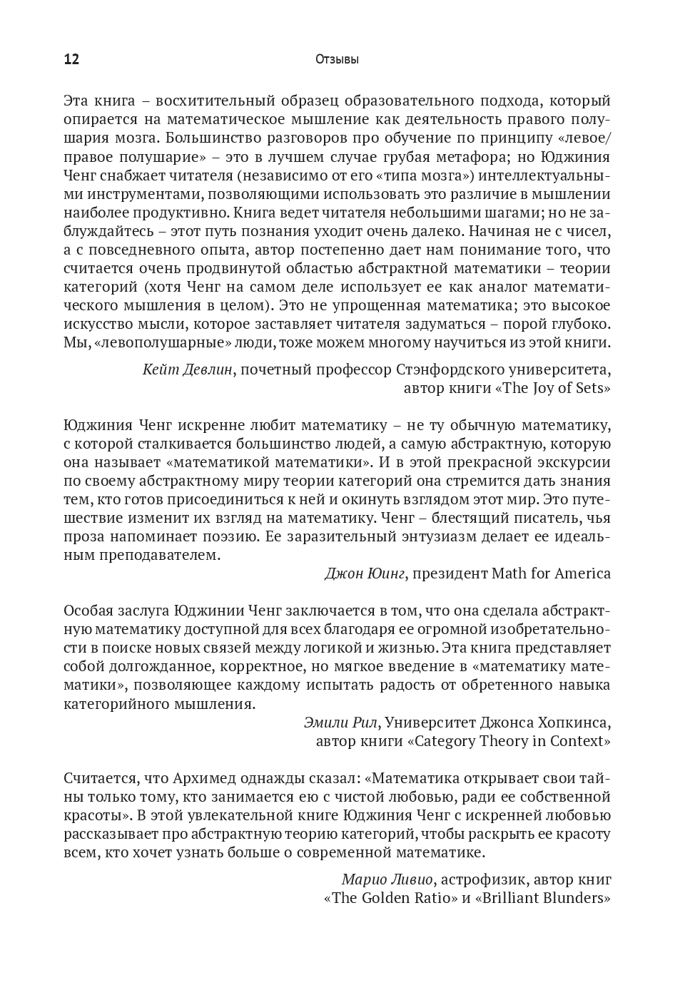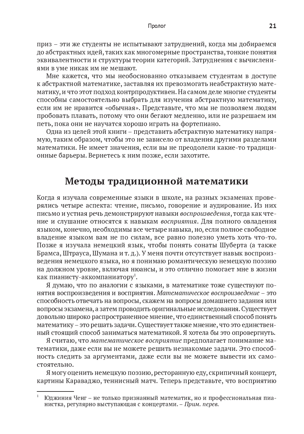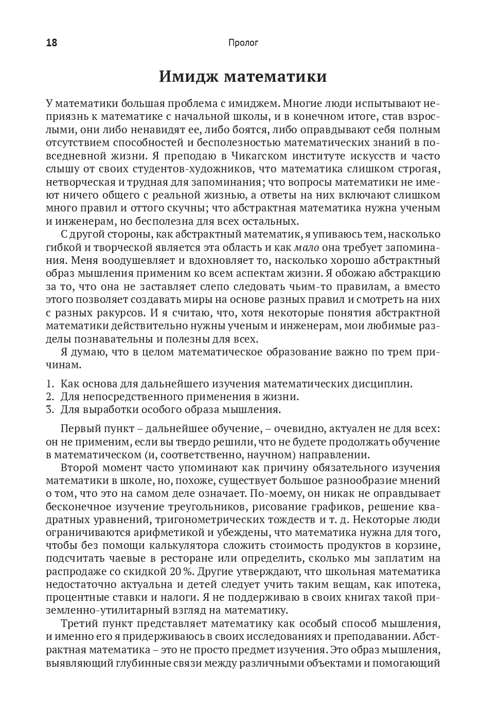 Книга опровергает расхожее мнение о том, что единственный способ обучения математике – решение задач. Автор смещает акцент с формального подхода к развитию математического восприятия, на котором основывается понимание математики в целом. Текст содержит не традиционные упражнения, а, скорее, «поводы к размышлению», помогающие сформировать интуитивное чутье в математике – подобно тому как человек усваивает языки или приобретает художественный вкус.