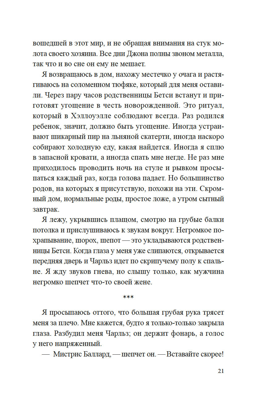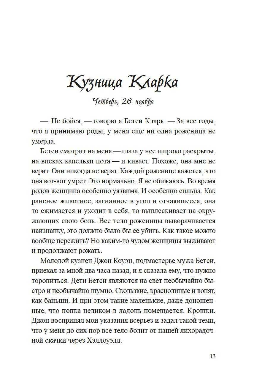 1789 год. Соседи уважают Марту Баллард, повитуху из небольшого городка Хэллоуэлл в штате Мэн, не только за знание медицины и сильный характер, но и за умение хранить секреты, столь необходимое в строгом пуританском обществе. Поэтому, когда в разгар зимы подо льдом реки находят тело мужчины, Марту первой вызывают осмотреть тело. Погибший – Джошуа Бёрджес, которого вместе с городским судьей Джозефом Нортом недавно обвинили в изнасиловании жены проповедника Ребекки Фостер. Марта, которая ухаживала за пострадавшей, является и свидетелем, и доверенным лицом Ребекки, и она подозревает, что гибель насильника неслучайна и за ней кроется нечто большее...