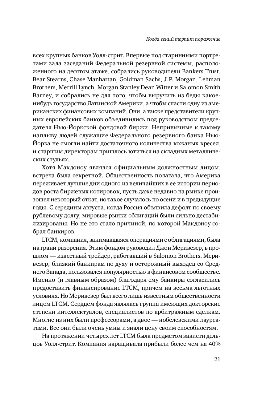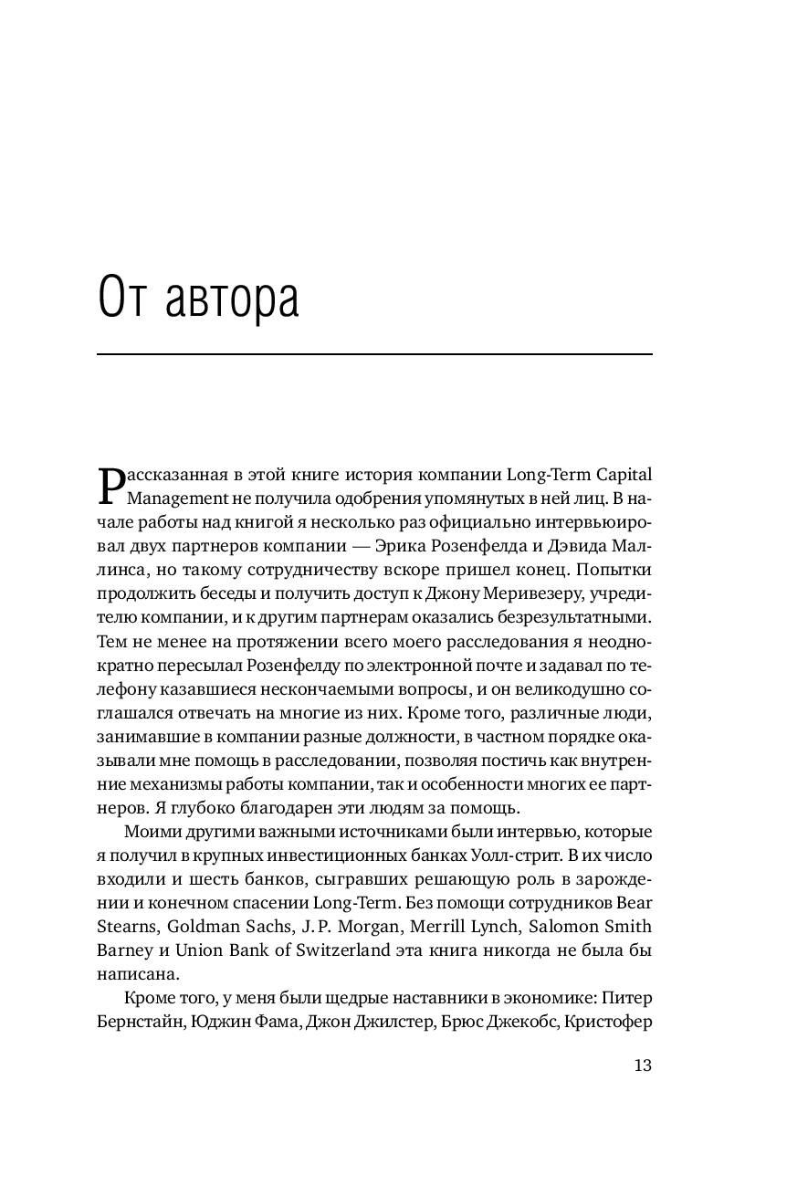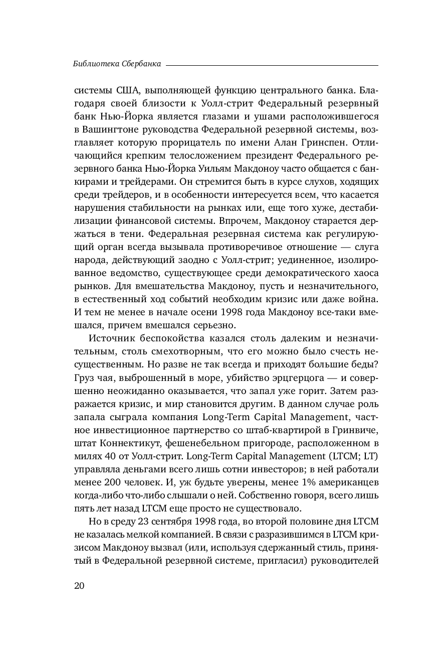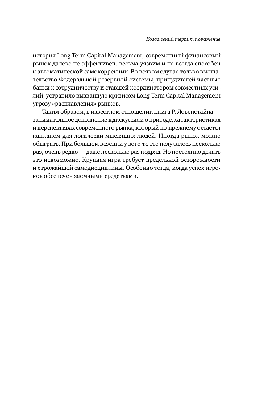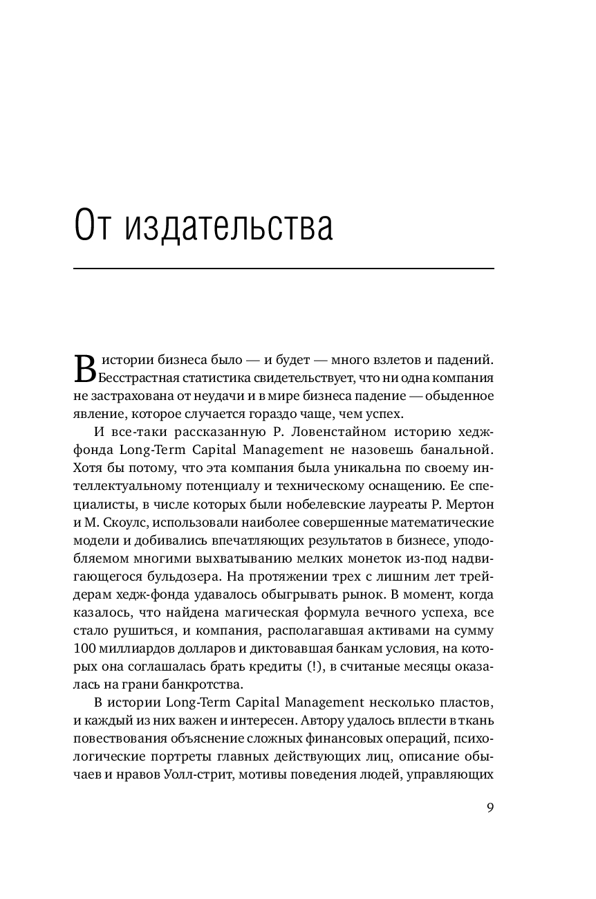 Бесстрастная статистика свидетельствует, что ни одна компания не застрахована от неудачи. В мире бизнеса падение – обыденное явление, которое случается гораздо чаще, чем успех. И все таки рассказанную Р. Ловенстайном историю хедж фонда Long Term Capital Management не назовешь банальной. Хотя бы потому, что эта компания была уникальна по своему интеллектуальному потенциалу и техническому оснащению.