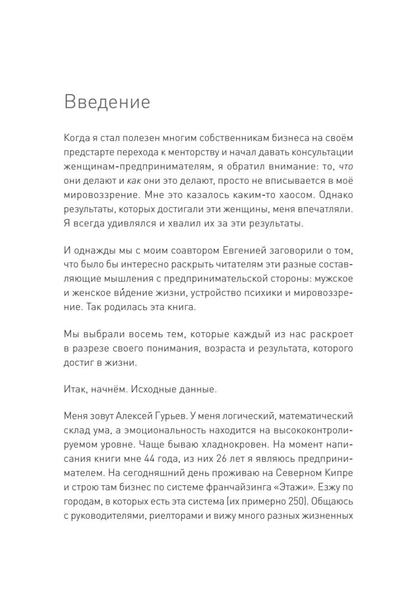 Авторы книги – основатели успешных компаний Алексей Гурьев и Евгения Трибунская – предлагают свой взгляд на жизнь предпринимателя с мужской и женской точки зрения. Шаг за шагом они выстраивали особый мир своих мыслей и ценностей, которые помогли им достичь гармонии и баланса во всех жизненных сферах.