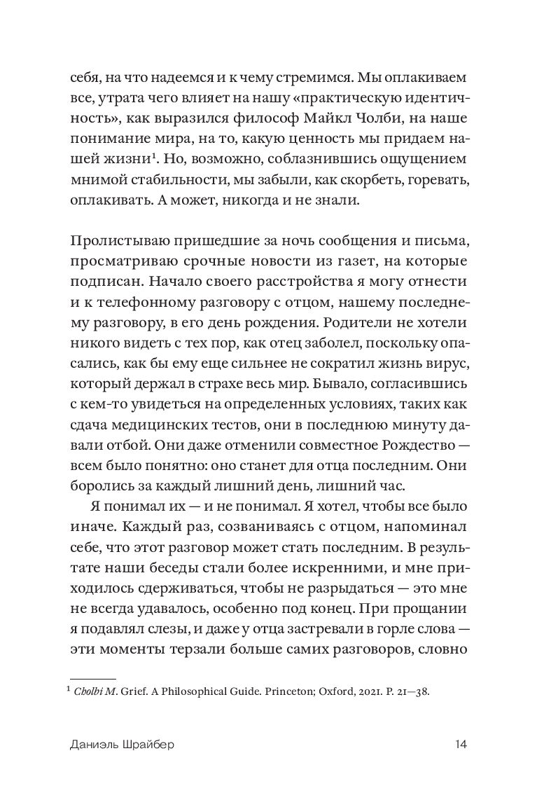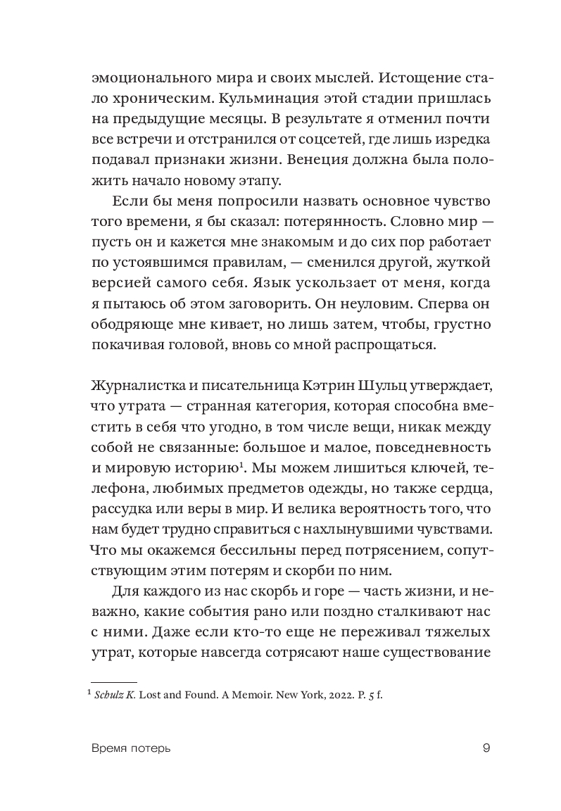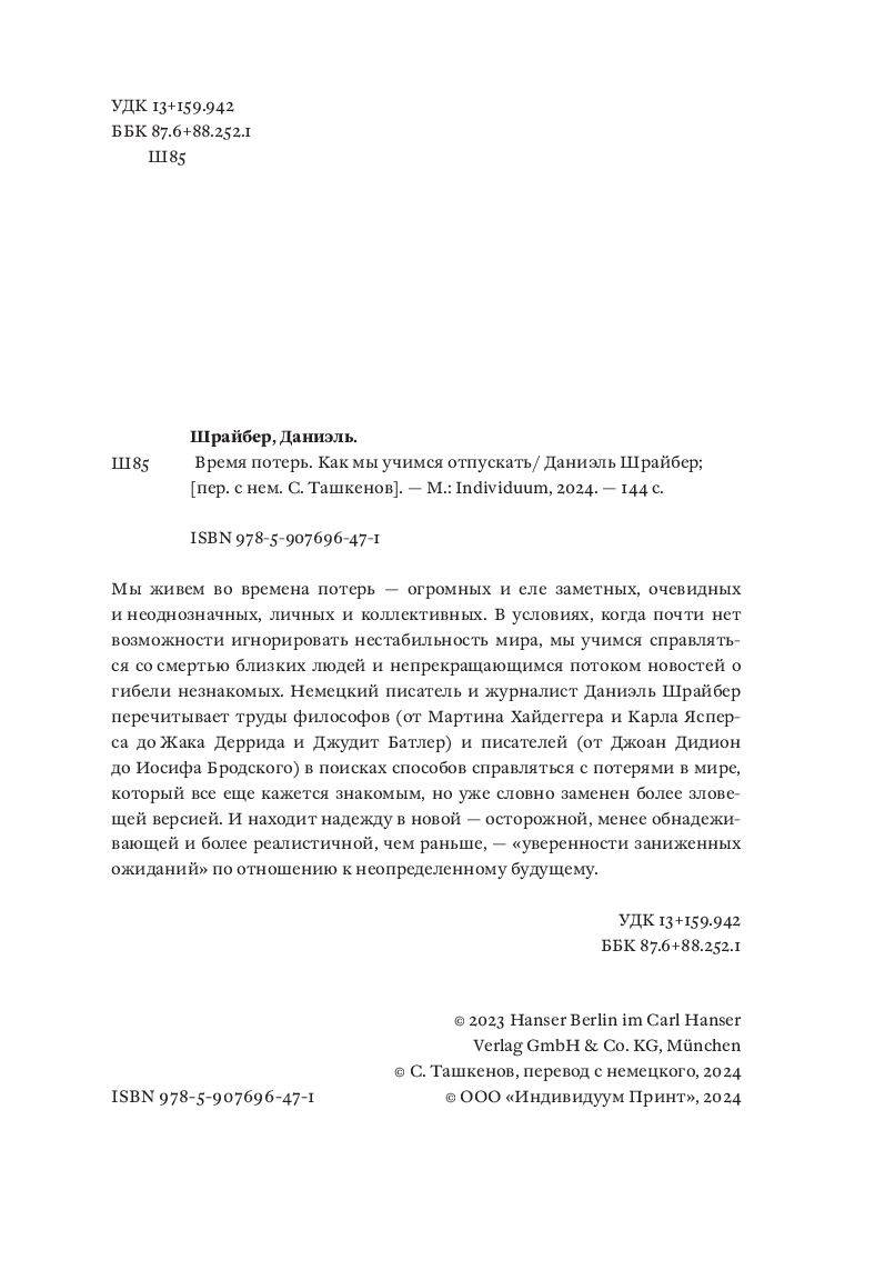 Мы живем во времена потерь – огромных и еле заметных, очевидных и неоднозначных, личных и коллективных. В условиях, когда почти нет возможности игнорировать нестабильность мира, мы учимся справляться со смертью близких людей и непрекращающимся потоком новостей о гибели незнакомых. Немецкий писатель и журналист Даниэль Шрайбер перечитывает труды философов (от Мартина Хайдеггера и Карла Ясперса до Жака Деррида и Джудит Батлер) и писателей (от Джоан Дидион до Иосифа Бродского) в поисках способов справляться с потерями в мире, который все еще кажется знакомым, но уже словно заменен более зловещей версией. И находит надежду в новой – осторожной, менее обнадеживающей и более реалистичной, чем раньше, – "уверенности заниженных ожиданий" по отношению к неопределенному будущему.