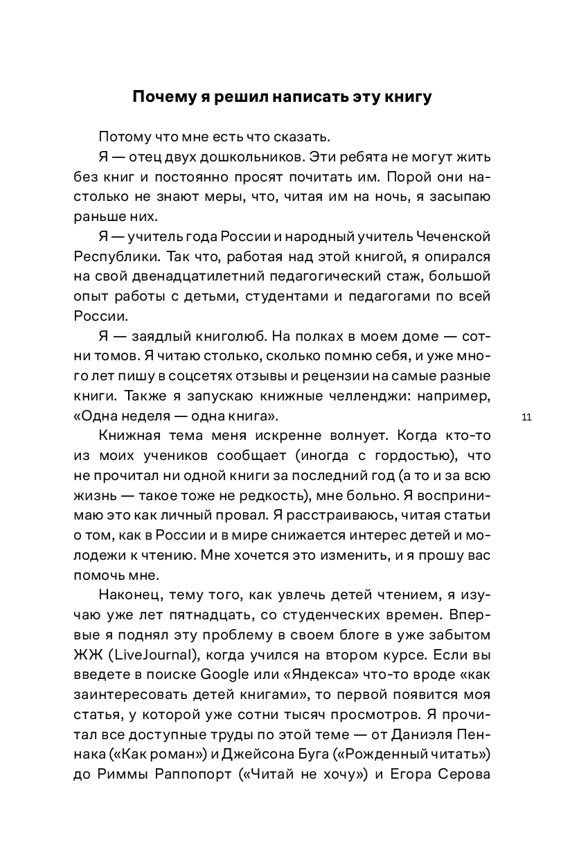 Родители дошкольников и школьников часто переживают: дети все реже берут в руки книги, предпочитая смартфоны и социальные сети. В своей книге "Почему он не читает? 100 советов, как увлечь ребенка чтением" учитель года России, отец двоих детей и книголюб Алихан Динаев делится проверенными методами по воспитанию маленьких читателей.