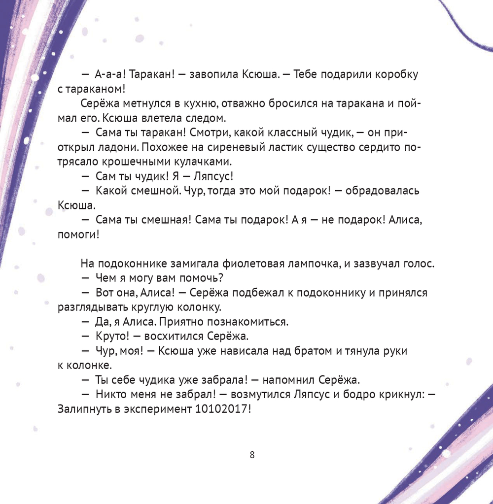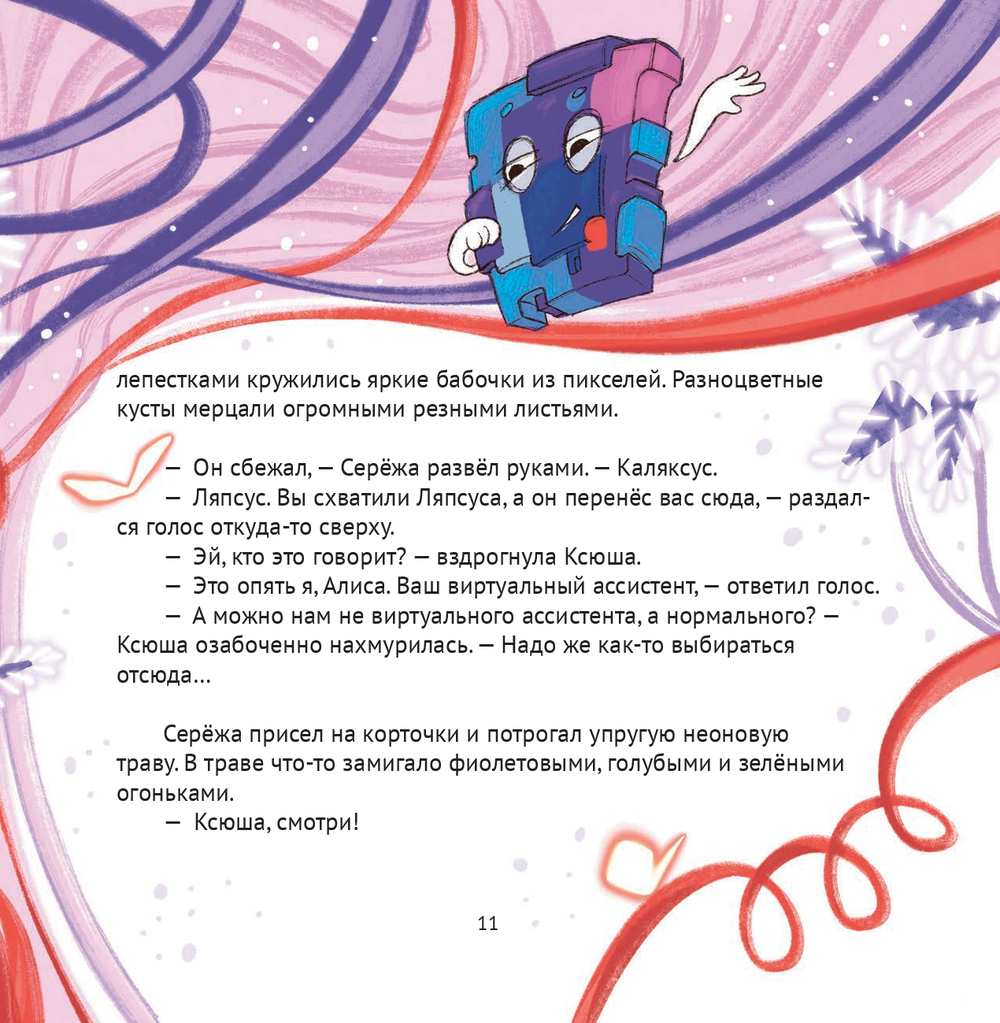 С Серёжей и Ксюшей это и случилось. Ляпсус неосторожно произнёс секретный код и... Добро пожаловать! Двоичный лес, хрустальная гора, цифровые облака, сказочные баги, множество удивительных открытий – всё это здорово, но как выбраться отсюда и вернуться домой? Брату с сестрой придётся на каждом шагу разгадывать сложные головоломки, чтобы собрать кодовую фразу. Алиса, конечно, будет помогать, а ещё подбадривать, веселить и подсказывать. По дороге Ксюша и Серёжа узнают, кто она такая, эта Алиса, сколько ей лет, как она слышит и говорит, где и чему она учится. А ещё разберутся что такое искусственный интеллект и зачем он нужен!