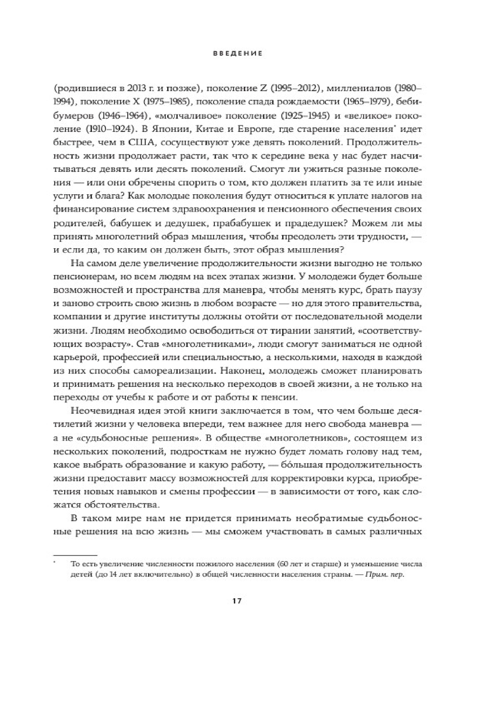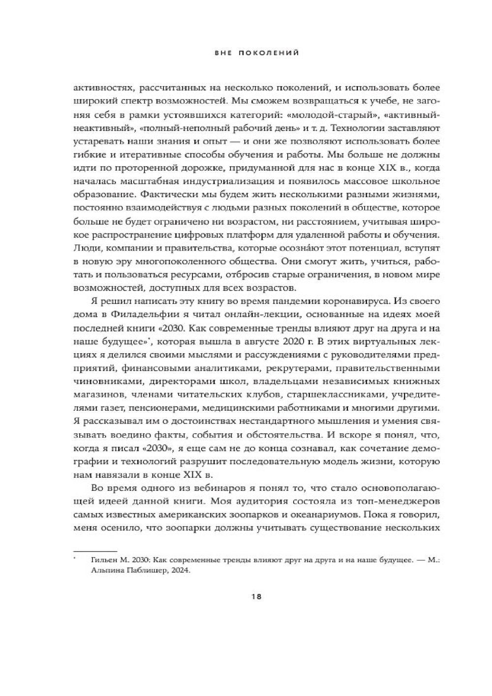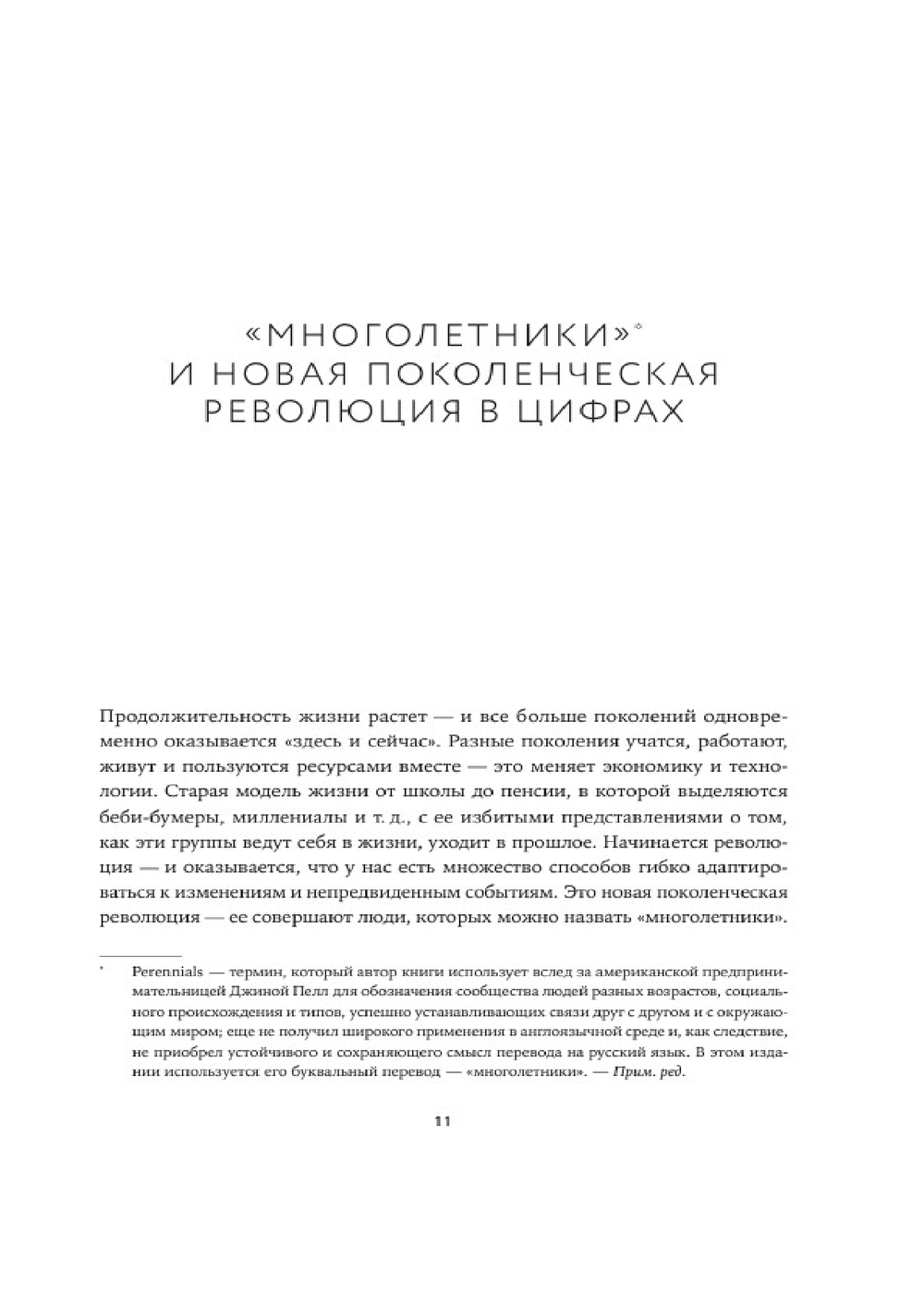 В своей книге "Вне поколений. Новые правила работы и жизни" Мауро Гильен, автор бестселлера "2030. Как современные тренды влияют друг на друга и на наше будущее", предлагает увлекательное исследование феномена "многолетников" и его влияния на все сферы жизни. Гильен доказывает, что привычная модель "учеба-работа-пенсия" устарела. "Многолетники" не боятся менять профессию, учиться новому и сохранять активность в любом возрасте.