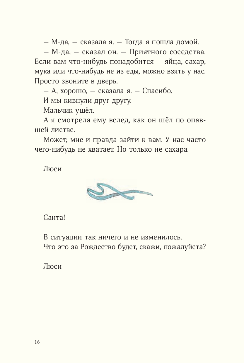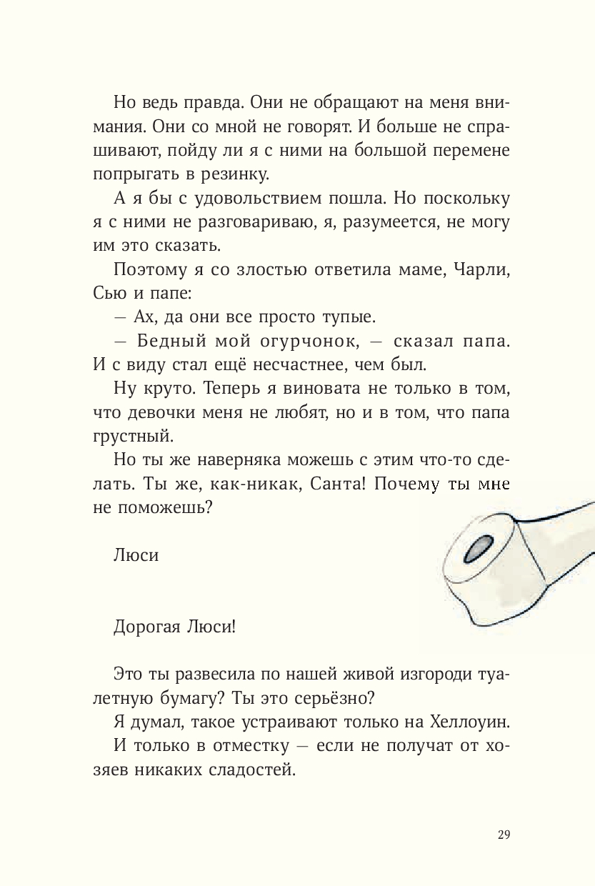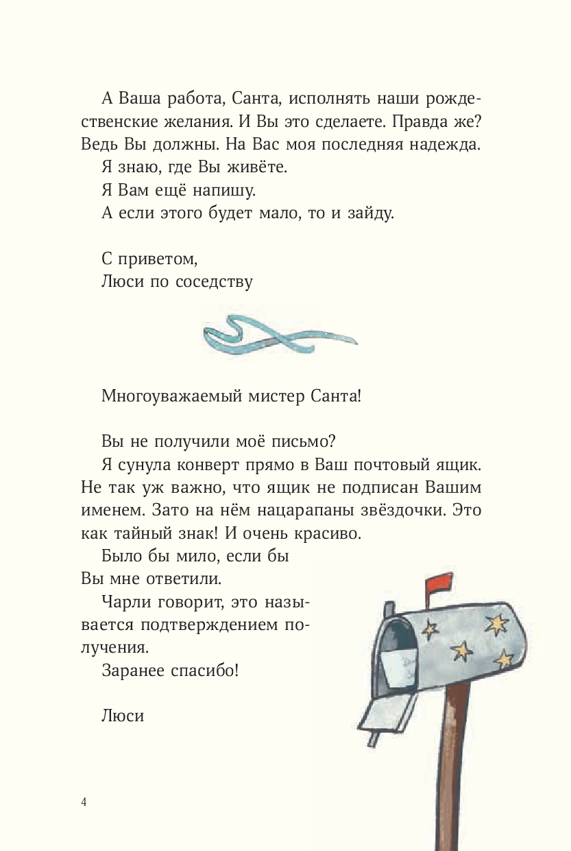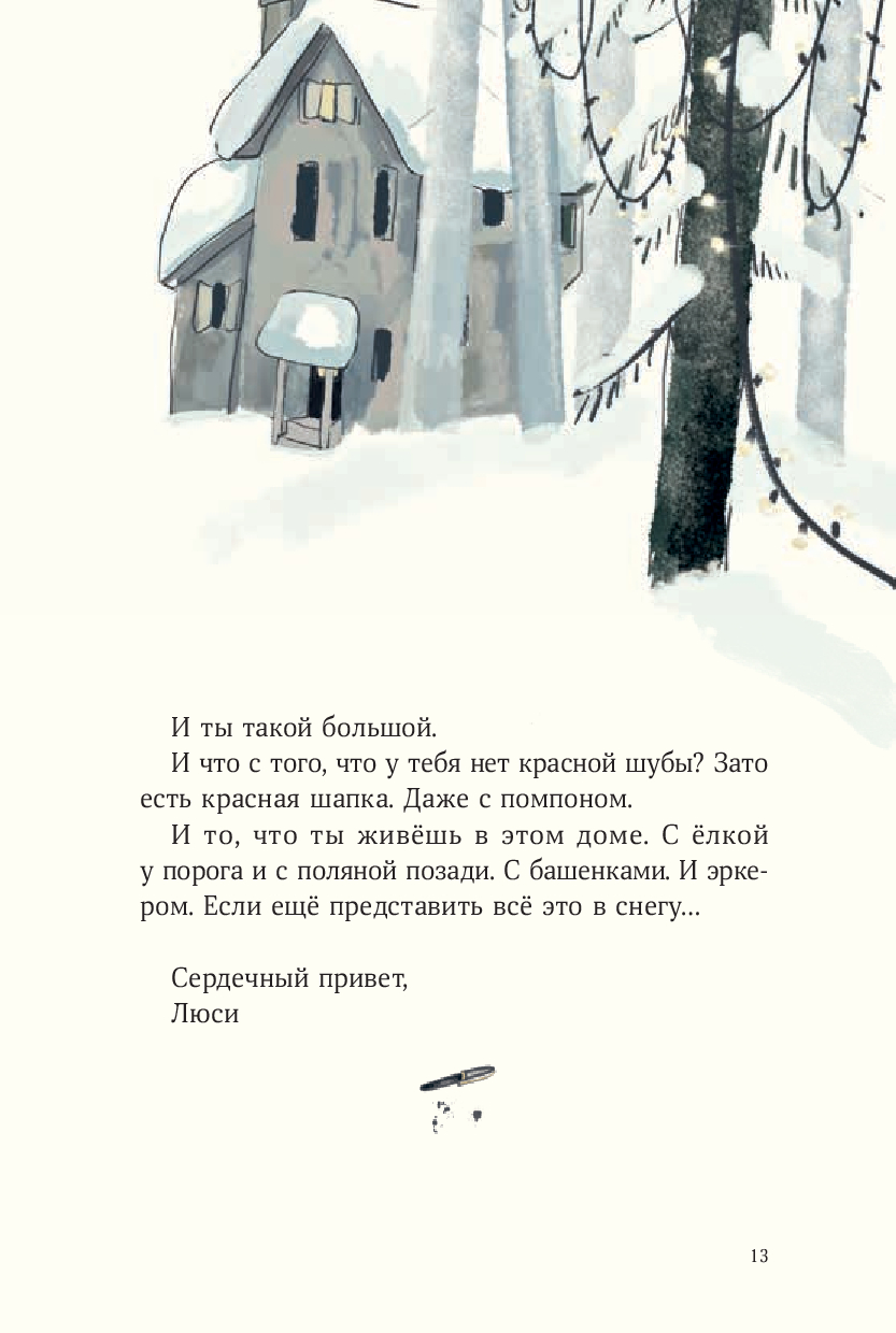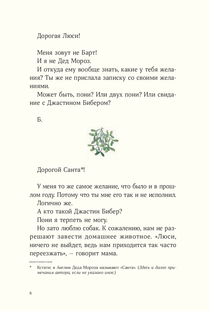 Люси абсолютно уверена: Дед Мороз живет по соседству. Белая борода? Есть. Белые волосы? Есть. Густой и зычный голос, который идеально подходит для восклицания "Хо, хо, хо"? Есть. И что с того, что у него нет красной шубы? Зато есть красная шапка. Даже с помпоном. К тому же соседний дом граничит с лесом, а поляна позади него идеально подходит для выгула оленей. Люси это вполне устраивает, потому что она может отправить свой список желаний прямо ему в почтовый ящик. Есть много вещей, которые она хочет. Например, чтобы папа не был таким грустным. И подружиться с девочками из класса. Вот почему она не сдается, когда в ответном письме говорится, что она ошиблась адресом и ее сосед вовсе не Дед Мороз.