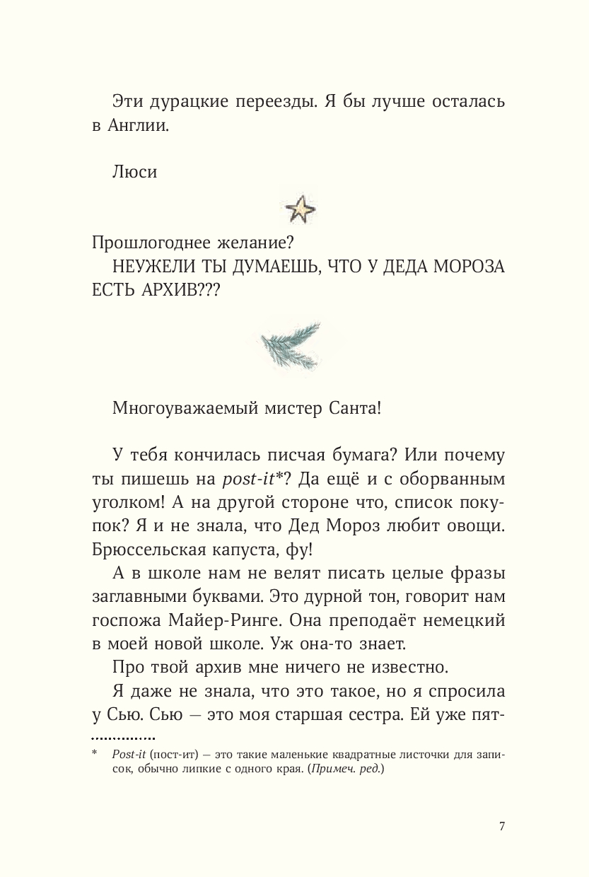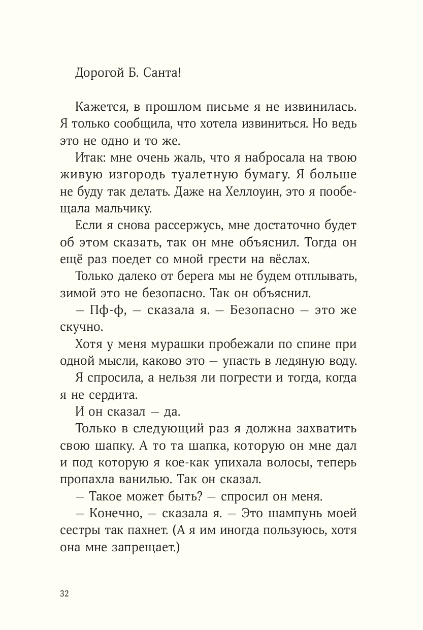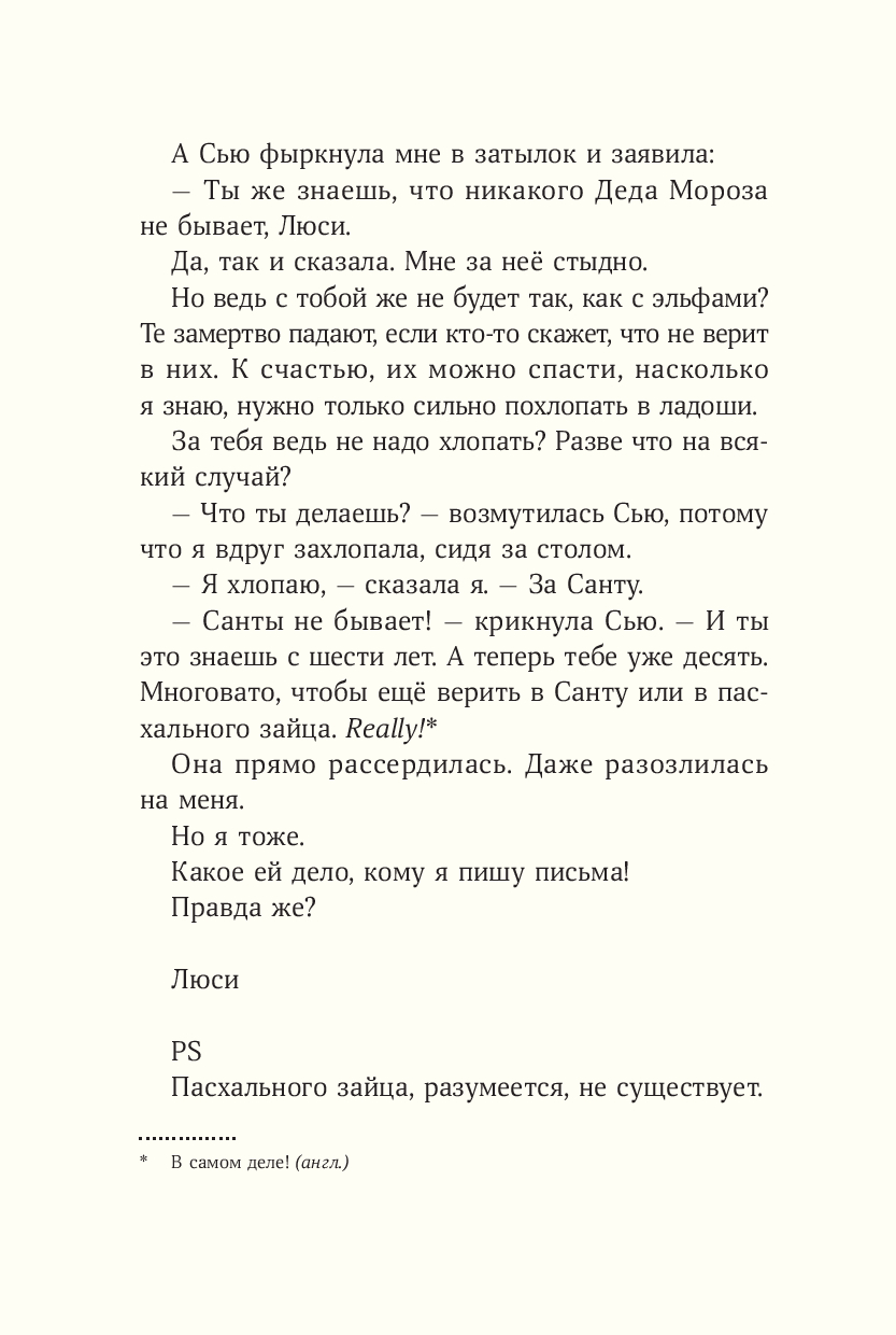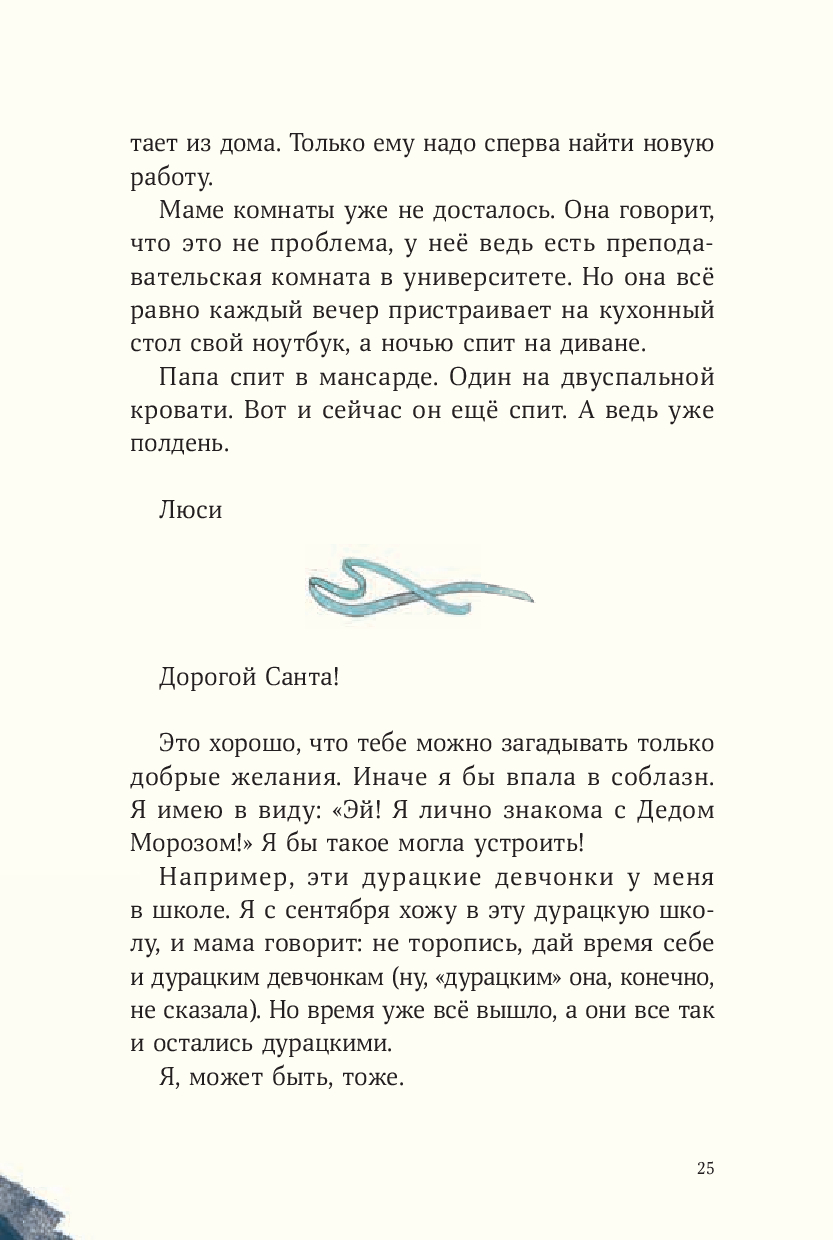 Люси абсолютно уверена: Дед Мороз живет по соседству. Белая борода? Есть. Белые волосы? Есть. Густой и зычный голос, который идеально подходит для восклицания "Хо, хо, хо"? Есть. И что с того, что у него нет красной шубы? Зато есть красная шапка. Даже с помпоном. К тому же соседний дом граничит с лесом, а поляна позади него идеально подходит для выгула оленей. Люси это вполне устраивает, потому что она может отправить свой список желаний прямо ему в почтовый ящик. Есть много вещей, которые она хочет. Например, чтобы папа не был таким грустным. И подружиться с девочками из класса. Вот почему она не сдается, когда в ответном письме говорится, что она ошиблась адресом и ее сосед вовсе не Дед Мороз.