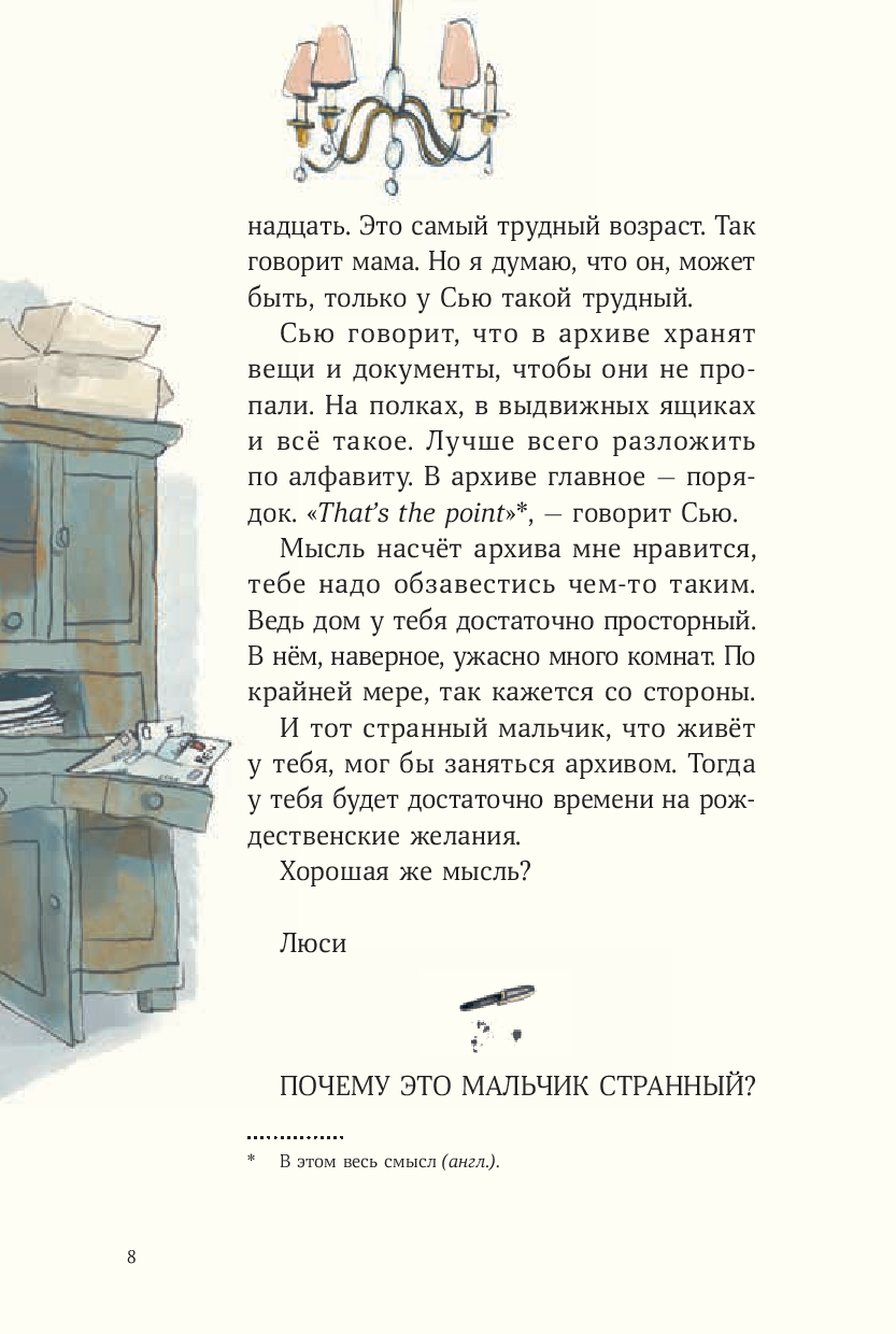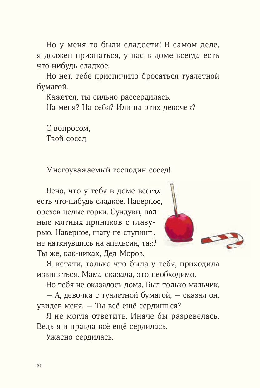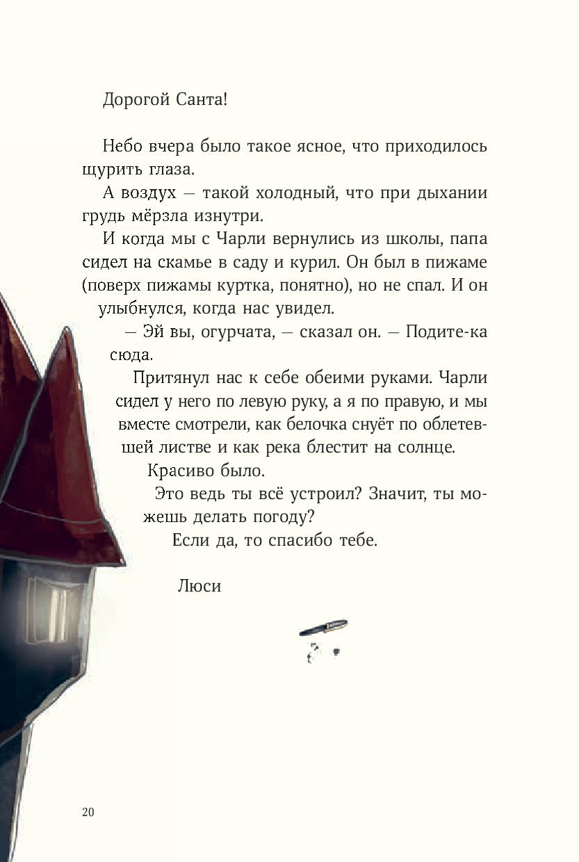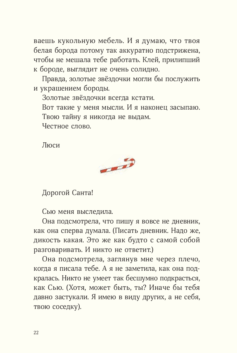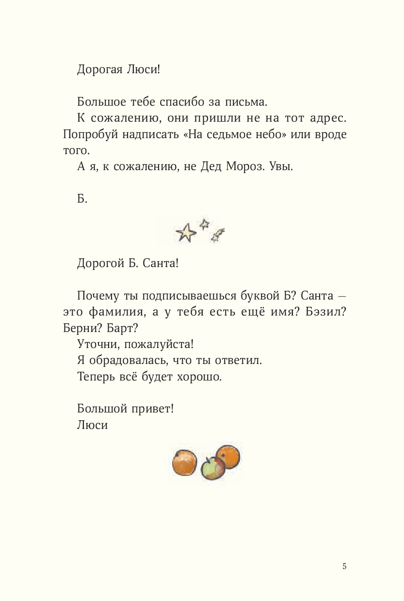 Люси абсолютно уверена: Дед Мороз живет по соседству. Белая борода? Есть. Белые волосы? Есть. Густой и зычный голос, который идеально подходит для восклицания "Хо, хо, хо"? Есть. И что с того, что у него нет красной шубы? Зато есть красная шапка. Даже с помпоном. К тому же соседний дом граничит с лесом, а поляна позади него идеально подходит для выгула оленей. Люси это вполне устраивает, потому что она может отправить свой список желаний прямо ему в почтовый ящик. Есть много вещей, которые она хочет. Например, чтобы папа не был таким грустным. И подружиться с девочками из класса. Вот почему она не сдается, когда в ответном письме говорится, что она ошиблась адресом и ее сосед вовсе не Дед Мороз.