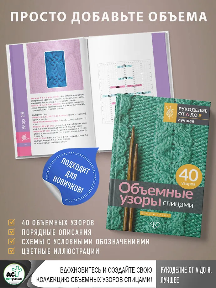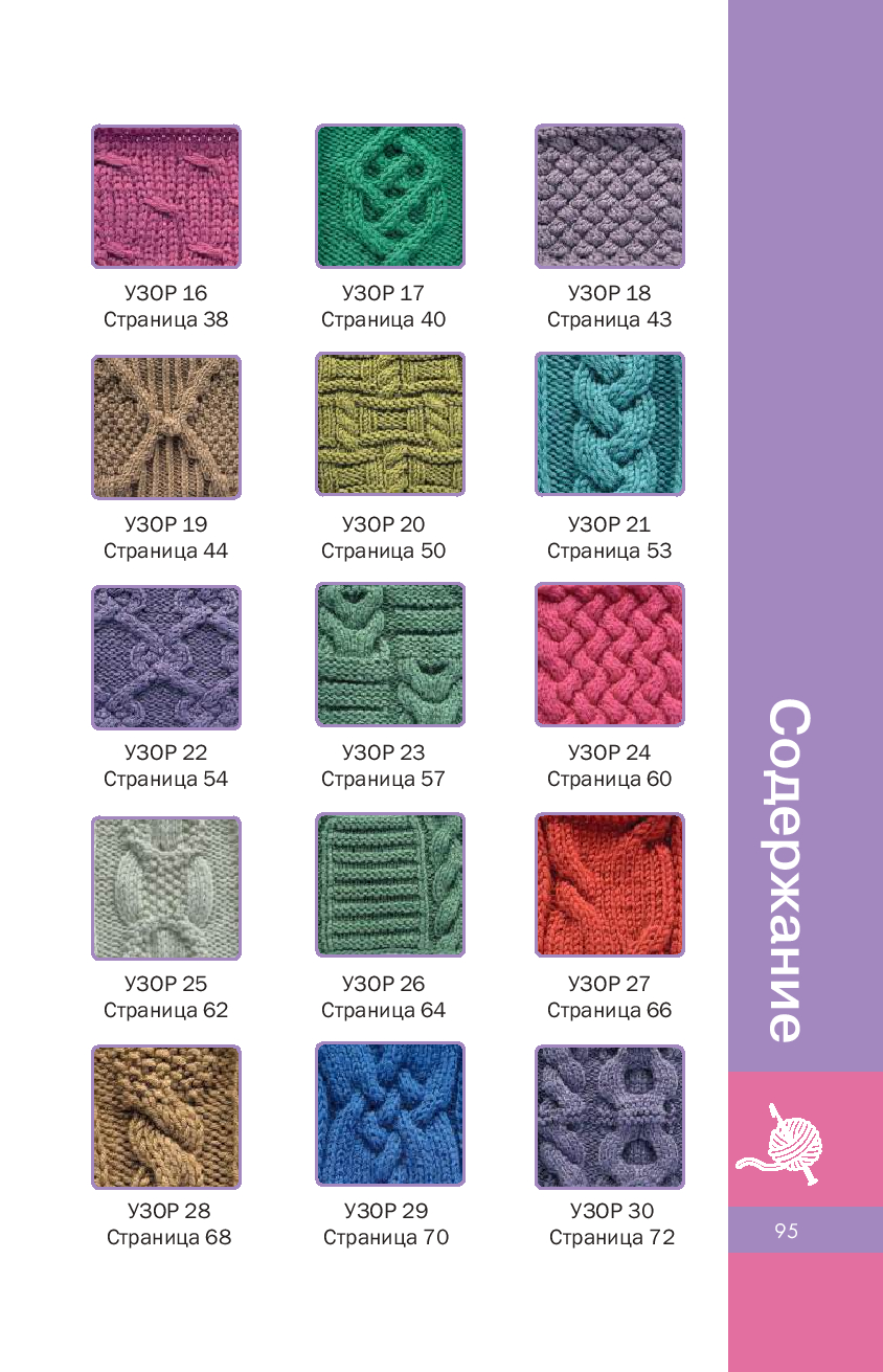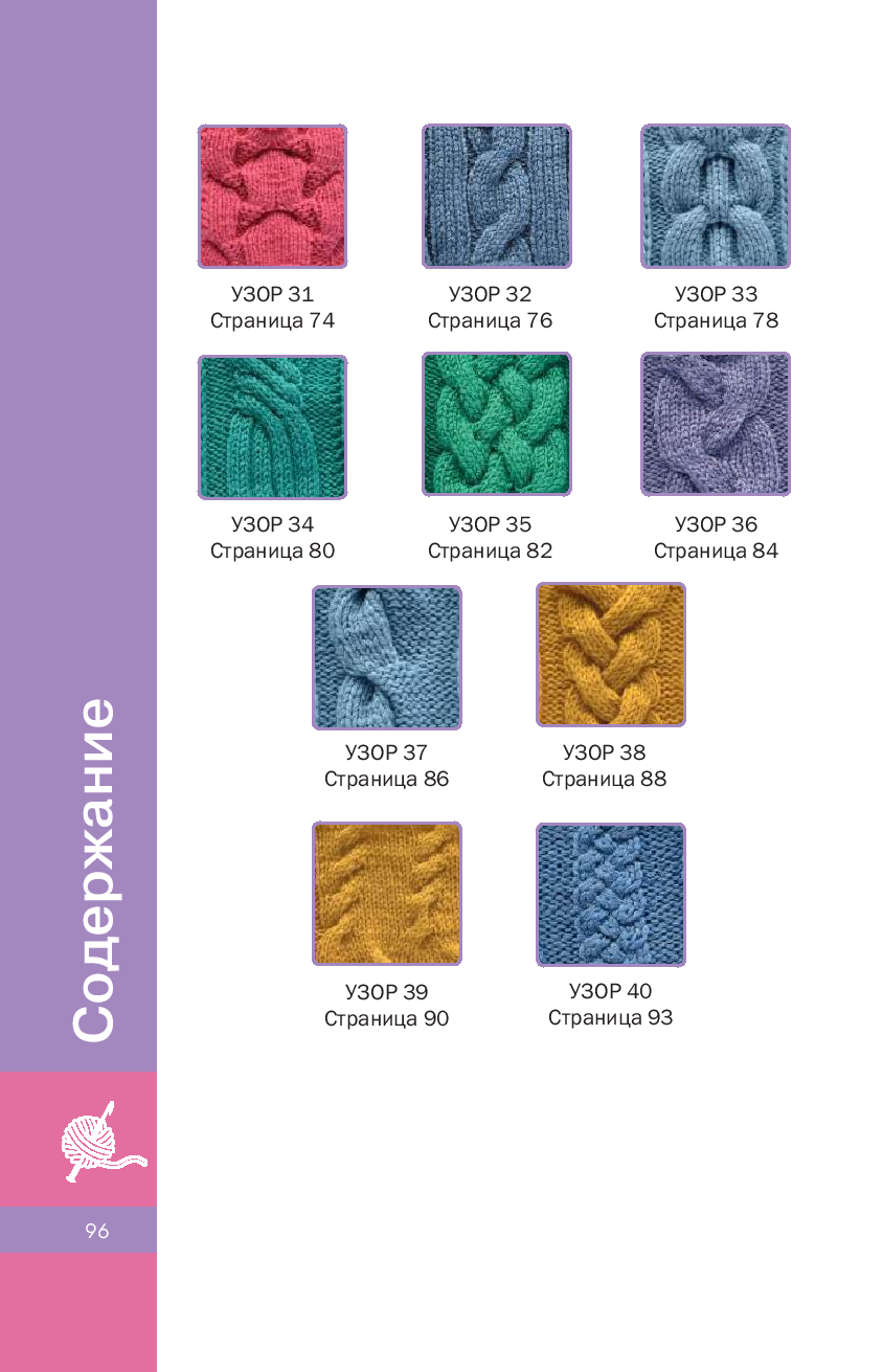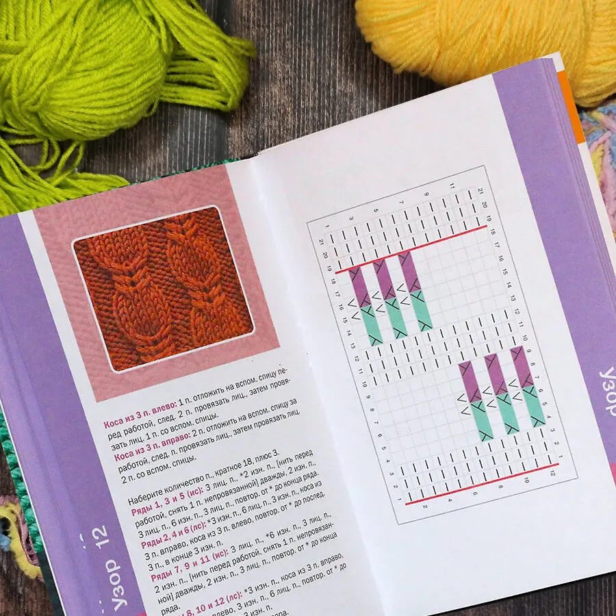 В этой книге собрано 40 узоров. Вы сможете связать минималистичные и изысканные или броские и яркие полотна из кос и аранов! В этом вам помогут фотографии, описания по рядам и цветные схемы. Вдохновитесь и создайте свою коллекцию объемных узоров спицами!