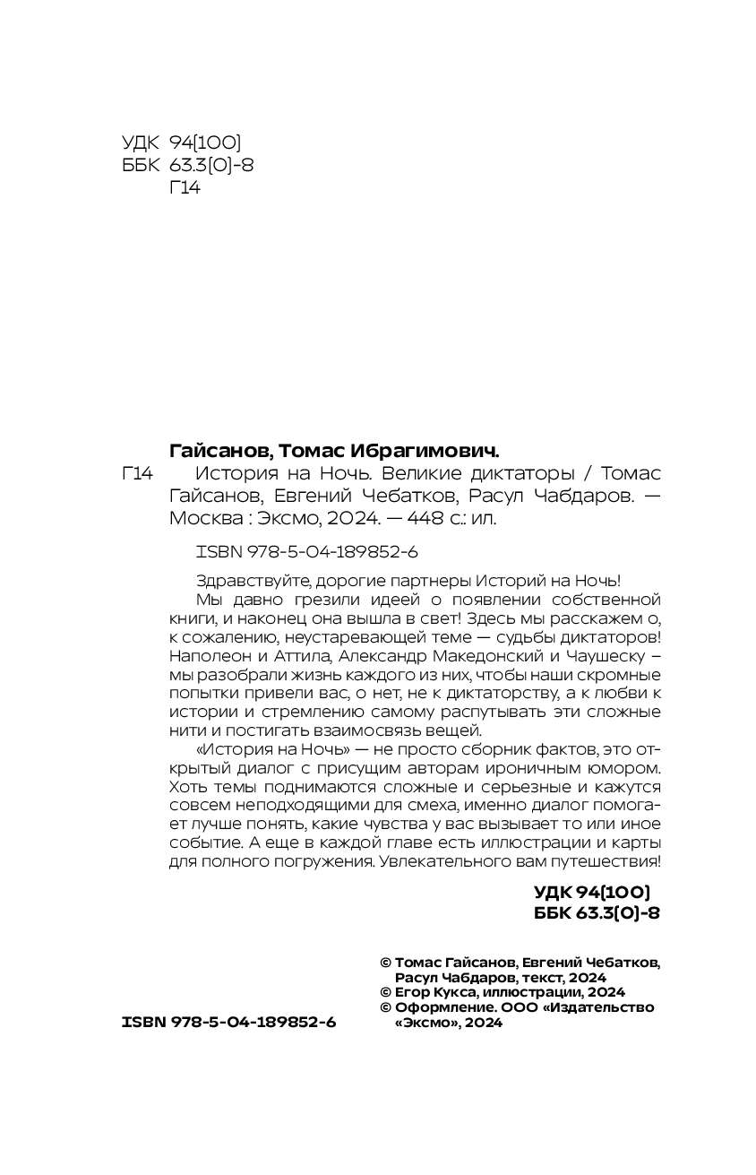 "Истории на ночь" – не просто сборник фактов, это открытый диалог с присущим авторам ироничным юмором. Хоть темы поднимаются сложные и серьёзные и кажутся совсем неподходящими для смеха, именно диалог помогает лучше понять, какие чувства у вас вызывает то или иное событие. А еще в каждой главе есть иллюстрации и карты для полного погружения. Увлекательного вам путешествия!