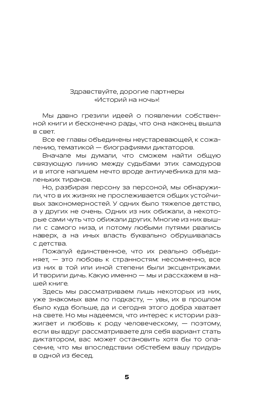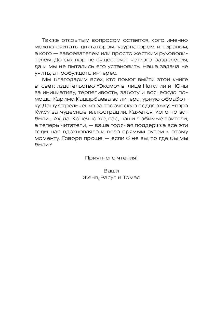Мы давно грезили идеей о появлении собственной книги, и, наконец, она вышла в свет! Здесь мы расскажем о, к сожалению, неустаревающей теме – судьбы диктаторов! Наполеон и Аттила, Александр Македонский и Чаушеску – мы разобрали жизнь каждого из них, чтобы наши скромные попытки привели вас, о, нет, не к диктаторству, а к любви к истории и стремлению самому распутывать эти сложные нити и постигать взаимосвязь вещей.