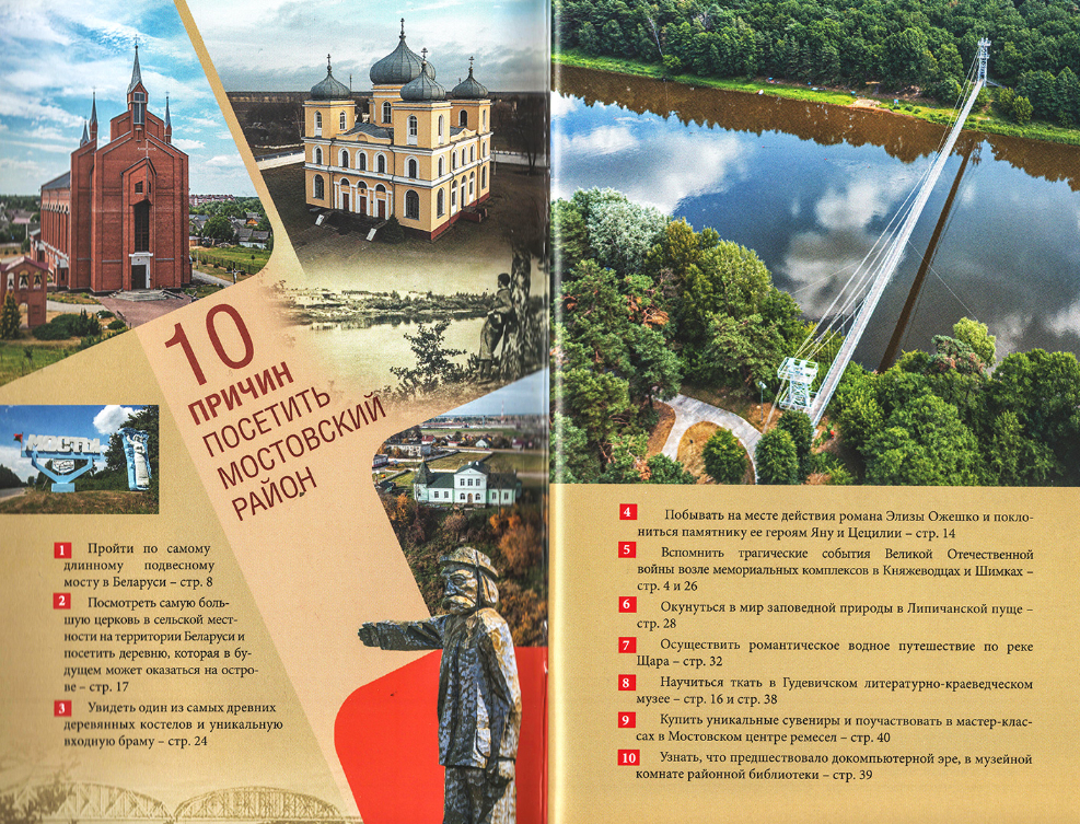 Мостовский район богат на природные, архитектурные и исторические достопримечательности. Наш путеводитель поможет узнать больше о самых интересных местах Мостовщины: в издании представлены фото и описания городов и деревень, костелов и церквей, памятных мест и природных заказников, расположенных на территории Мостовского района. Среди них самая большая церковь в сельской местности на территории Беларуси; деревня, которая в будущем может оказаться на острове; один из самых древних деревянных костелов и уникальная входная брама; Липичанская пуща и многое другое. Кроме этого, путеводитель содержит полезную информацию для туристов: где можно остановиться, пообедать.