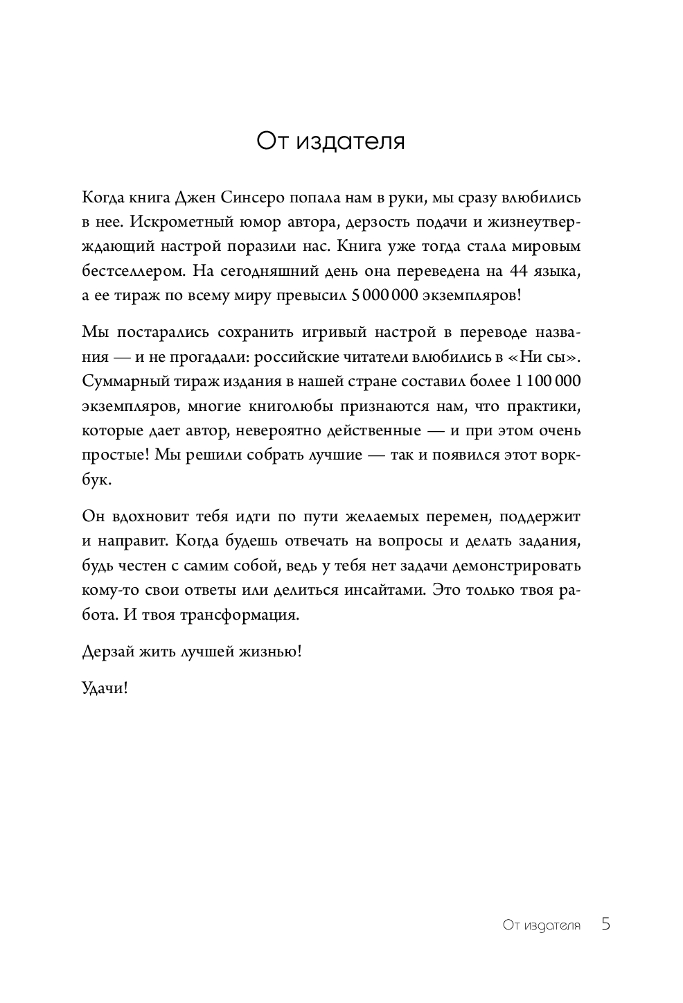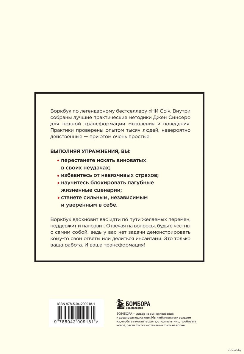 Что бы ни происходило вокруг, мы можем контролировать свою жизнь. В этом уверена автор культового бестселлера "НИ СЫ", который два года подряд возглавляет Всероссийский книжный рейтинг. Книга содержит 25 лично проверенных Джен Синсеро методик для полной трансформации мышления и поведения. Они наполняют наше существование смыслом, избавляют от навязчивых страхов, блокируют пагубные жизненные сценарии, придают сил и оптимизма. "НИ СЫ" переведена на 44 языка. Только в России ее тираж составил более 1 100 000 экземпляров. По праву считается одной из самых мощных книг по перезапуску жизни. И одной из самых нужных в трудные времена.