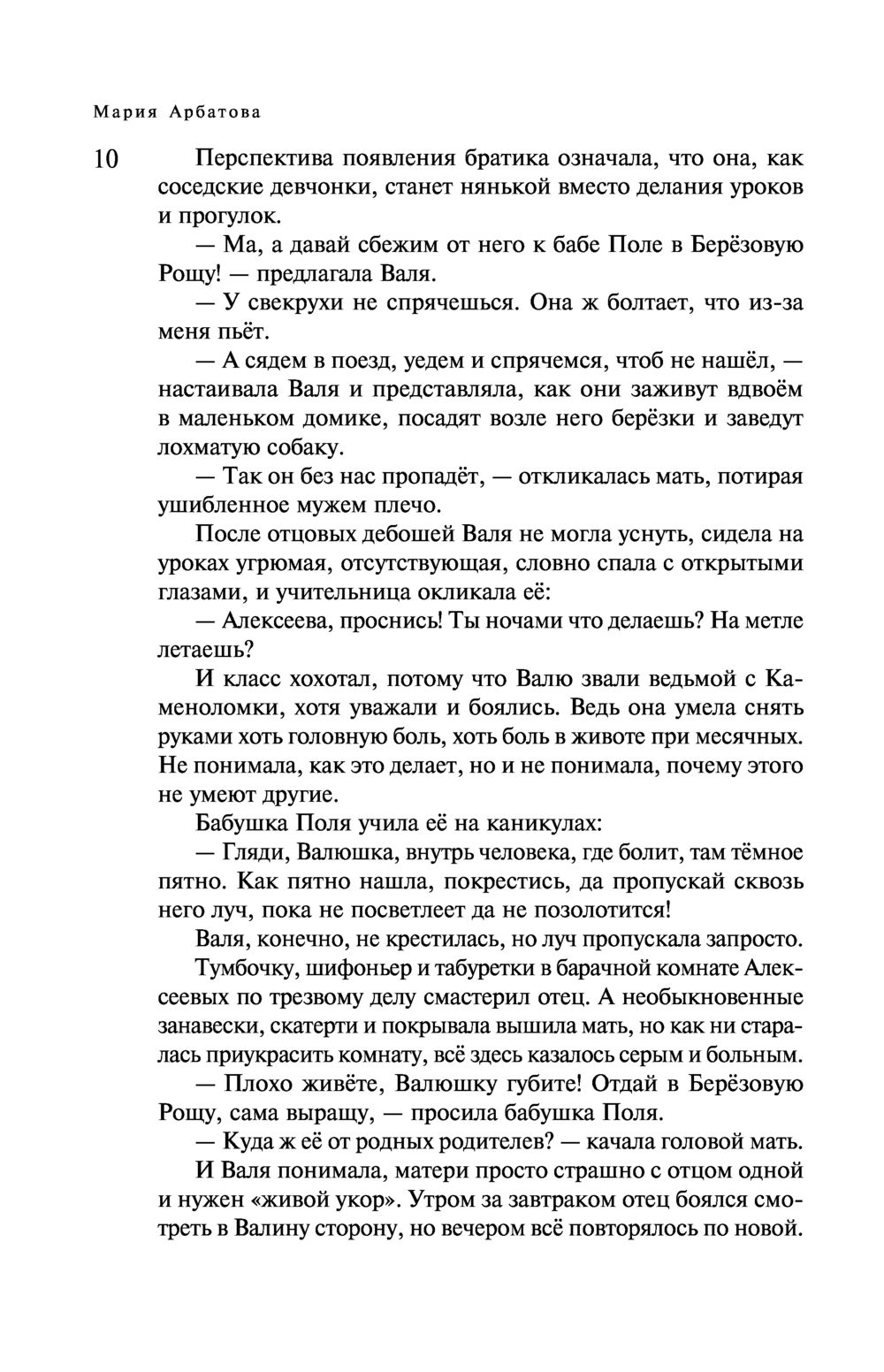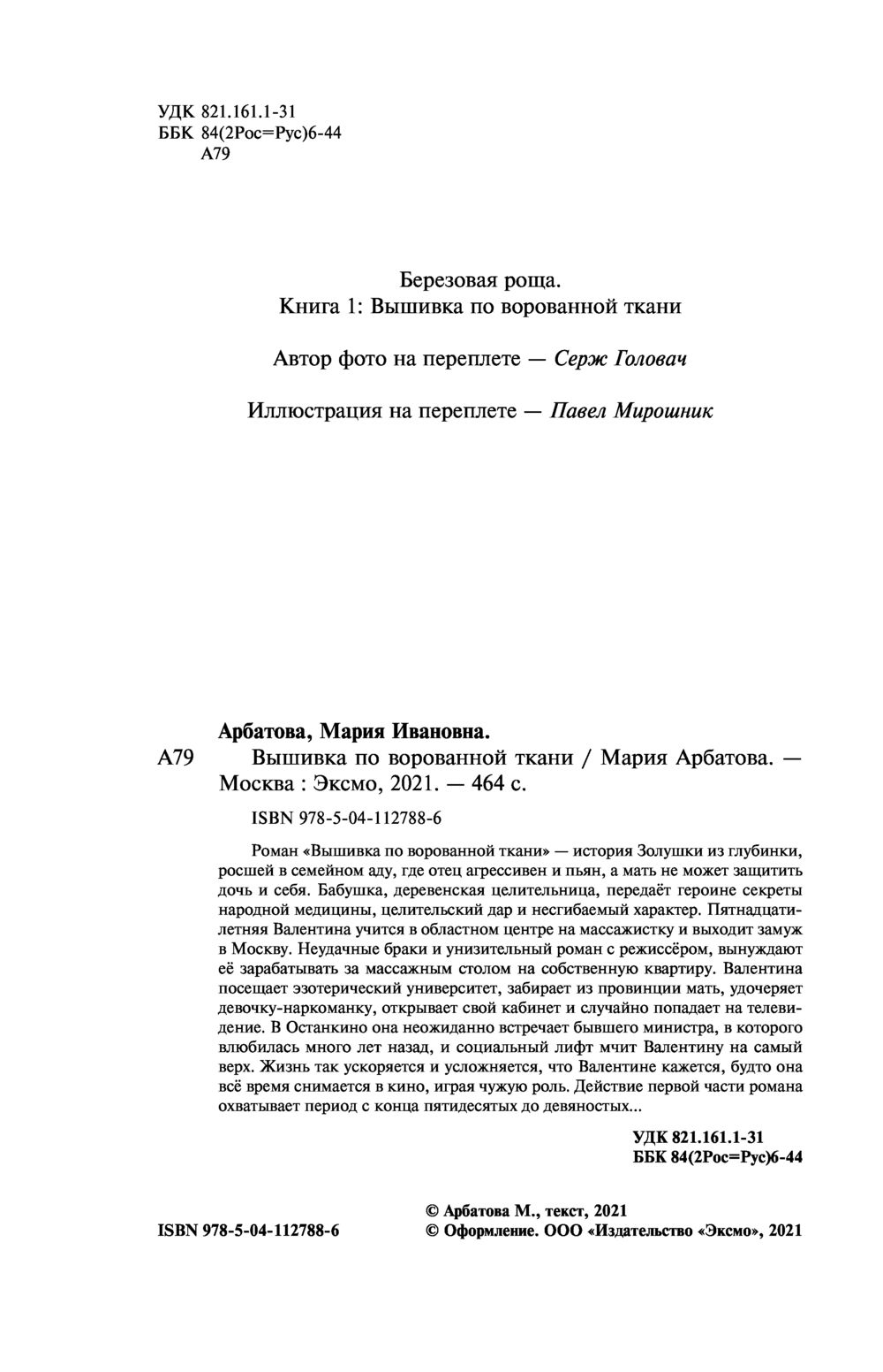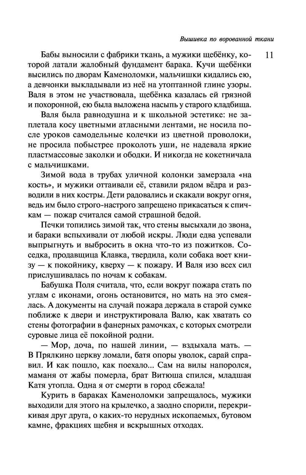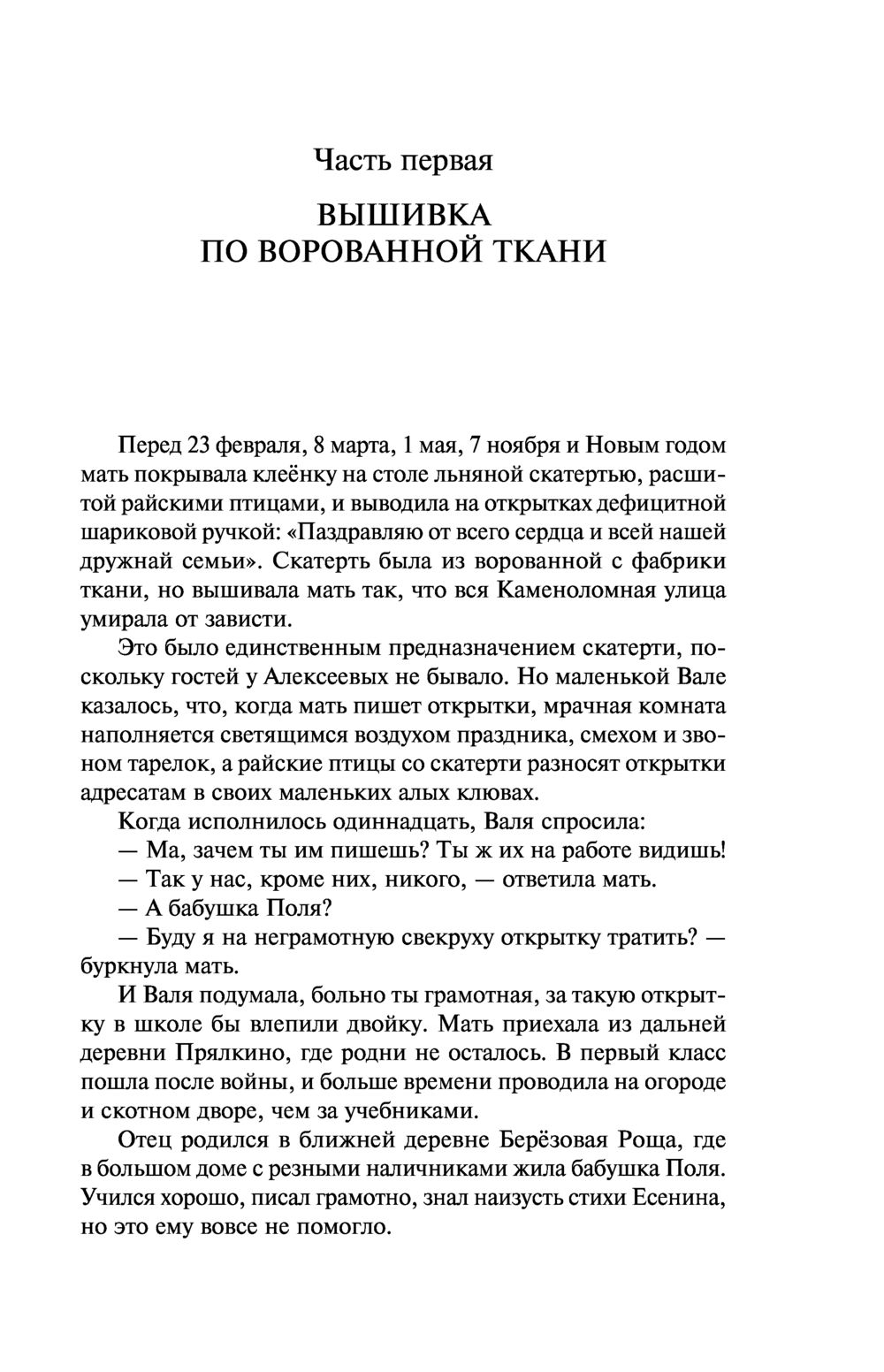 Роман "Вышивка по ворованной ткани" – история Золушки из глубинки, росшей в семейном аду, где отец агрессивен и пьян, а мать не может защитить дочь и себя. Бабушка, деревенская целительница, передаёт героине секреты народной медицины, целительский дар и несгибаемый характер. Пятнадцатилетняя Валентина учится в областном центре на массажистку и выходит замуж в Москву. Неудачные браки и унизительный роман с режиссёром, вынуждают её зарабатывать за массажным столом на собственную квартиру. Валентина посещает эзотерический университет, забирает из провинции мать, удочеряет девочку-наркоманку, открывает свой кабинет и случайно попадает на телевидение. В Останкино она неожиданно встречает бывшего министра, в которого влюбилась много лет назад, и социальный лифт мчит Валентину на самый верх. Жизнь так ускоряется и усложняется, что Валентине кажется, будто она всё время снимается в кино, играя чужую роль. Действие первой части романа охватывает период с конца пятидесятых до девяностых...