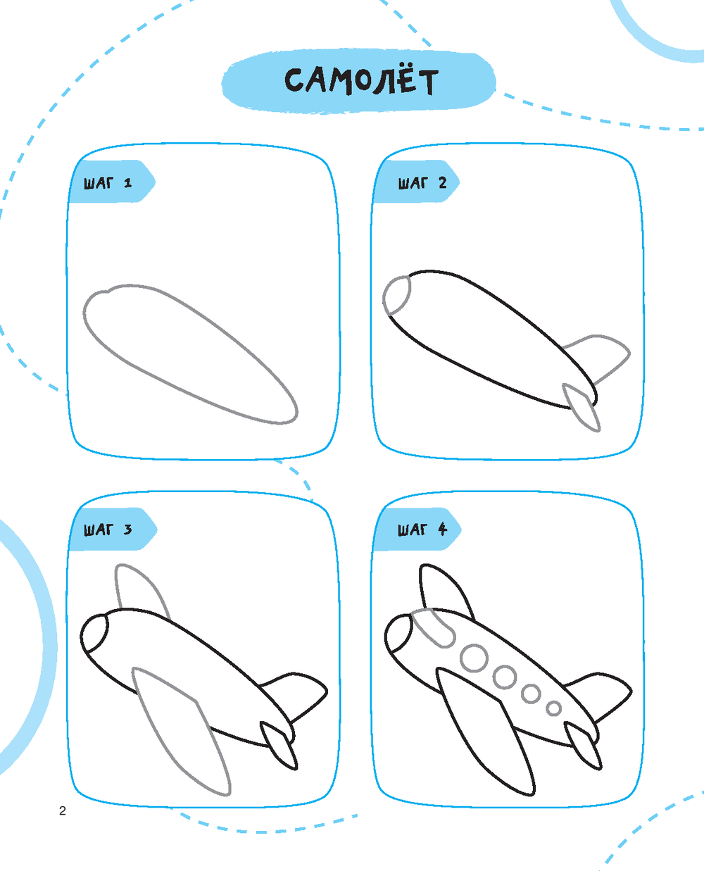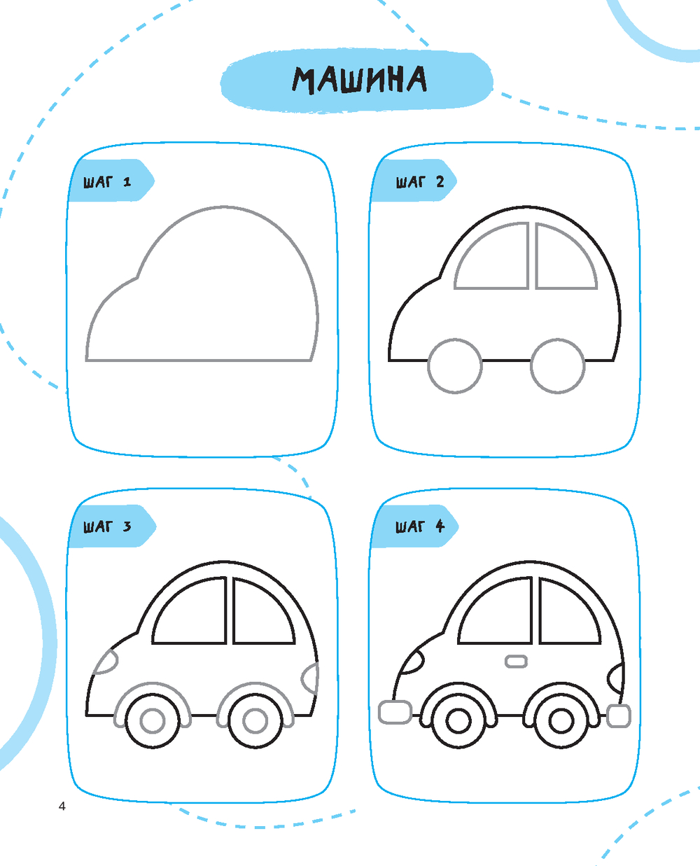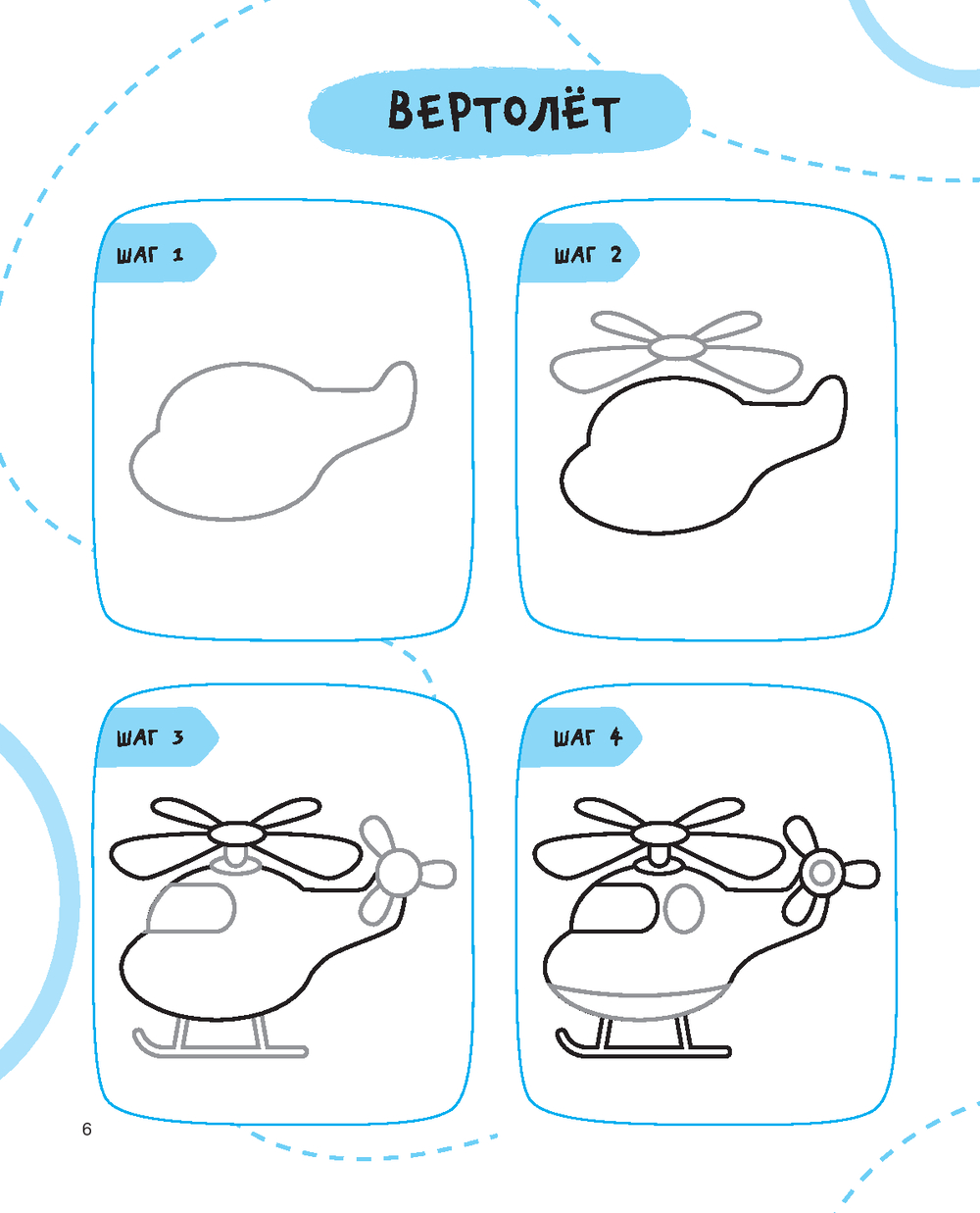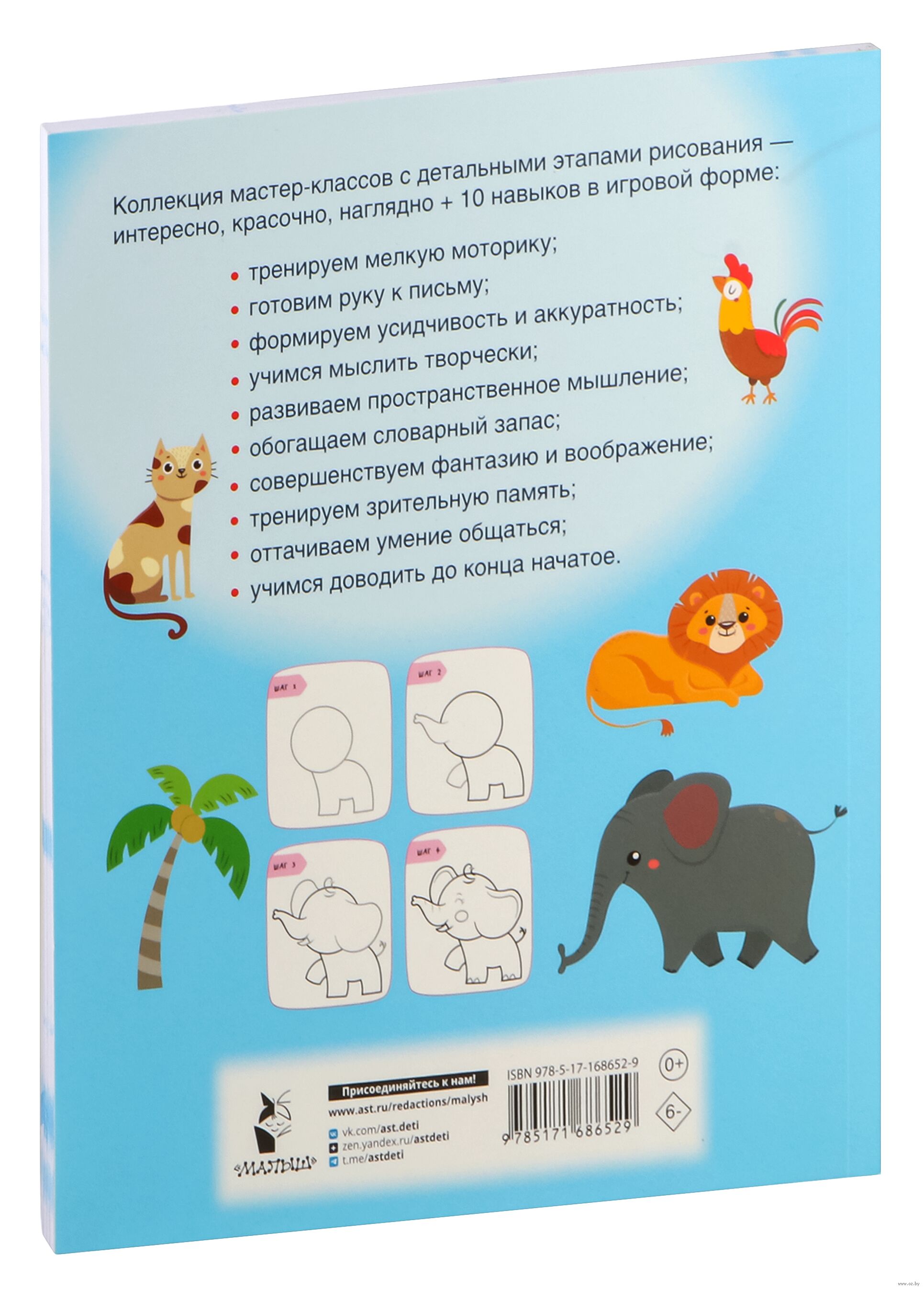 С первых страниц маленький художник поймёт, как в четыре этапа нарисовать всё, что хочется, – вертолётик, кораблик, дельфина, крабика, обезьянку, пальму, ёлочку, снеговика, кошку или мышку и многое другое. А заботливые папы и мамы смогут помочь малышу в творческом начинании.