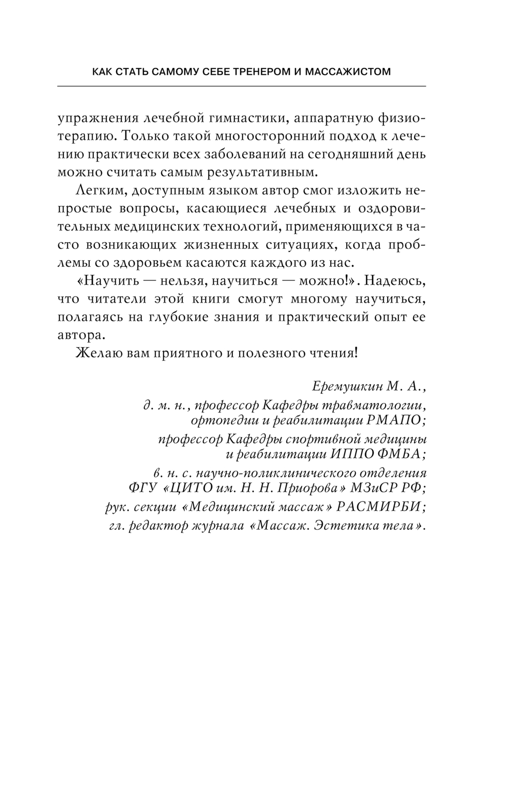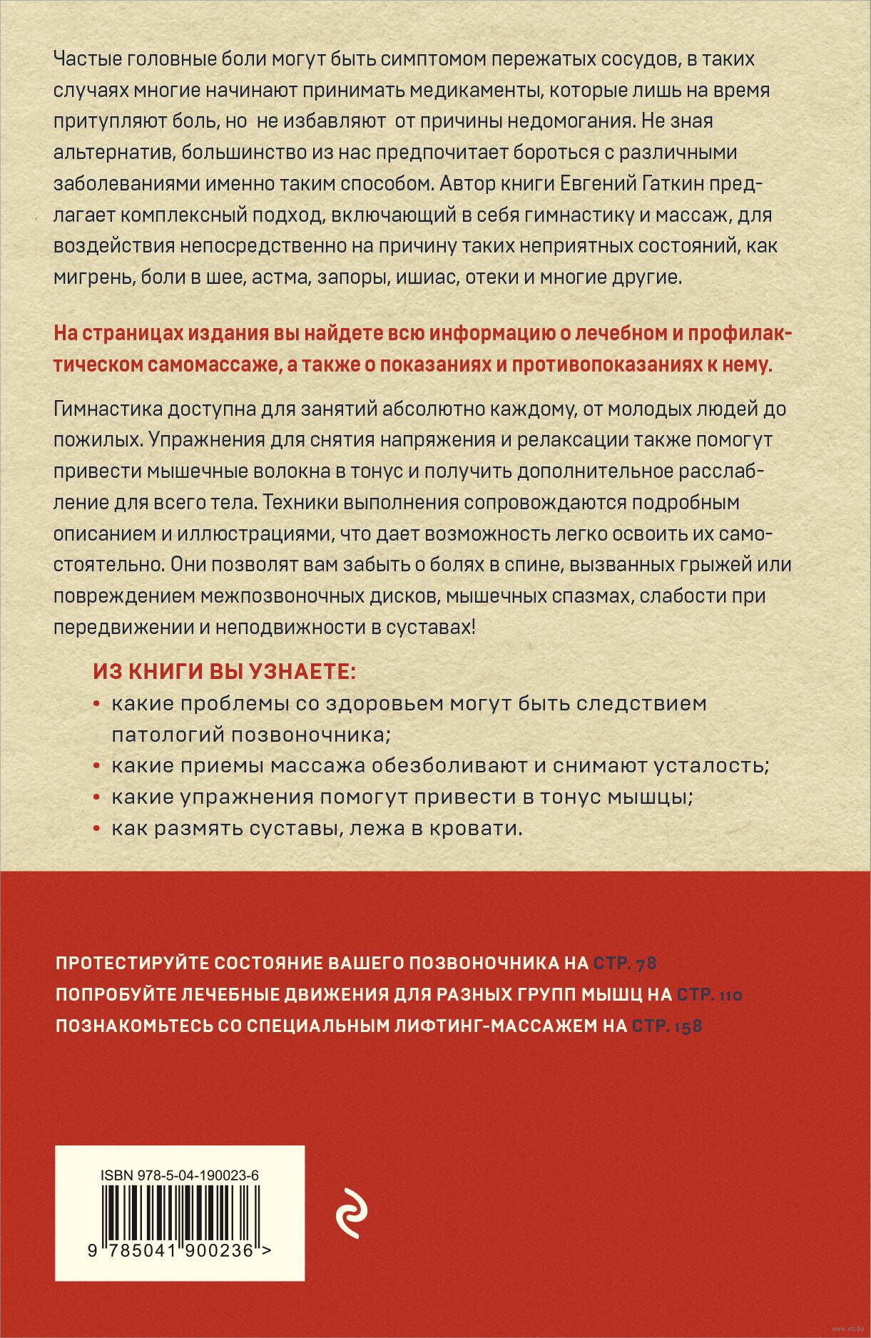 Не можете "разогнуться" с утра, вставая с кровати? Боль в спине мучает внезапными приступами и вынуждает использовать трость? Постоянные отеки и общая усталость? Автор книги уверен, чтобы избавиться от этих неприятных симптомов, нужен комплексный подход, включающий не только современные медицинские технологии, но и работу над собой. На страницах книги вы познакомитесь с техниками самомассажа и гимнастики, которые содержат специальные приемы мышечной тренировки, пассивную гимнастику и самомассаж, занятия для восстановления анатомических соотношений в позвоночнике, комплекс суставной гимнастики и лечебные ванны. Благодаря ним вы сможете укрепить мышцы без лишней нагрузки, восстановить здоровье суставов и вернуть своему телу легкость в движении. А также вы узнаете, как с помощью массажа воздействовать на нервную систему, как быстро снять дискомфорт в мышцах при перенапряжении и какие виды занятий в зависимости от поставленного диагноза подойдут именно вам.