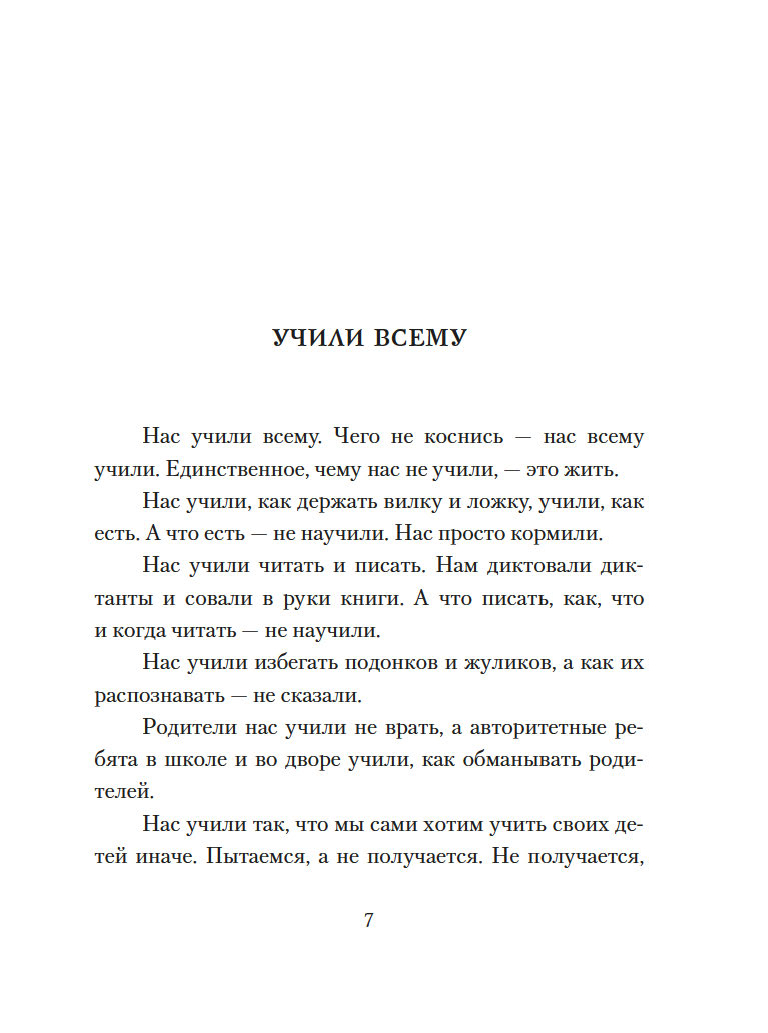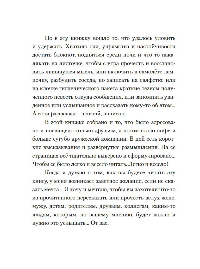 Когда я думаю о том, как вы будете читать эту книгу, у меня возникает заветное желание, если не сказать, мечта... Я хочу и мечтаю, чтобы вы захотели что-то из прочитанного пересказать или прочесть вслух жене, мужу, детям, родителям, друзьям, коллегам, каким-то людям, которым, по вашему мнению, будет важно и нужно это услышать... От вас.