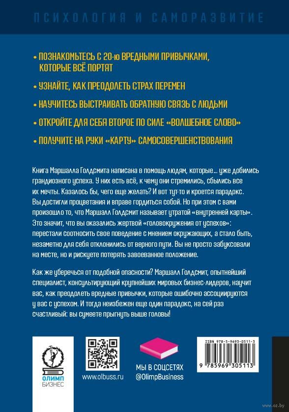 Книга Маршалла Голдсмита парадоксальна по своей сути. Она написана в помощь людям, которые... уже добились грандиозного успеха. У них есть все, к чему они стремились, сбылись все их мечты. Казалось бы, чего еще им желать? И вот тут-то и кроется парадокс. Вы достигли процветания и вправе гордиться собой. Но при этом нередко случается то, что Маршалл Голдсмит называет утратой "внутренней карты". Что это значит? Да то, что вы оказались жертвой "головокружения от успехов": вы перестали соотносить свое поведение с мнением окружающих, а стало быть, незаметно для себя отклонились от верного пути. Вы не просто забуксовали на месте, но и рискуете потерять завоеванное положение...