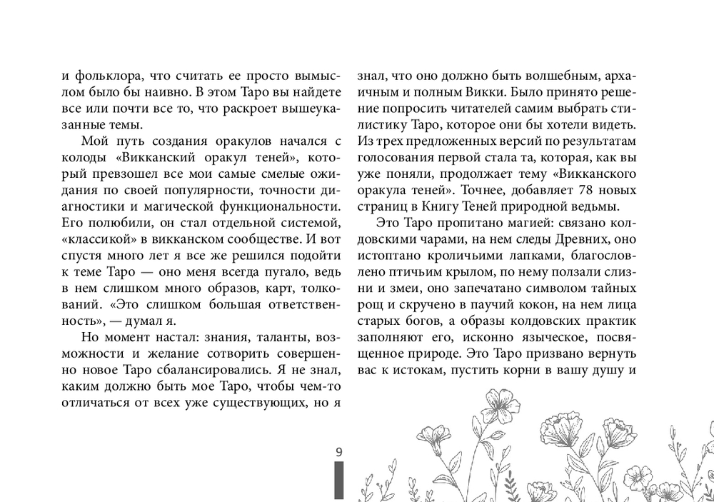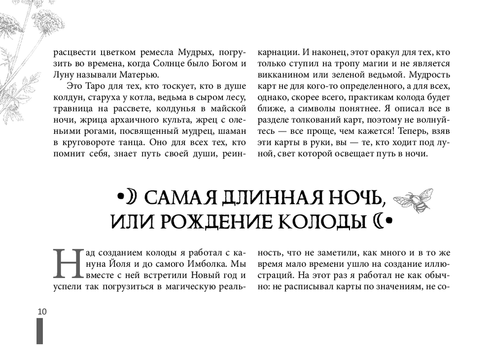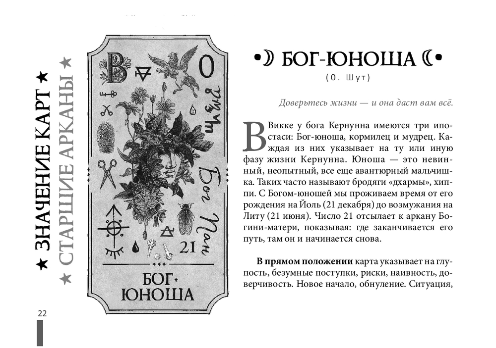 Перед вами тематическое и стилистическое продолжение бестселлера «Викканский оракул теней» от Арабо Саргсяна. В его новой колоде 22 старших аркана с оригинальными названиями и 56 младших арканов, разделенных на масти (Жезлы/Воздух, Мечи/Огонь, Кубки/Вода, Пентакли/Земля). Здесь нет традиционных пажей, рыцарей и королев. Вместо них вы встретите стихийных духов, ведьм стихий и знаменитых практиков Викки: травницу, целителя, ведьму-одиночку и других.