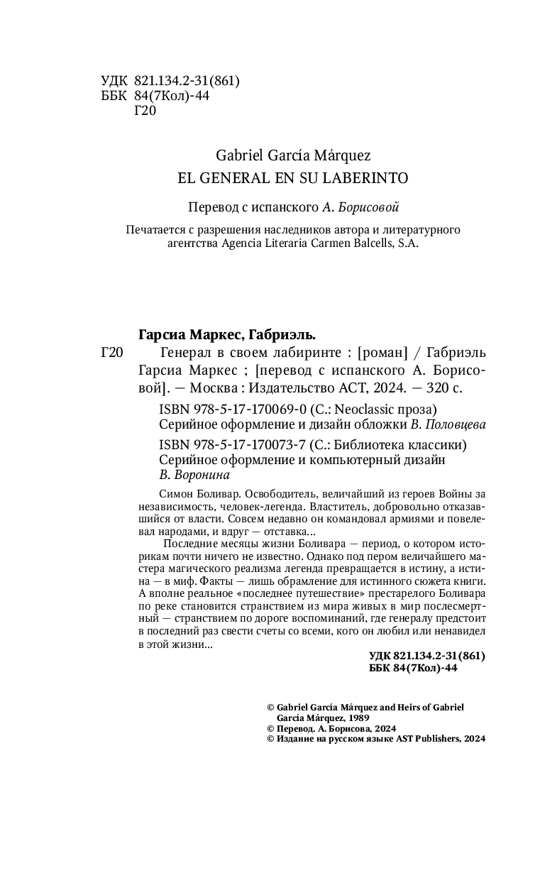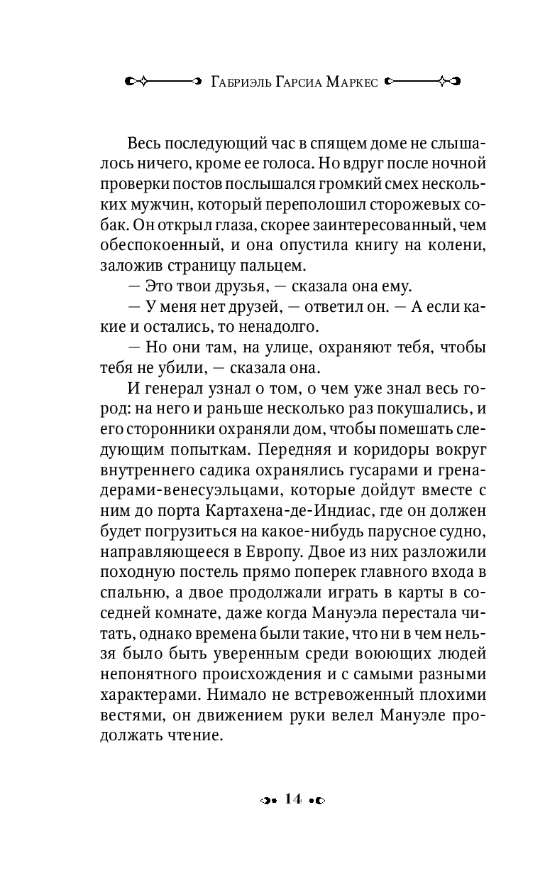 Симон Боливар. Освободитель, величайший из героев войны за независимость, человек-легенда. Властитель, добровольно отказавшийся от власти. Совсем недавно он командовал армиями и повелевал народами и вдруг – отставка…Последние месяцы жизни Боливара — период, о котором историкам почти ничего не известно. Однако под пером величайшего мастера магического реализма легенда превращается в истину, а истина – в миф. Факты – лишь обрамление для истинного сюжета книги. А вполне реальное "последнее путешествие" престарелого Боливара по реке становится странствием из мира живых в мир послесмертный – странствием по дороге воспоминаний, где генералу предстоит в последний раз свести счеты со всеми, кого он любил или ненавидел в этой жизни…