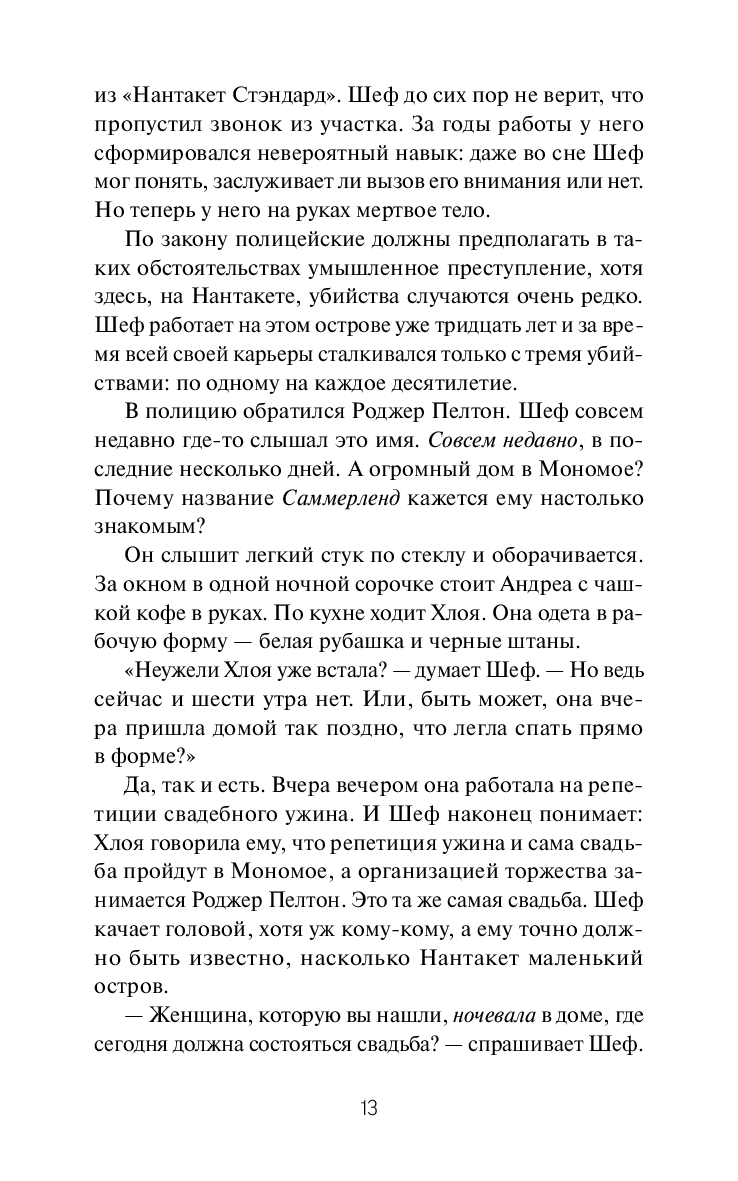 На острове Нантакет свадебный сезон. Свадьба Бенджи Уинбери и Селесты Отис обещает стать самым запоминающимся событием лета: родители жениха сказочно богаты и не пожалели денег на торжество в своем роскошном особняке на берегу океана. Но этому дню суждено оказаться незабываемым совсем по иной причине: за несколько часов до церемонии на пляже находят тело подружки невесты. Дом полон гостей, и теперь все они под подозрением. За дело берется шеф полиции Эд Капенаш. Он точно знает, что каждому из собравшихся есть что скрывать, ведь идеальных пар не существует.