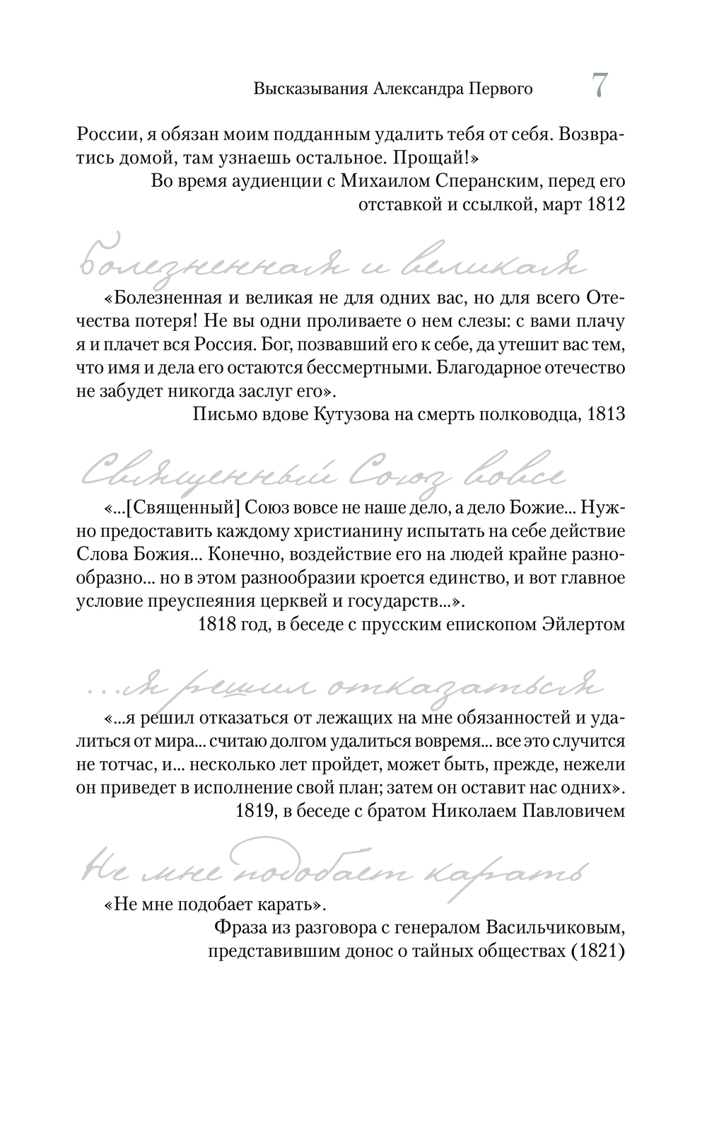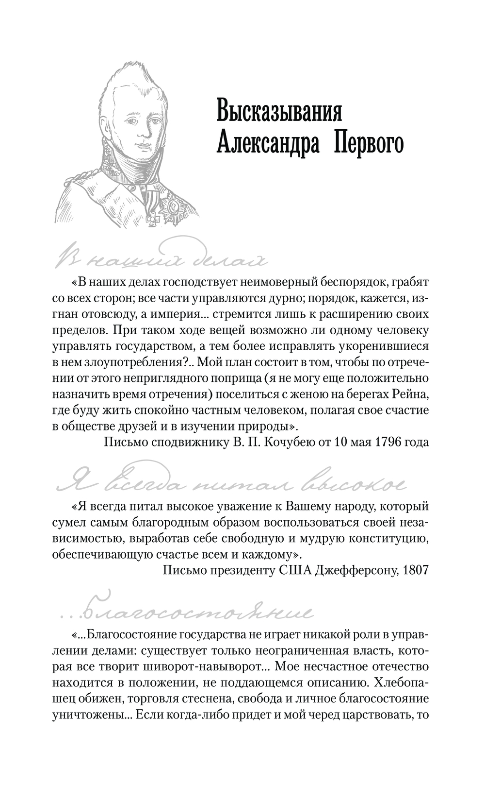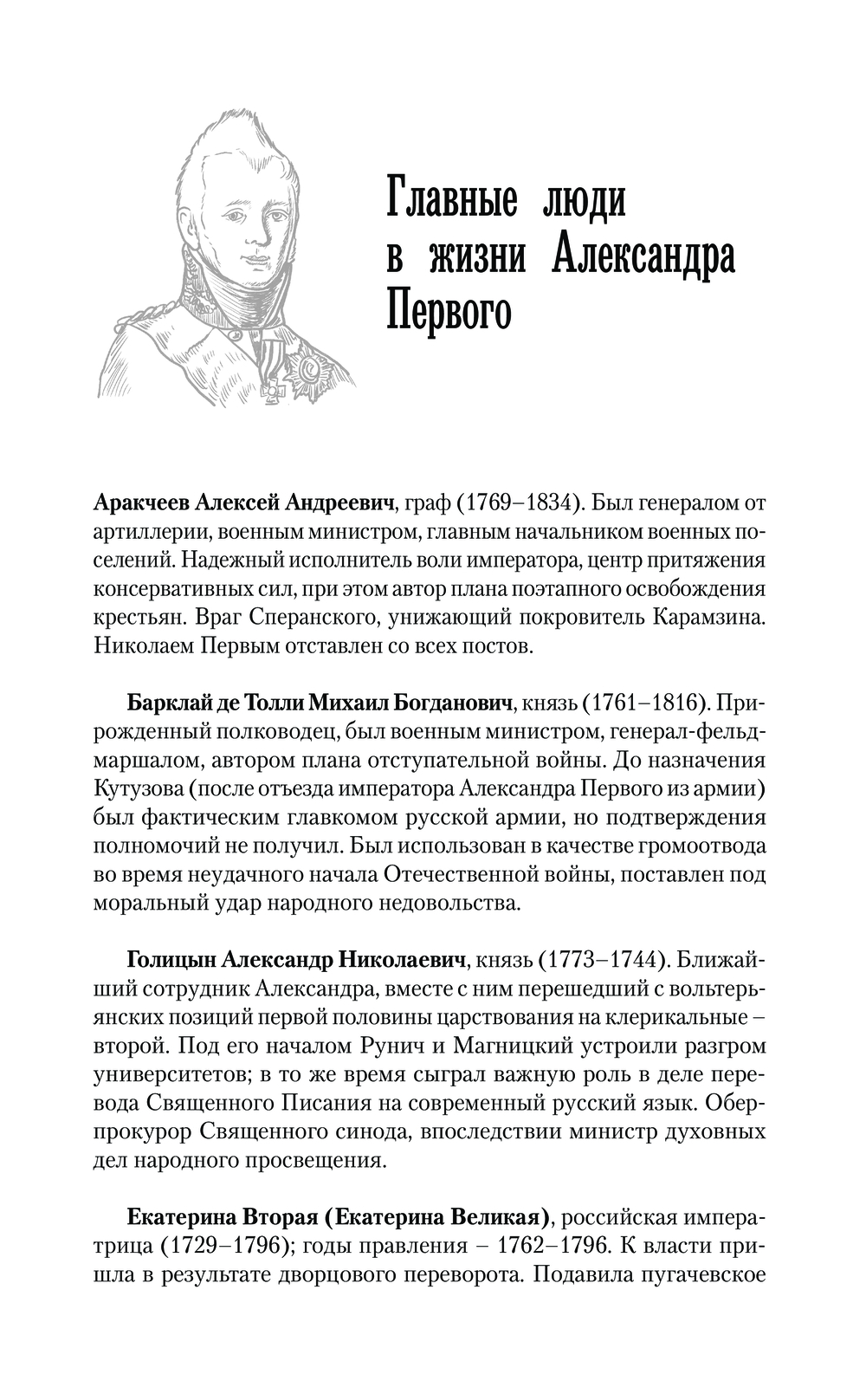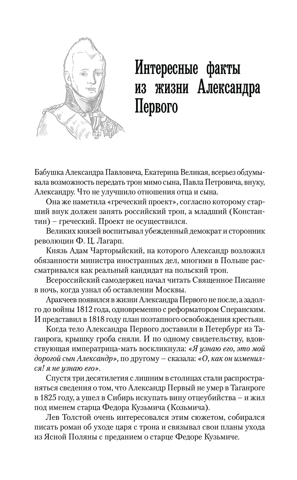 Книга Александра Архангельского рассказывает об одной из самых известных (и при этом окруженных тайной) фигур русской истории, Александре I. Вольный или невольный отцеубийца; неудачливый реформатор; либерал, опиравшийся на временщика Аракчеева; победитель Наполеона; основатель пушкинского Лицея, создатель Священного Союза европейских государей; самодержавный правитель, всю жизнь мечтавший избавиться от бремени власти и любивший ее больше жизни – эти несоединимые "лики" совместились в историческом образе Александра I.