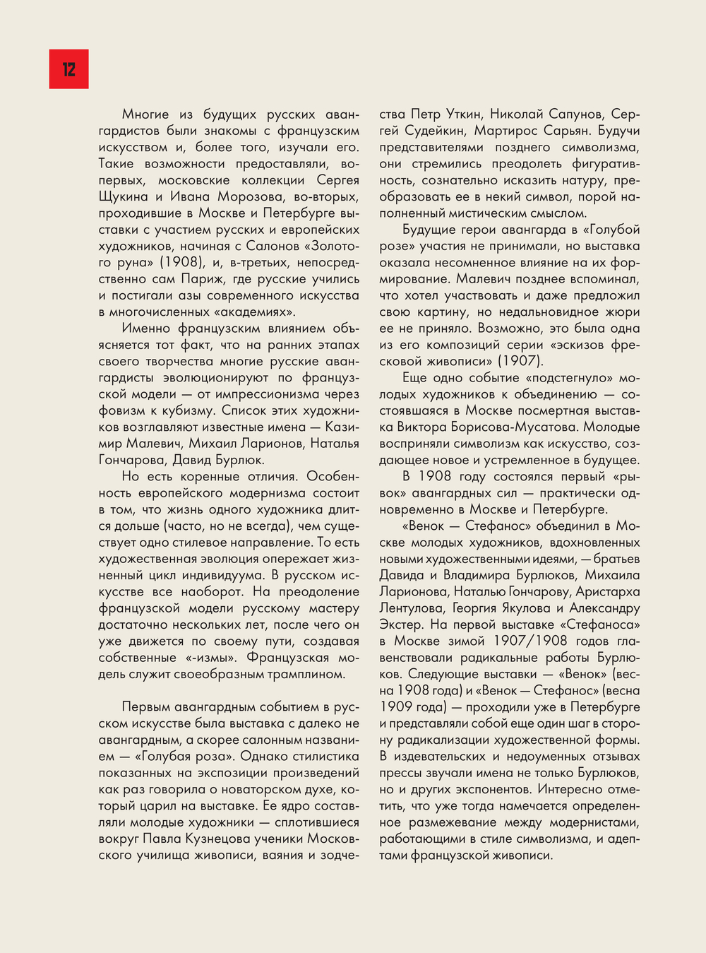 Русский авангард – уникальное, невероятно мощное и яркое явление в истории мировой культуры. Участниками этого процесса было небольшое сообщество художников, создававших в своих работах новую эстетическую реальность. Новаторы, искатели и экспериментаторы, они стали мировыми звездами, оставившими неоспоримый след в истории искусства. Среди них Казимир Малевич, Михаил Ларионов, Наталья Гончарова, Василий Кандинский, Владимир Татлин, Эль Лисицкий.