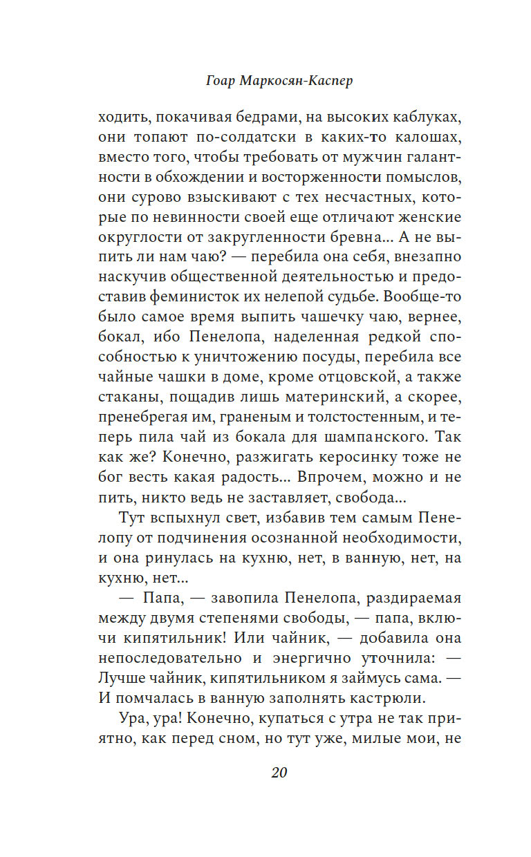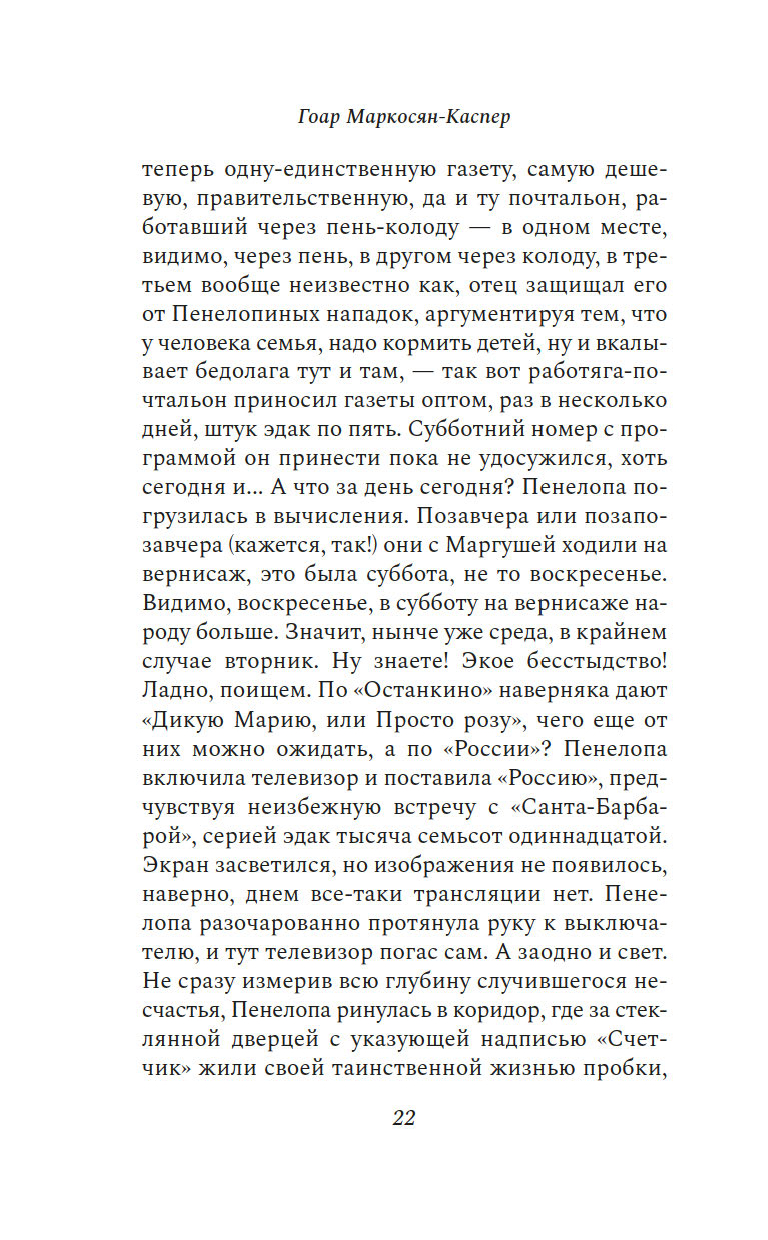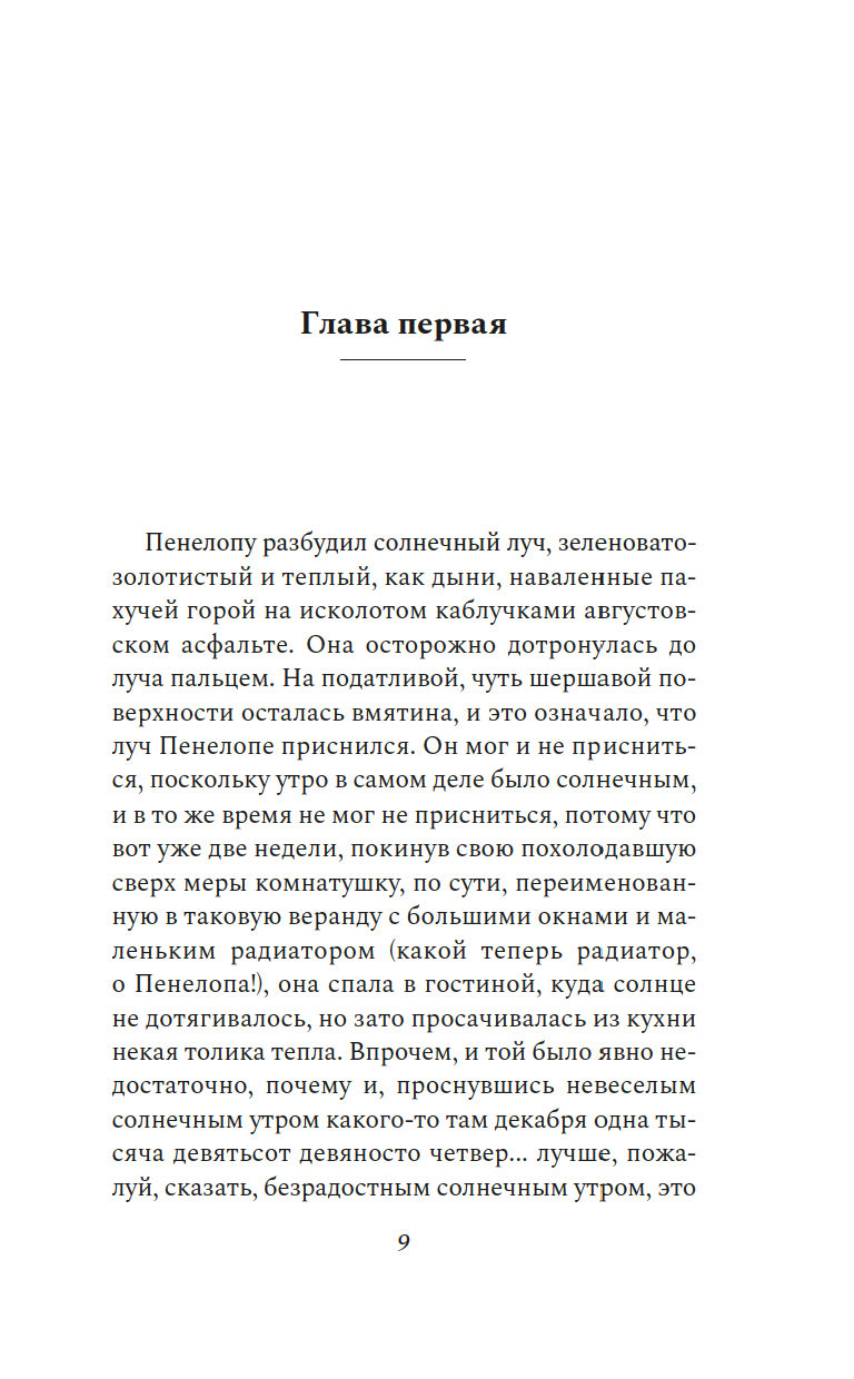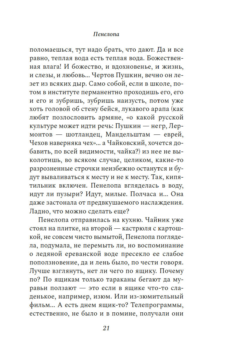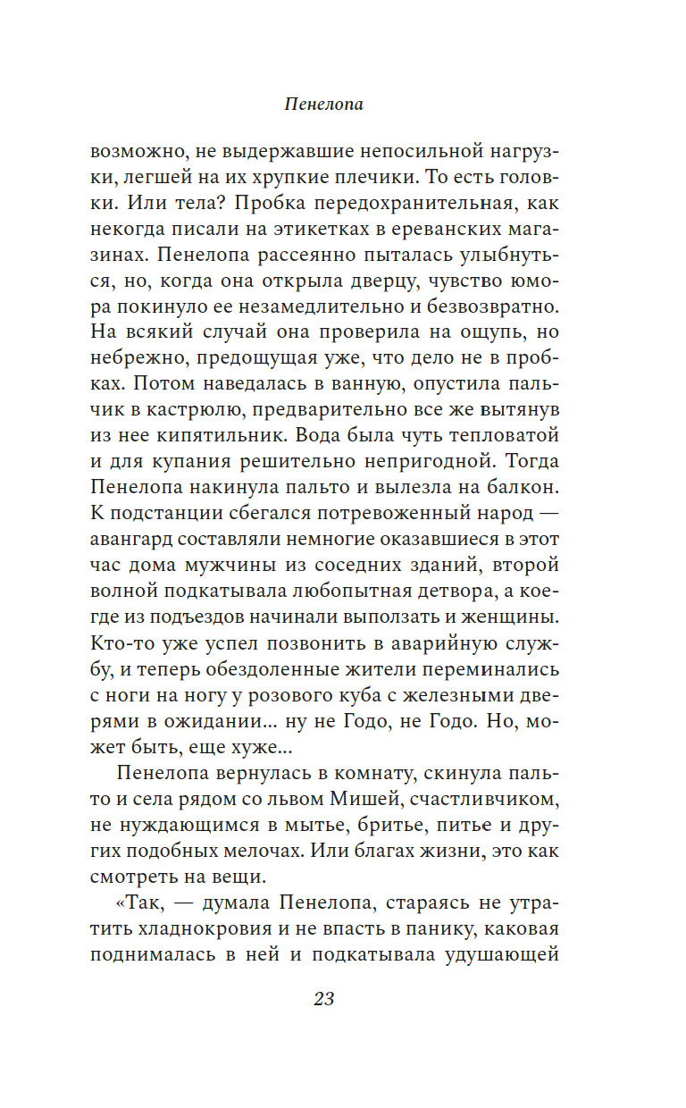 "Пенелопу разбудил солнечный луч". Так начинается этот остроумный, искрометный, полный словесной игры роман об одном дне, который нам предстоит прожить с героиней, странствуя из одного ереванского дома в другой и наслаждаясь тем теплом, которое разлито по этим страницам.
